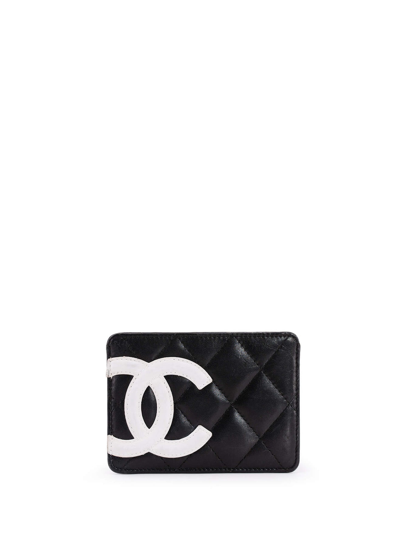 Chanel Cambon Card Holder wallet or . This Chanel wallet is in black quilted leather with a white CC logo in the left corner. The interior has 3 card slots and a bright pink lining.