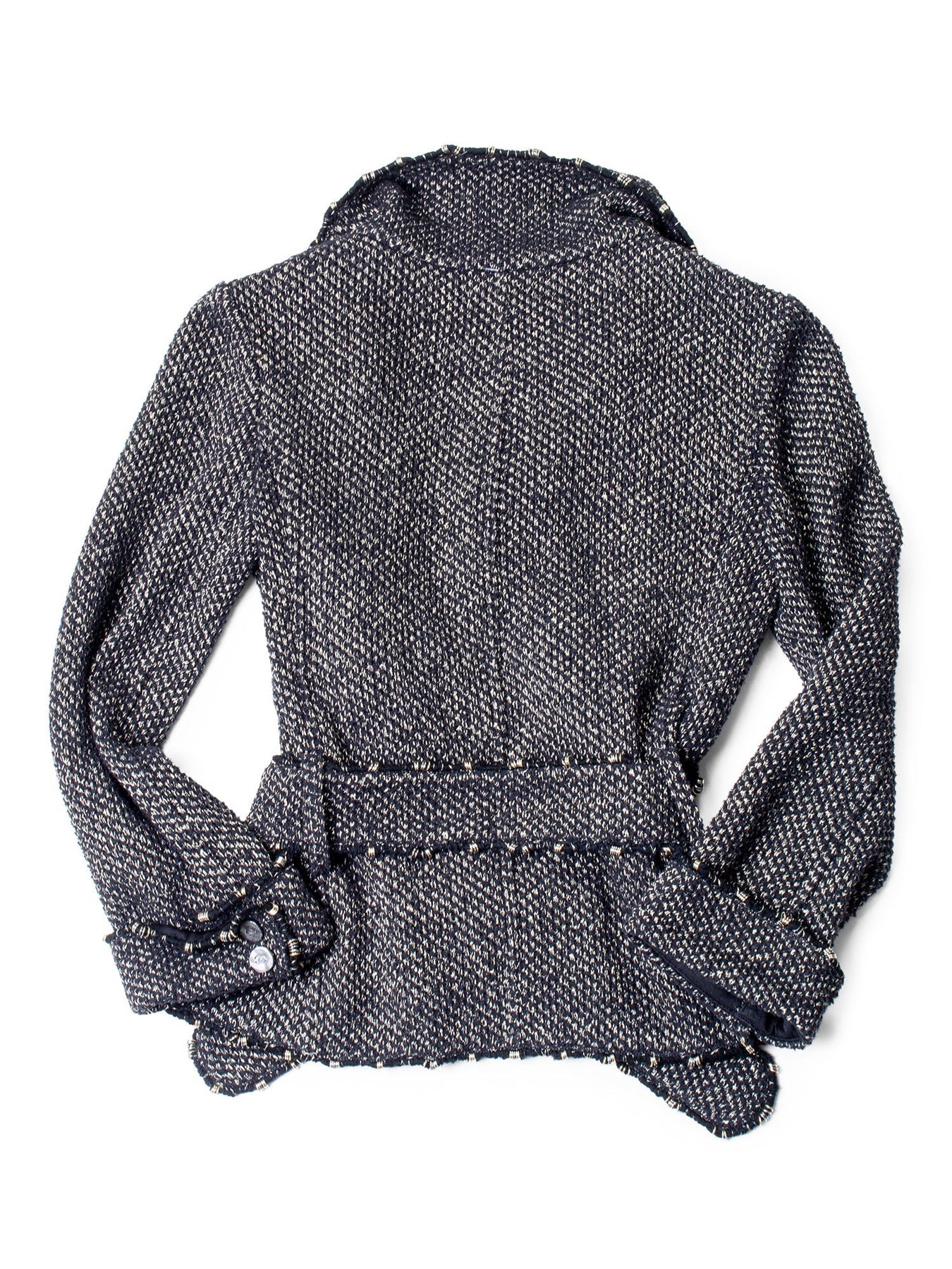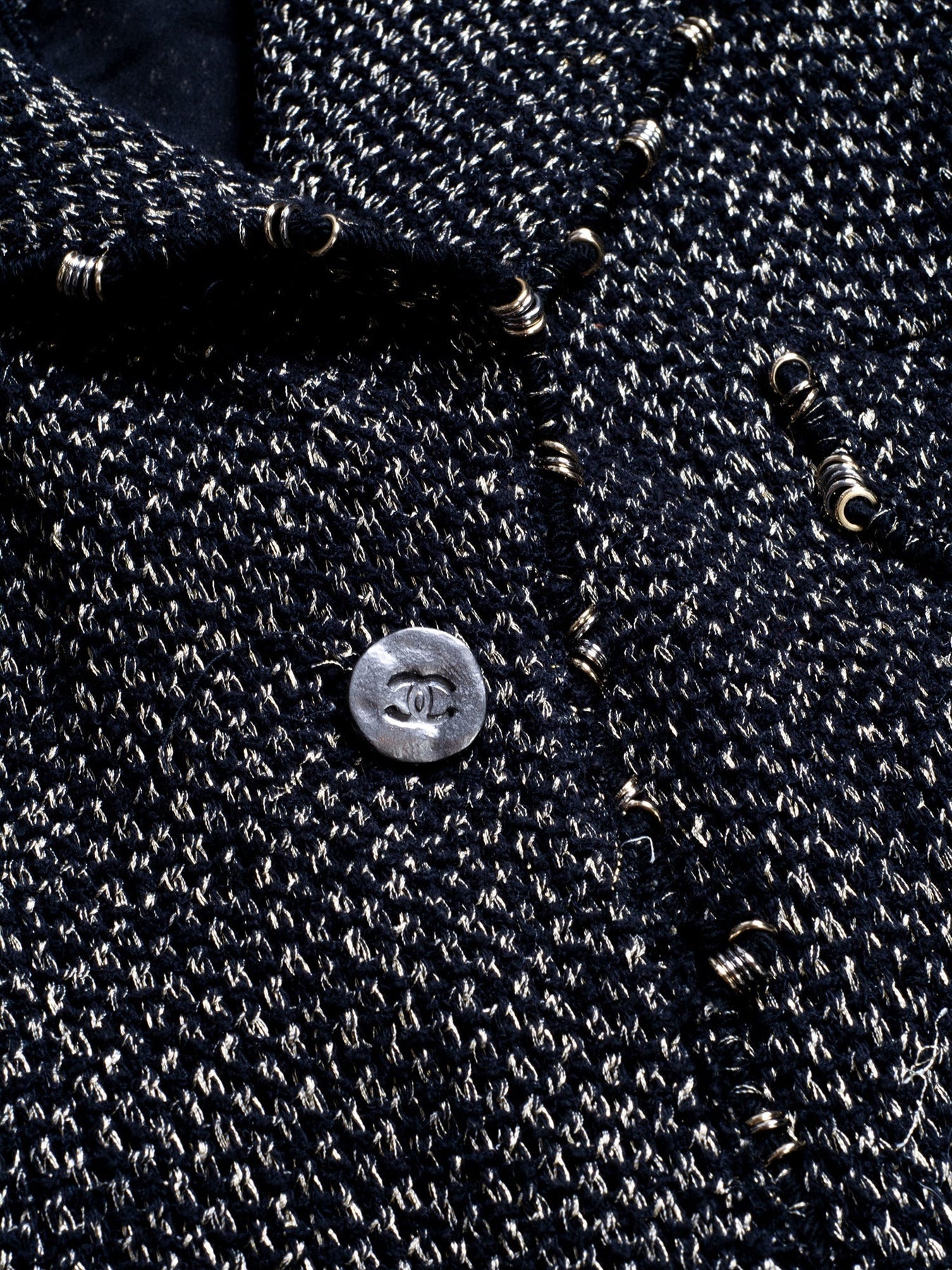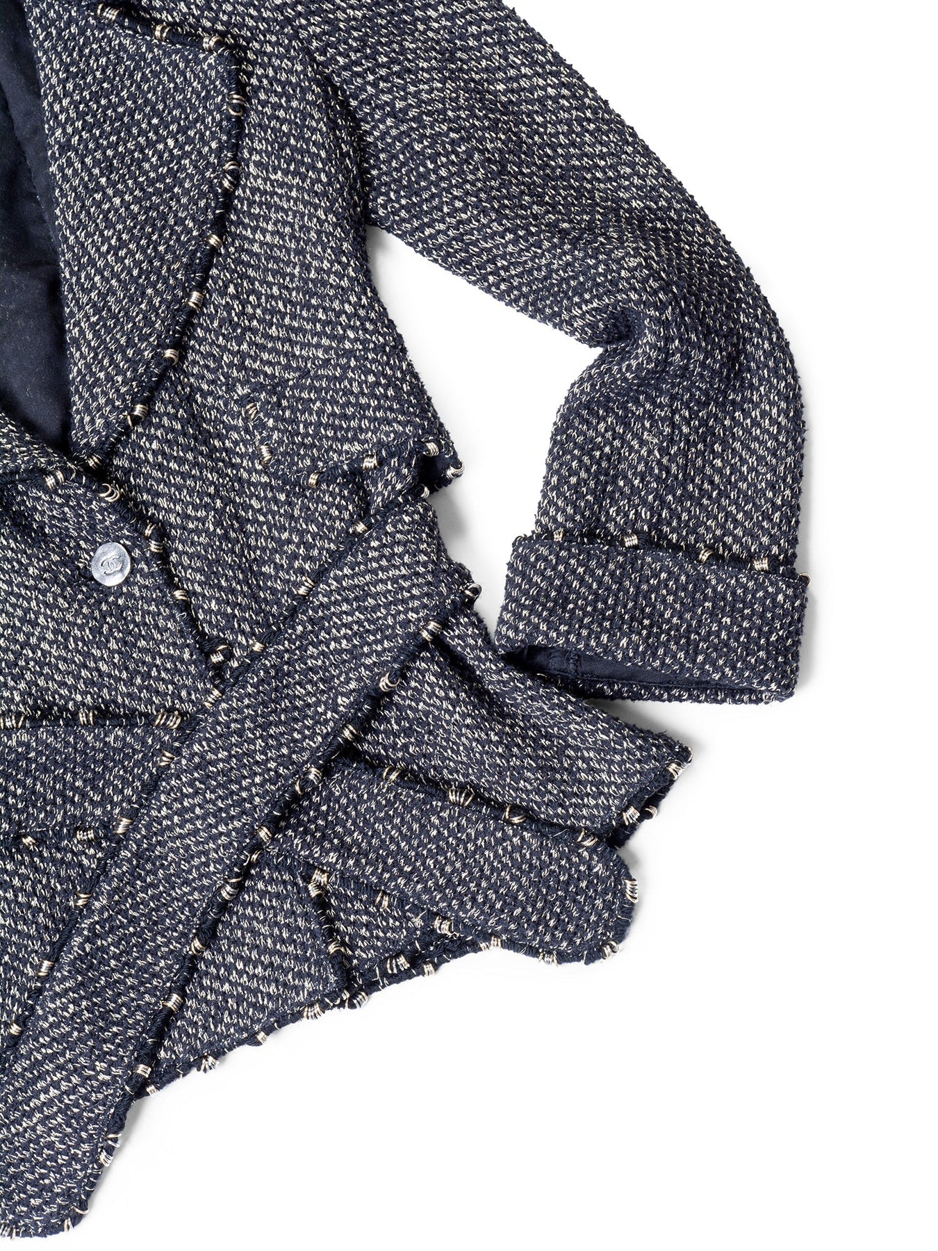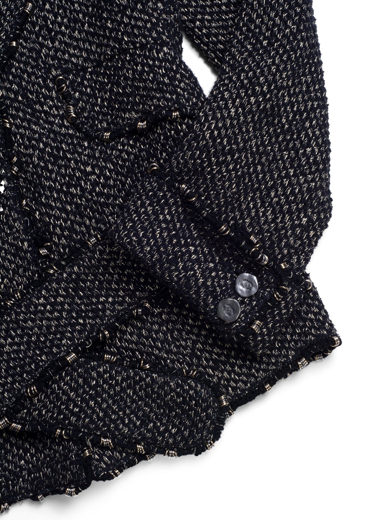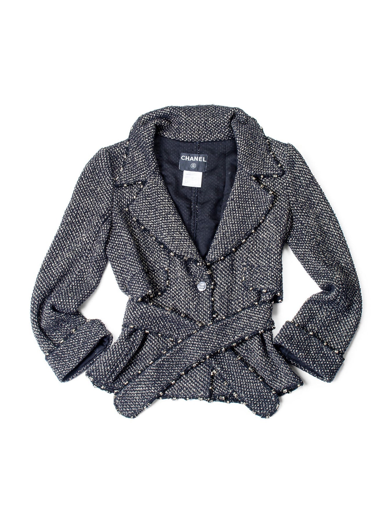Chanel Lesage Tweed Fitted Jacket from 2006 Collection or . It is in sparkly tweed fabric with metal accented fringe throughout, featuring CC logo buttons, two front pockets, sleeve cuffs and a belt.  Made in France.