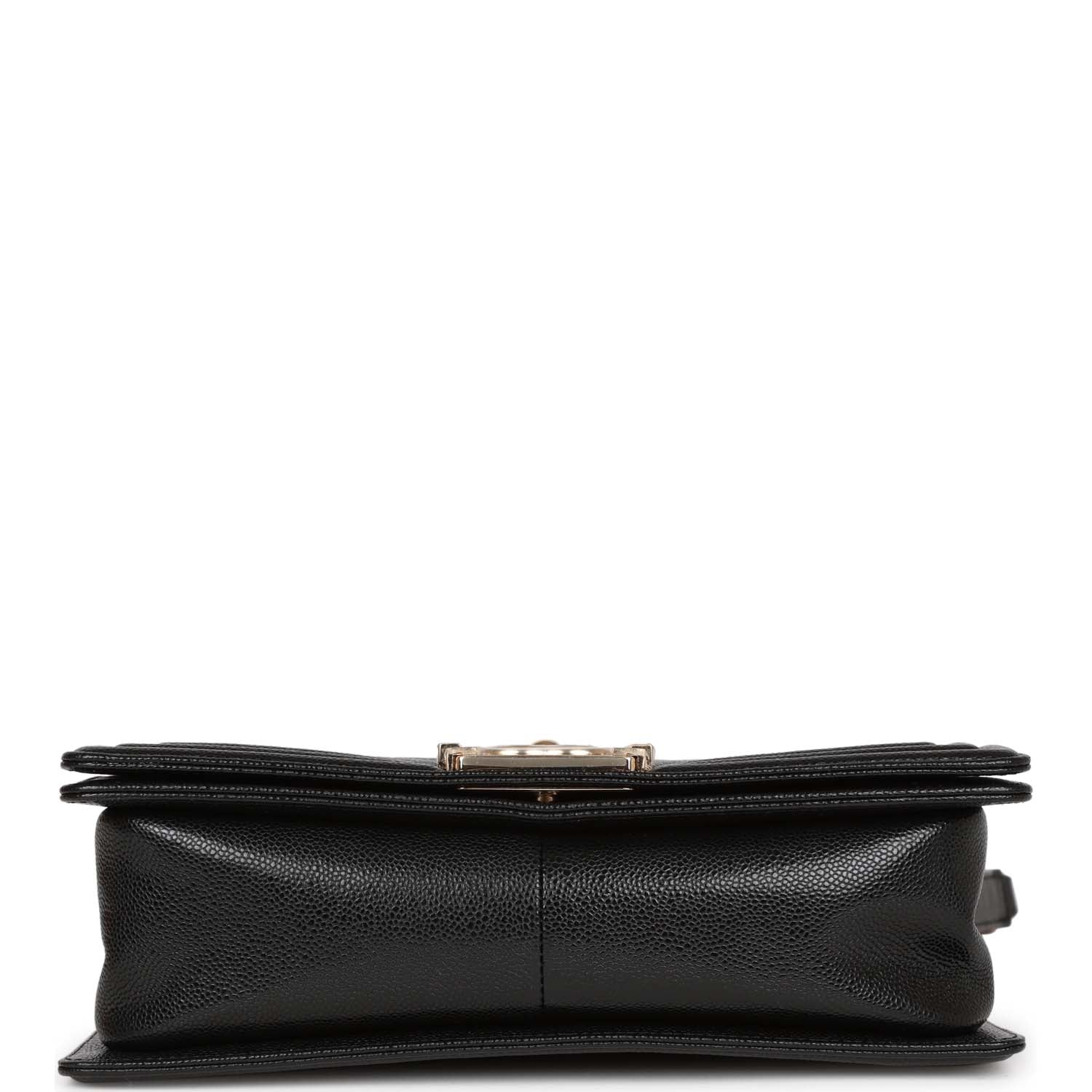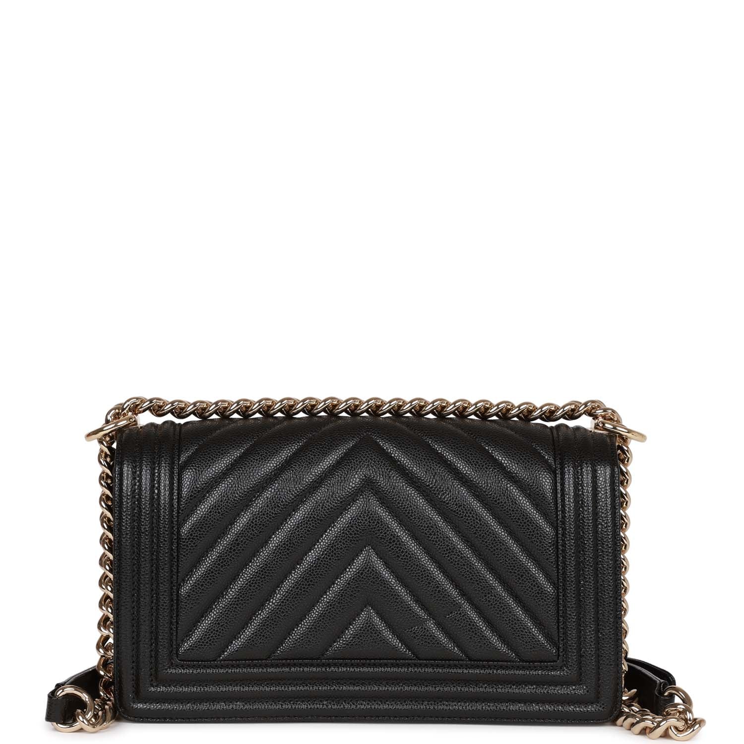 This Old Medium Boy bag is in Black chevron caviar leather with light gold tone hardware and features a full front flap with the Le Boy CC push lock closure and an light gold tone chain link and black leather padded shoulder/crossbody strap.