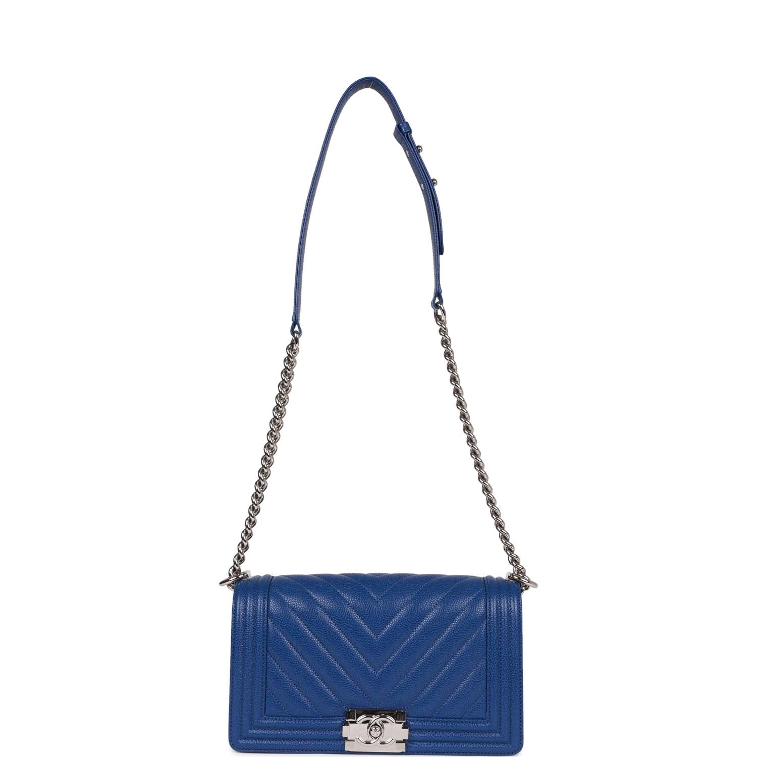 This Old Medium Boy bag is in blue chevron caviar leather with silver tone hardware and features a full front flap with the Le Boy CC push lock closure and a silver tone chain link and blue leather padded shoulder/crossbody strap.