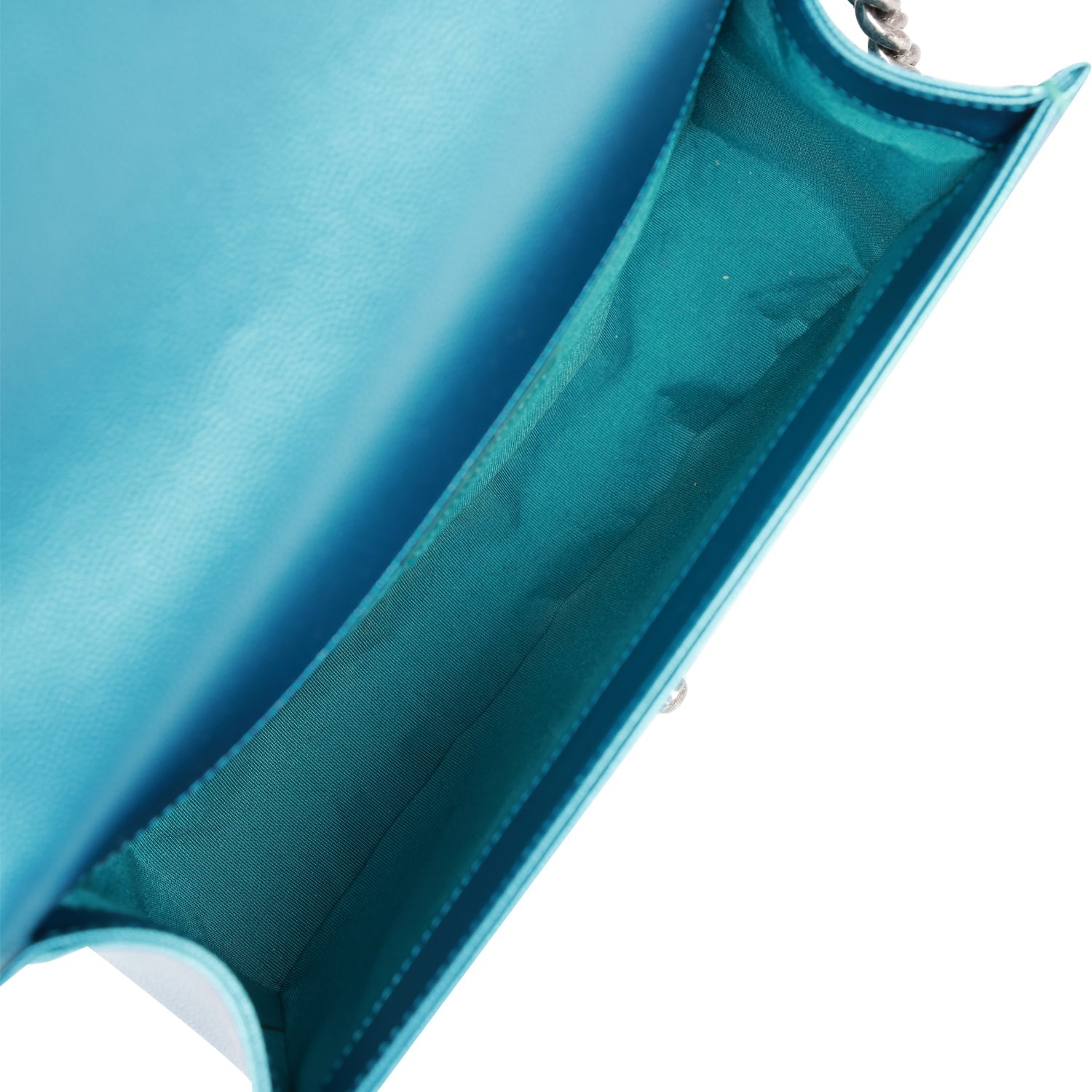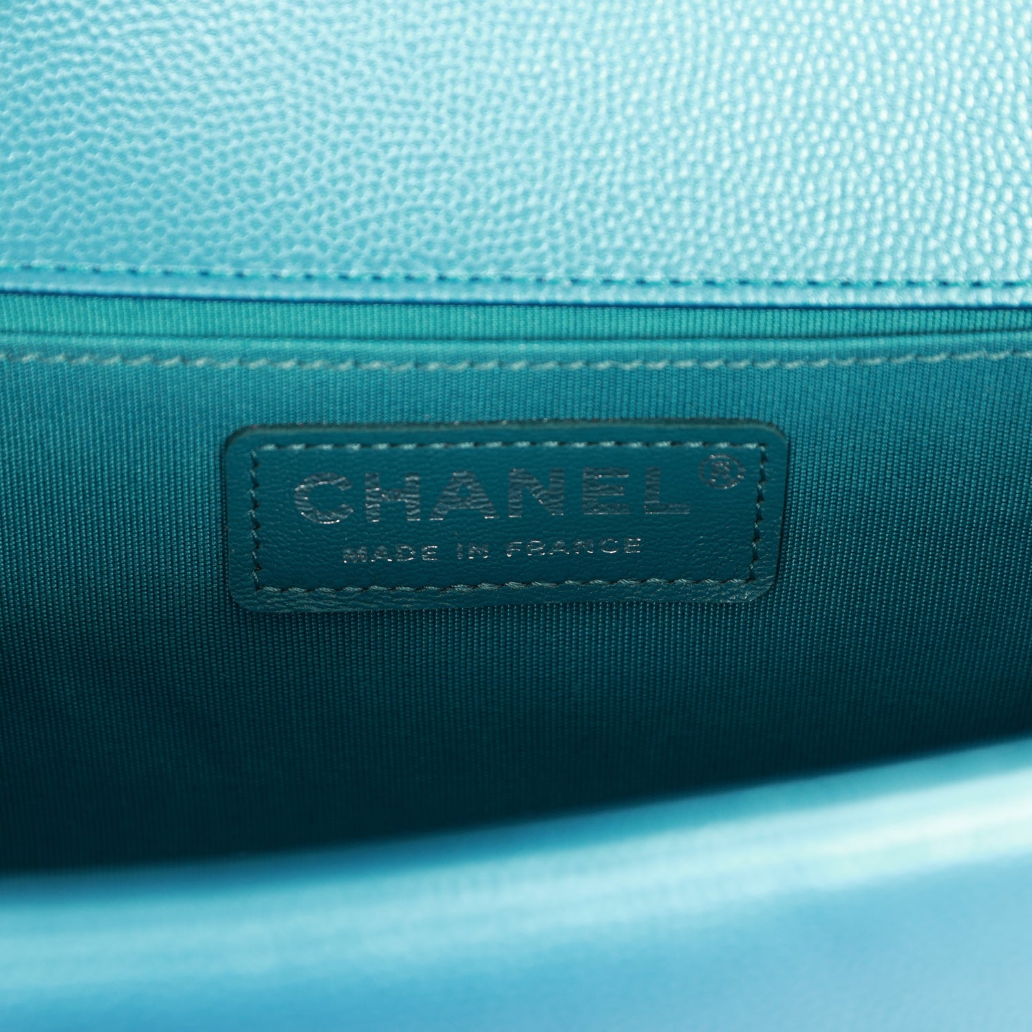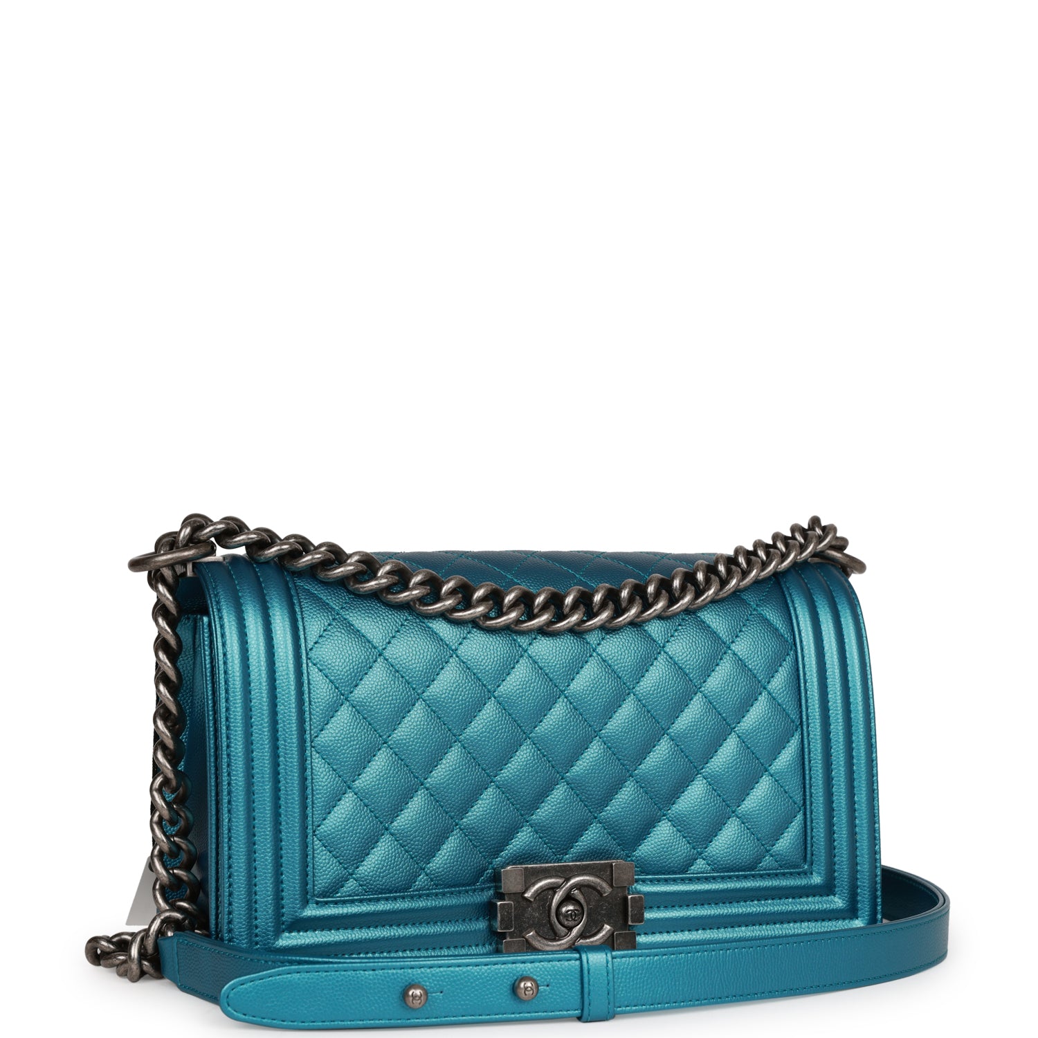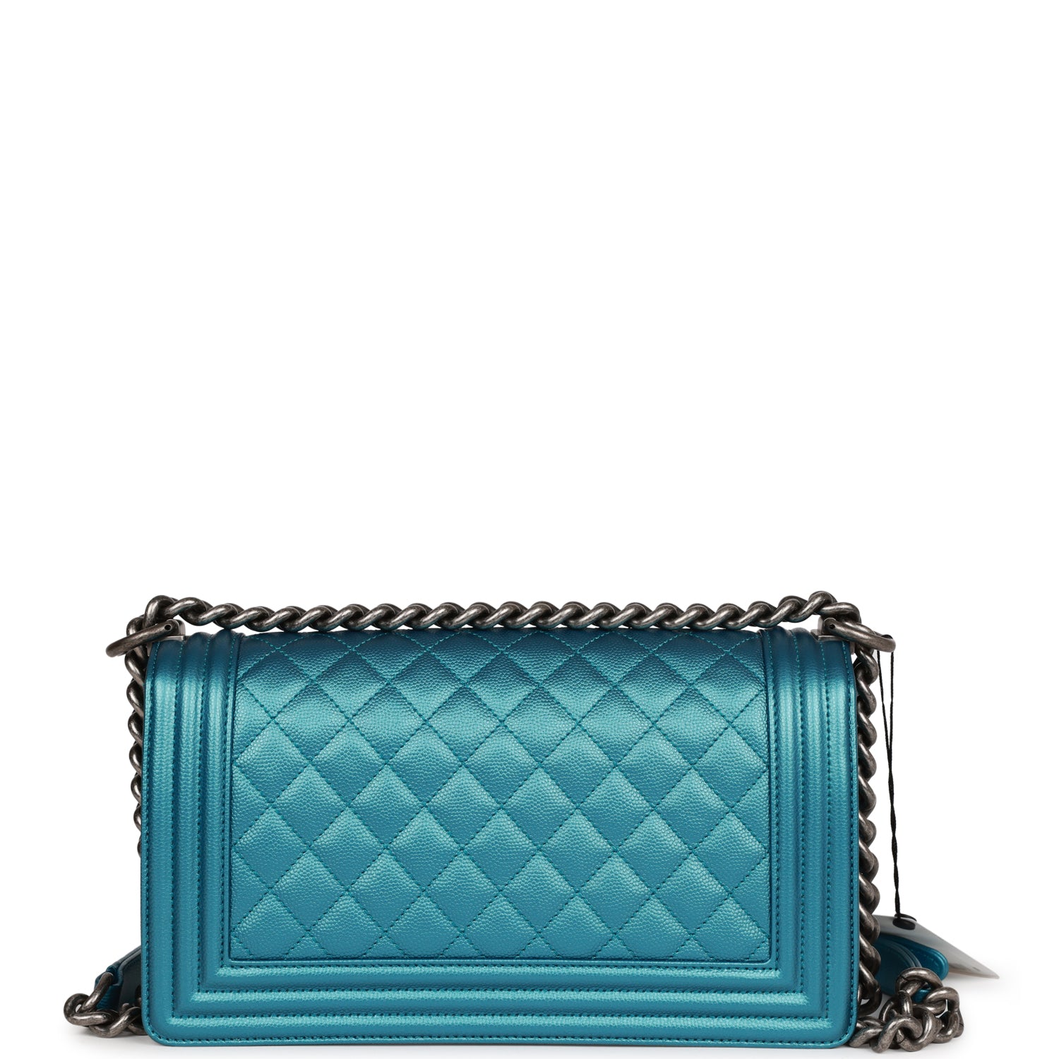 This Old Medium Boy bag is in metallic blue caviar leather with ruthenium hardware and features a full front flap with the Le Boy CC push lock closure and a ruthenium tone chain link and metallic blue leather padded shoulder/crossbody strap.