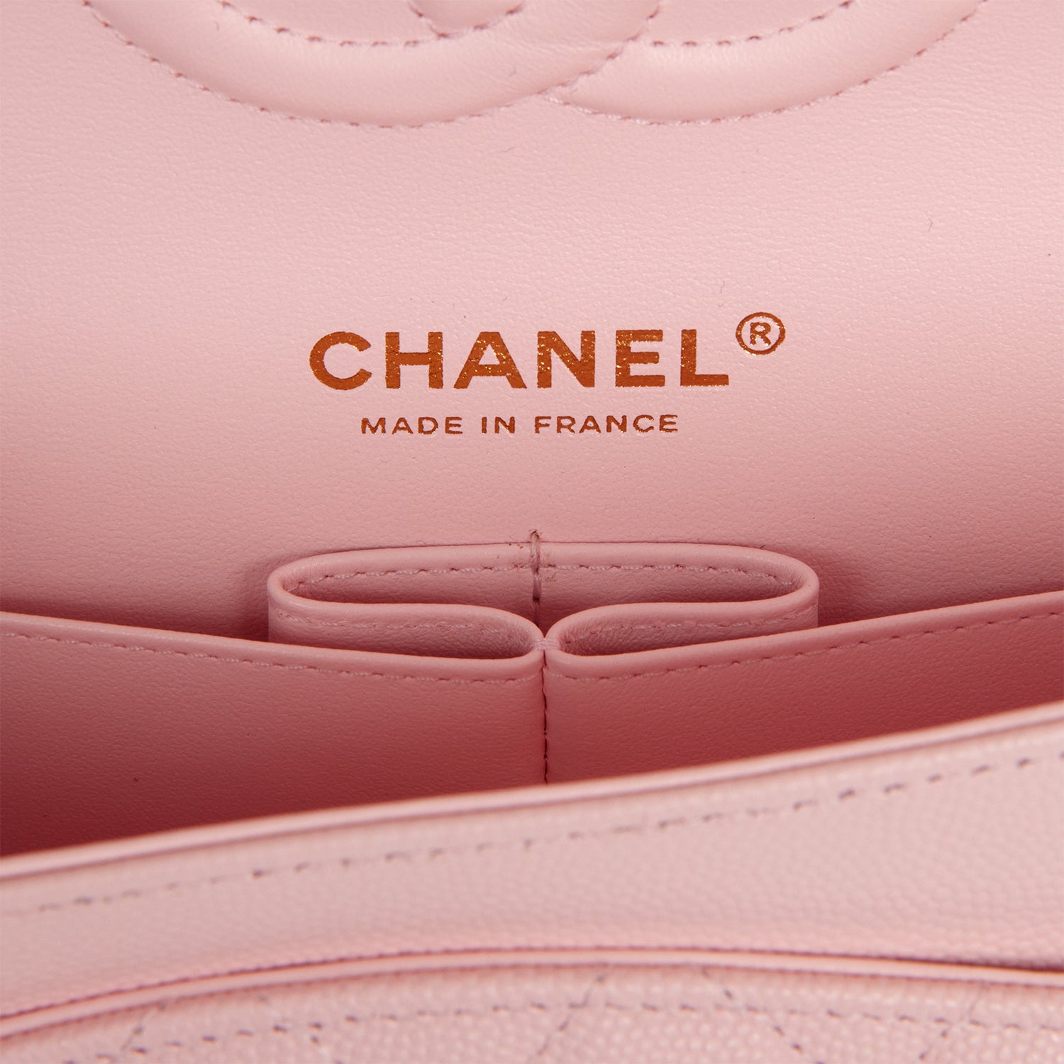 This Medium Classic Double Flap bag is in light pink caviar leather with light gold tone hardware and features a front flap with signature CC turnlock closure, half moon back pocket, and adjustable interwoven light gold tone chain link and light pink leather shoulder strap.
