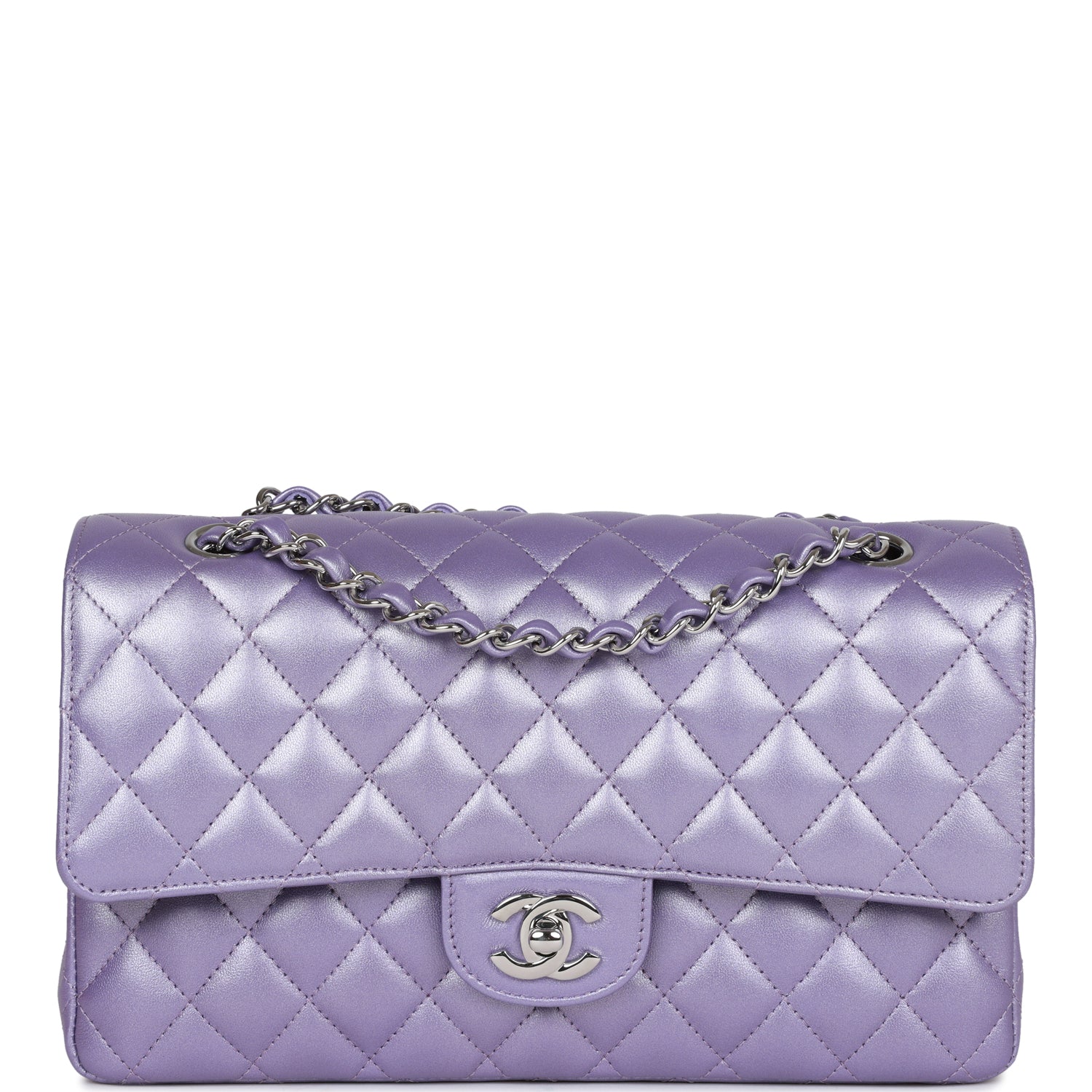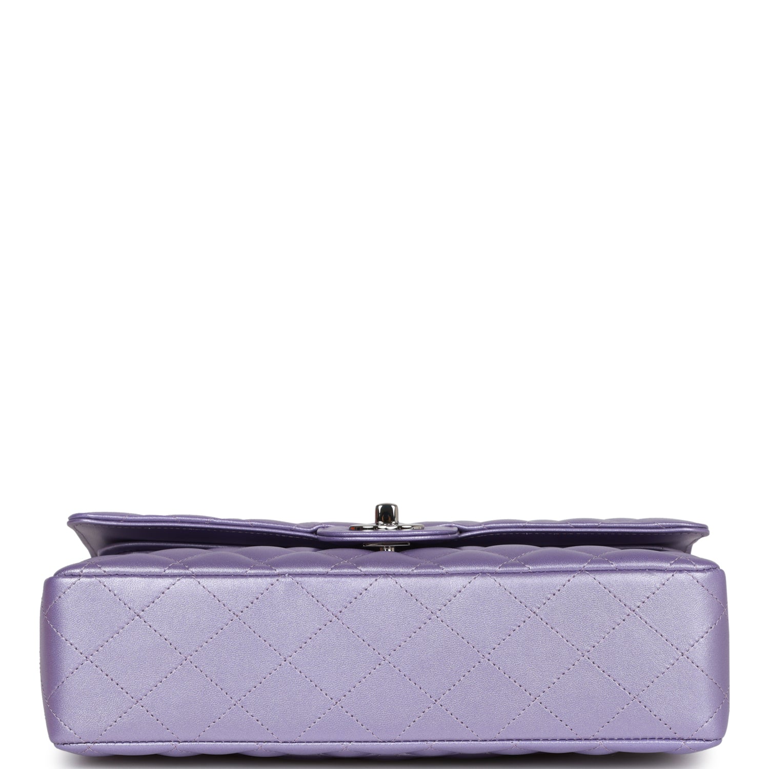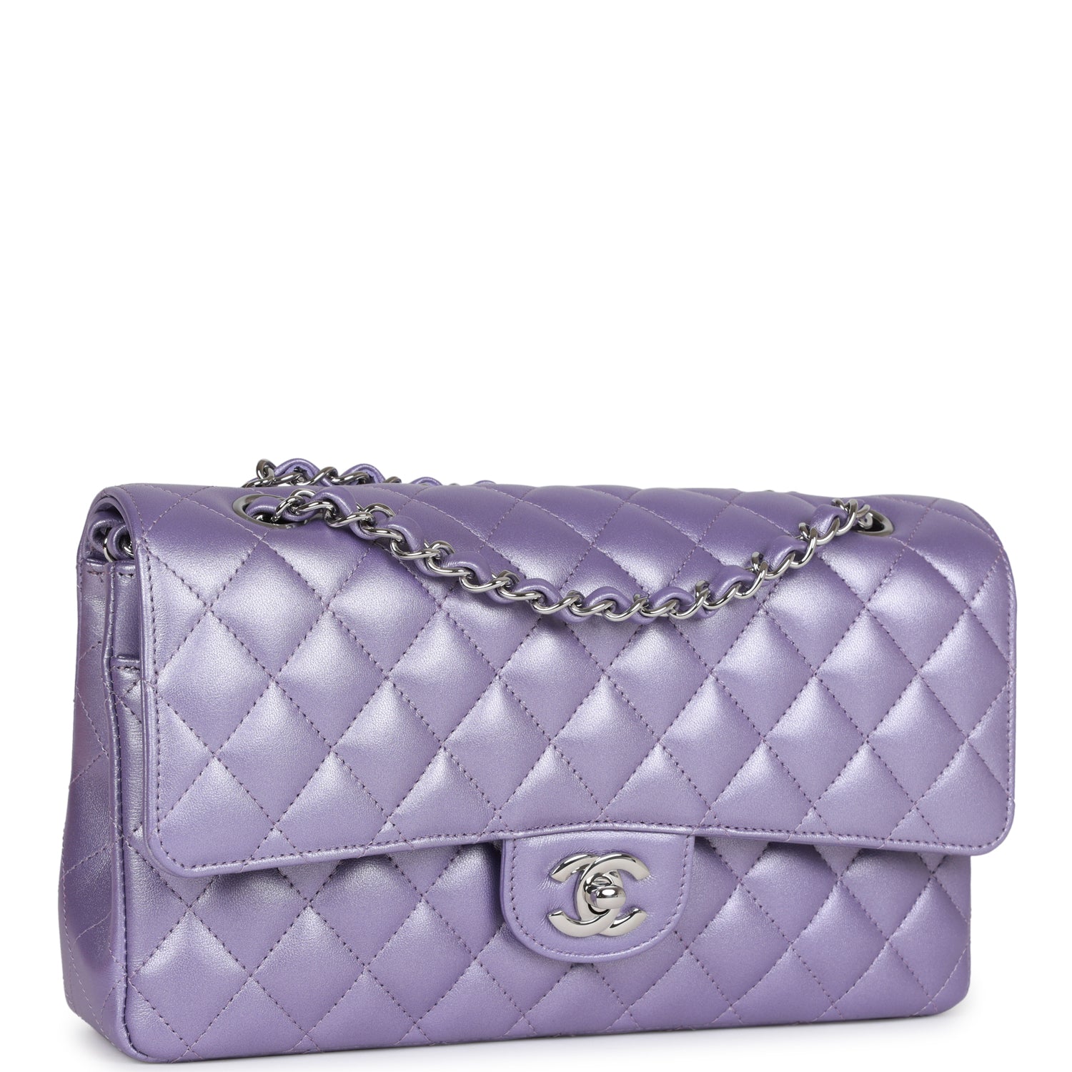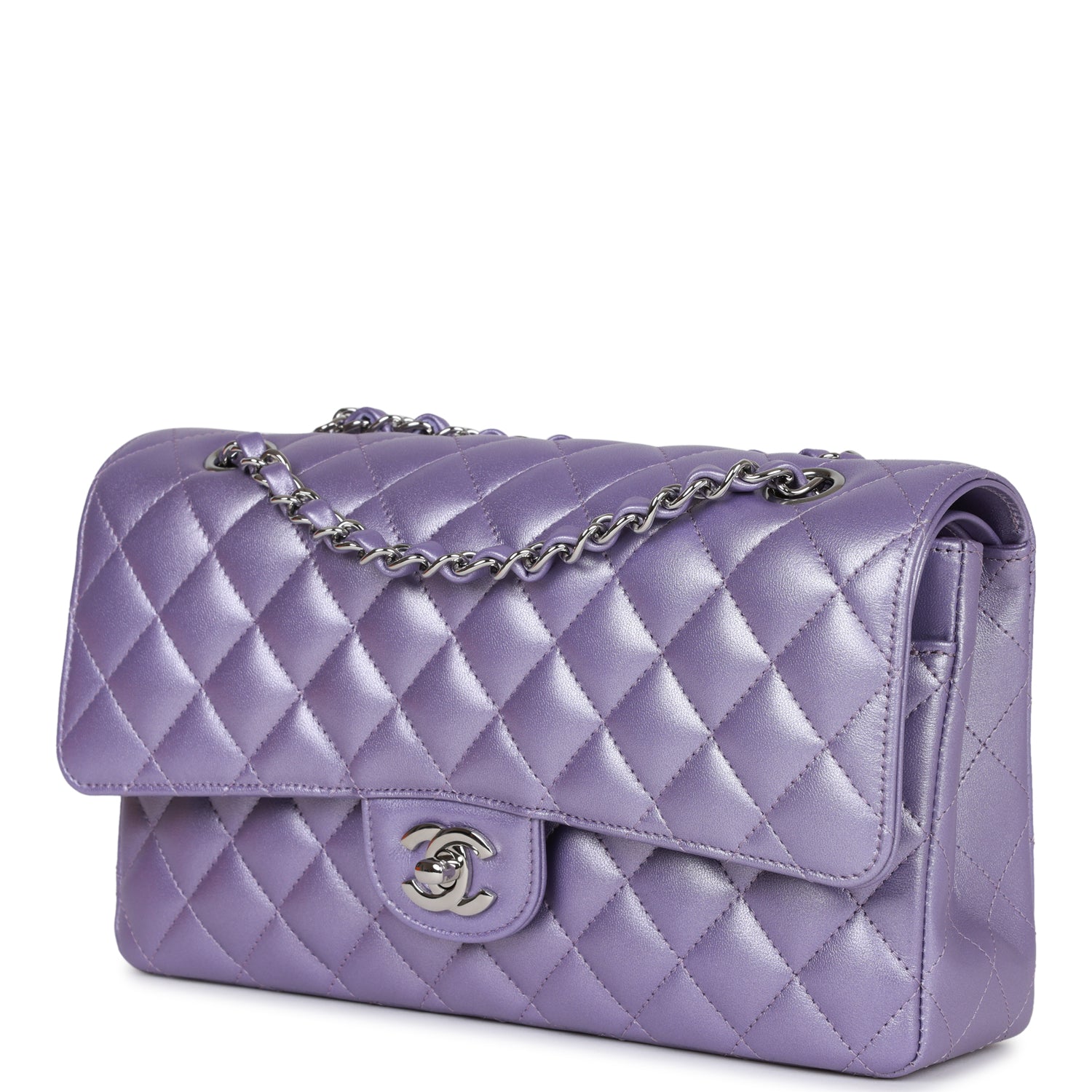 This Medium Classic Double Flap bag is in purple metallic lambskin leather with silver tone hardware and features a front flap with signature CC turnlock closure, half moon back pocket, and adjustable interwoven silver tone chain link and purple leather shoulder strap.
