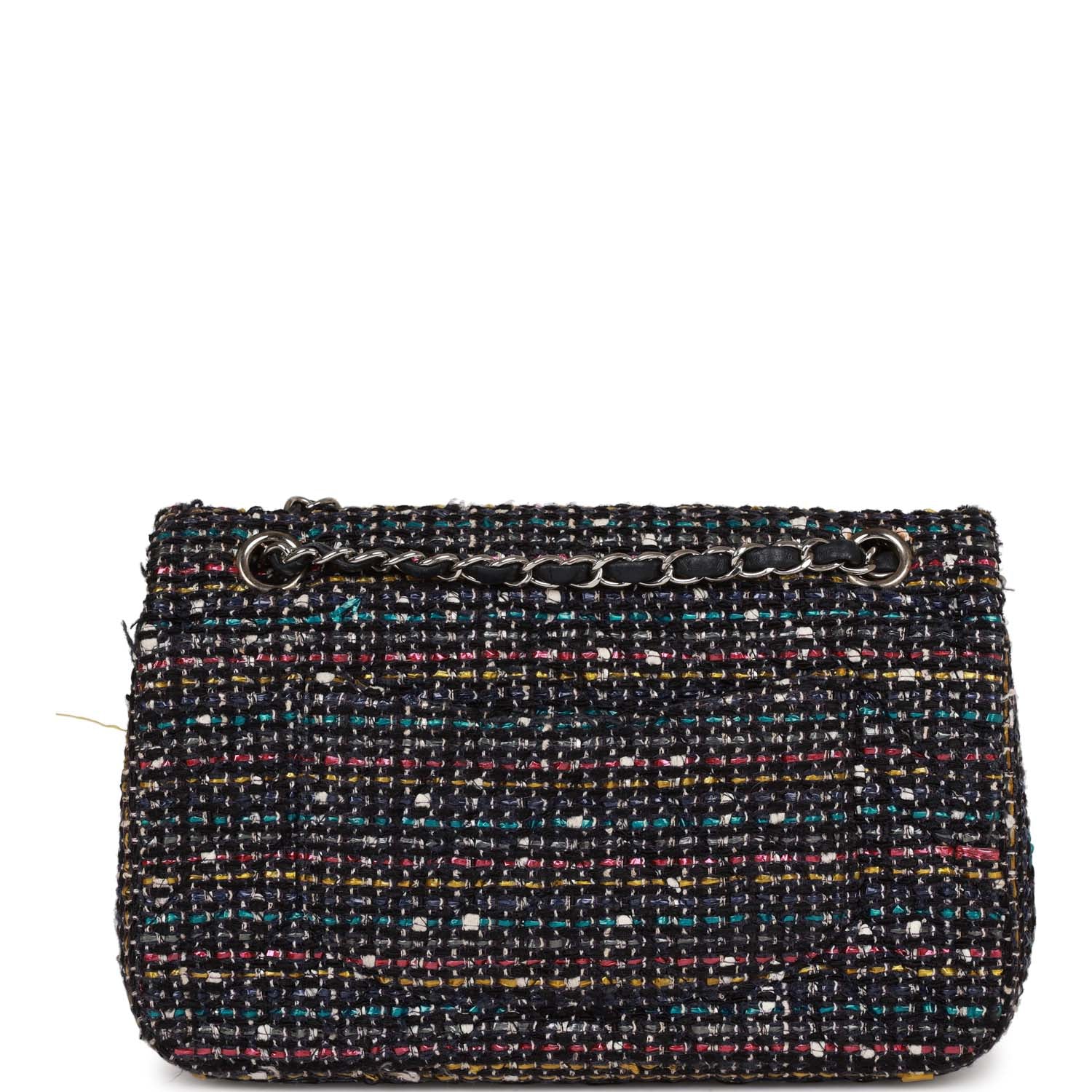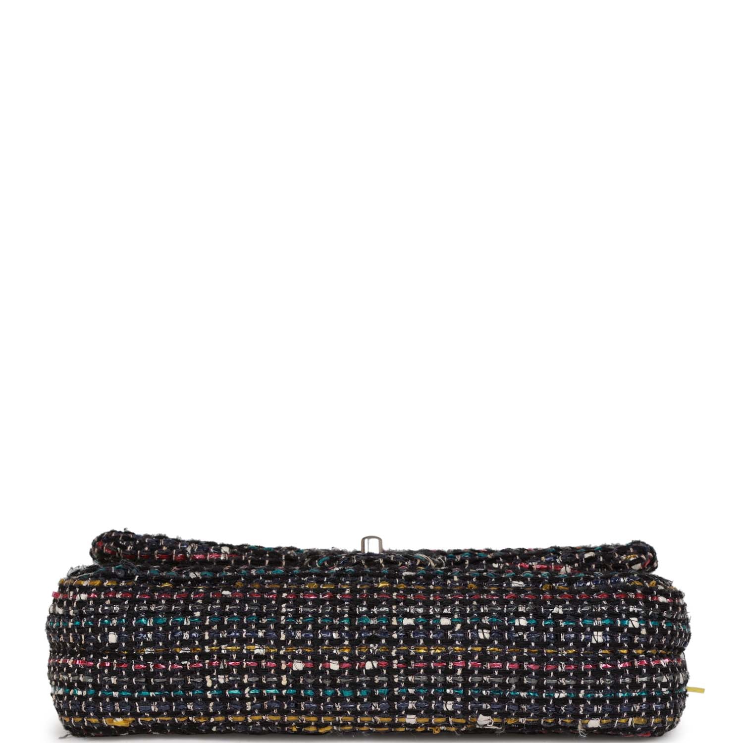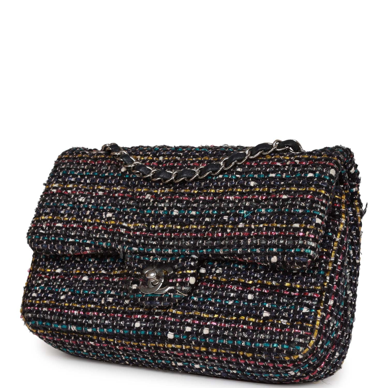 This Medium Classic Double Flap bag is in White and Black tweed boucle fabric with silver hardware and features a front flap with signature CC turnlock closure, half moon back pocket, and adjustable interwoven silver tone chain link and white leather shoulder strap.