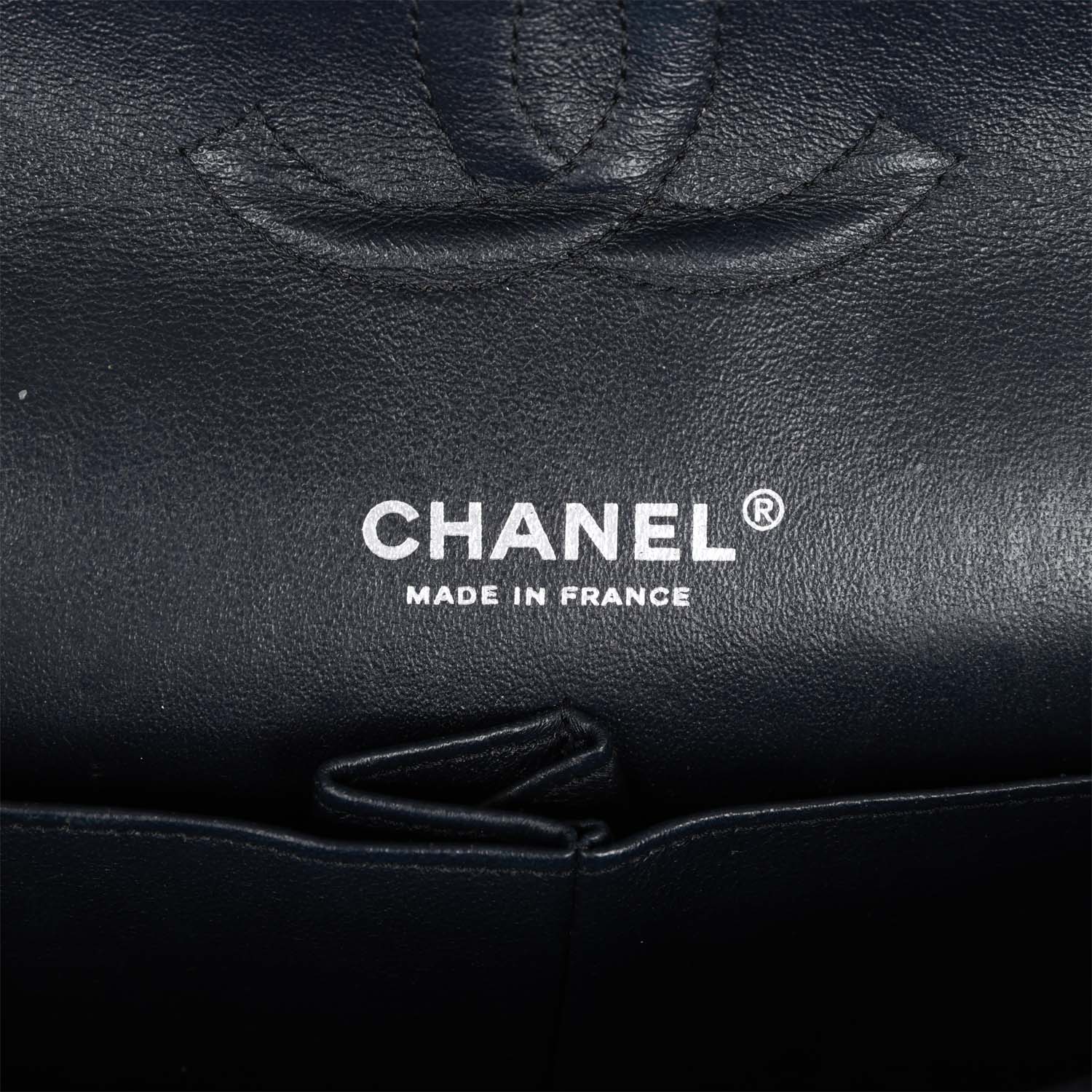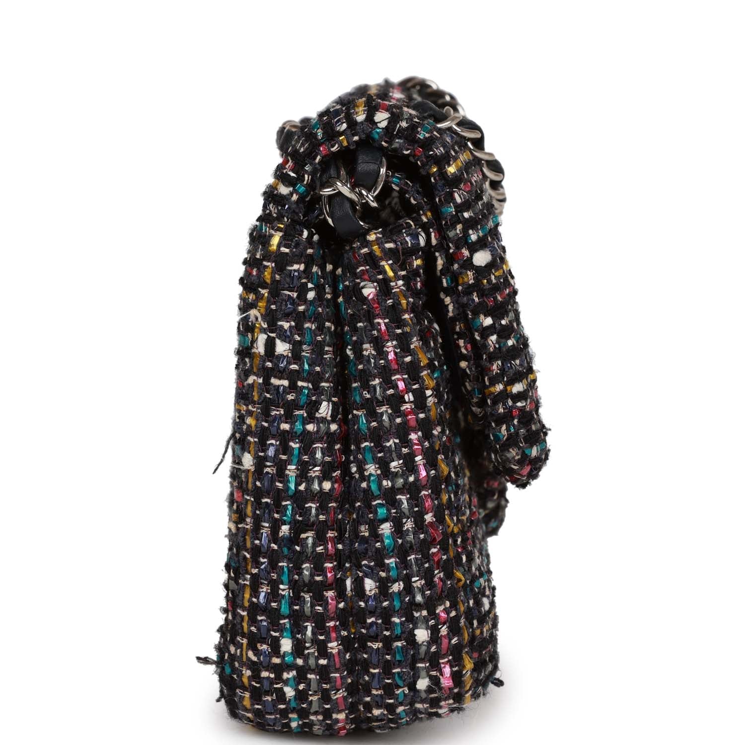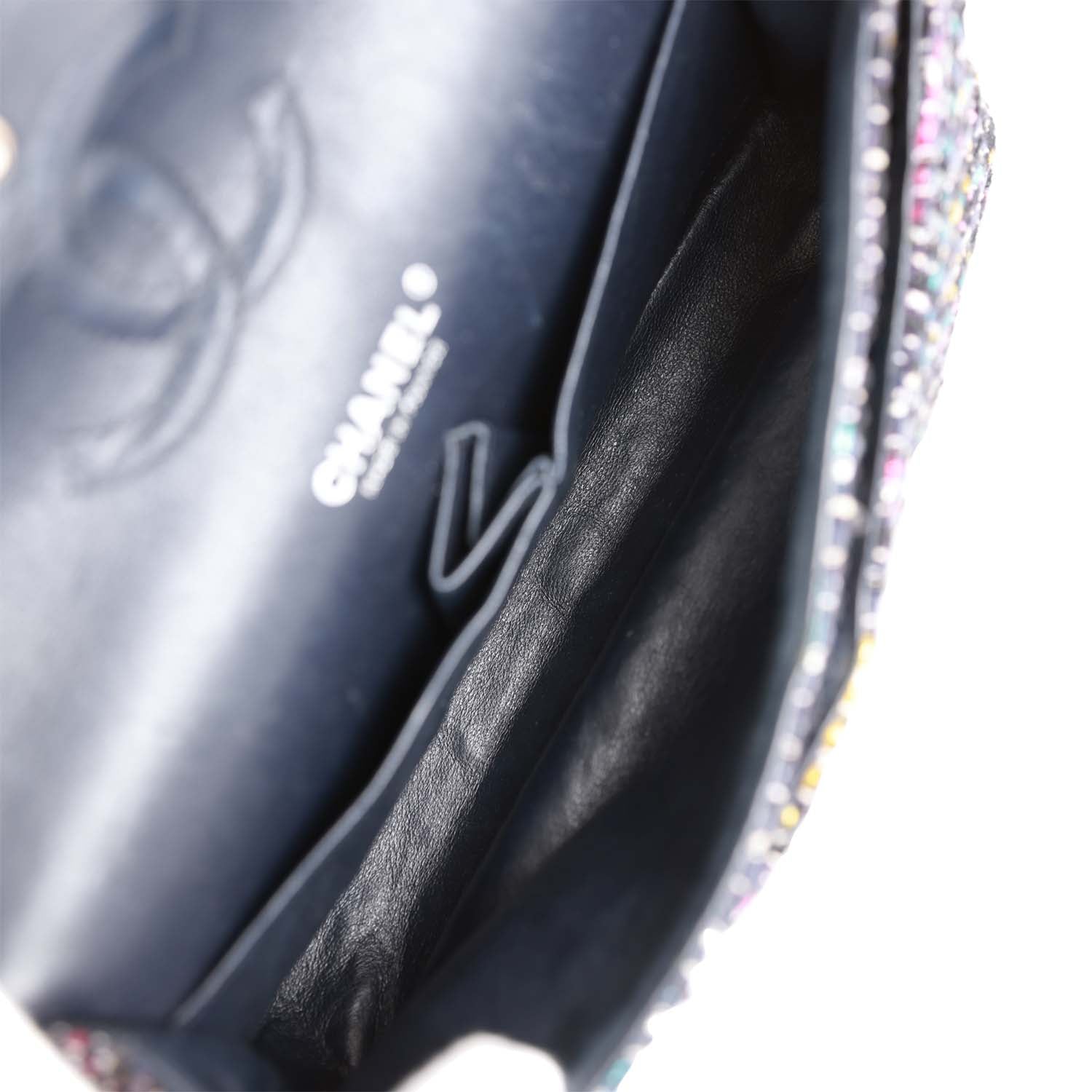 This Medium Classic Double Flap bag is in White and Black tweed boucle fabric with silver hardware and features a front flap with signature CC turnlock closure, half moon back pocket, and adjustable interwoven silver tone chain link and white leather shoulder strap.