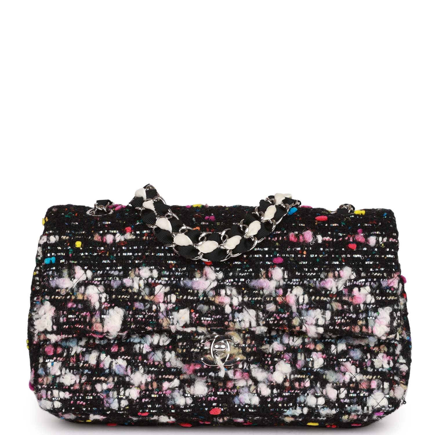 This Medium Classic Double Flap bag is in Multicolor Tweed fabric with silver hardware, front flap with CC turnlock closure, half moon back pocket, interwoven silver tone chain link and black and white fabric shoulder/crossbody strap.