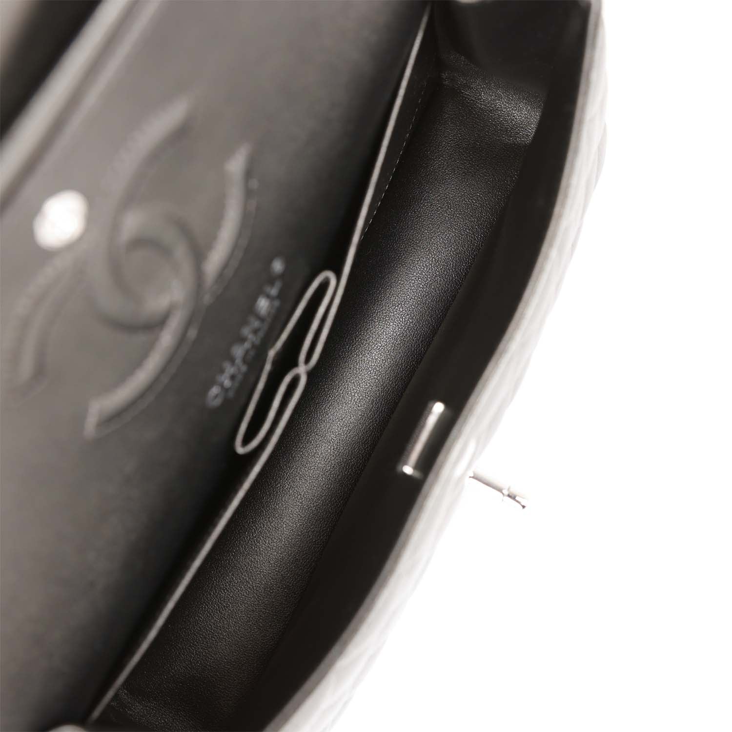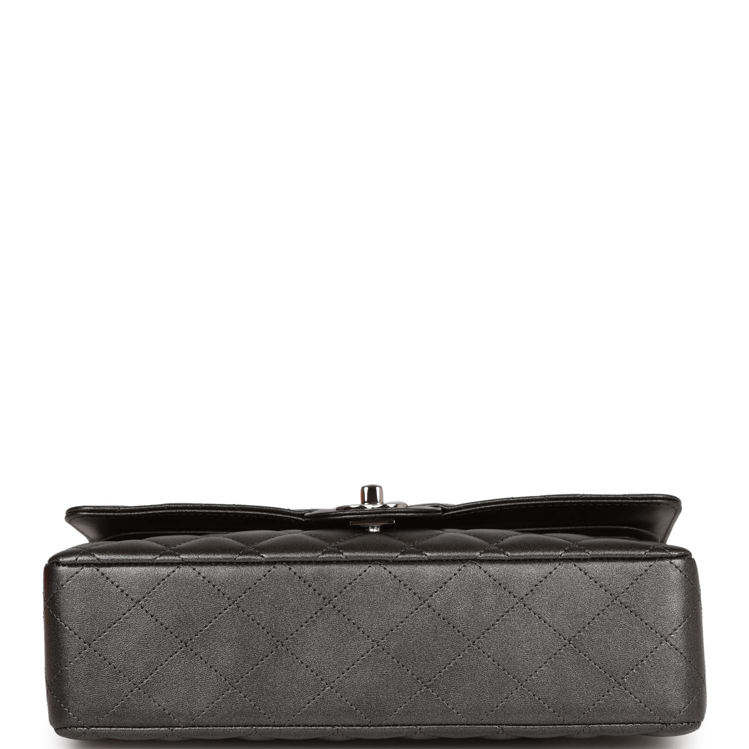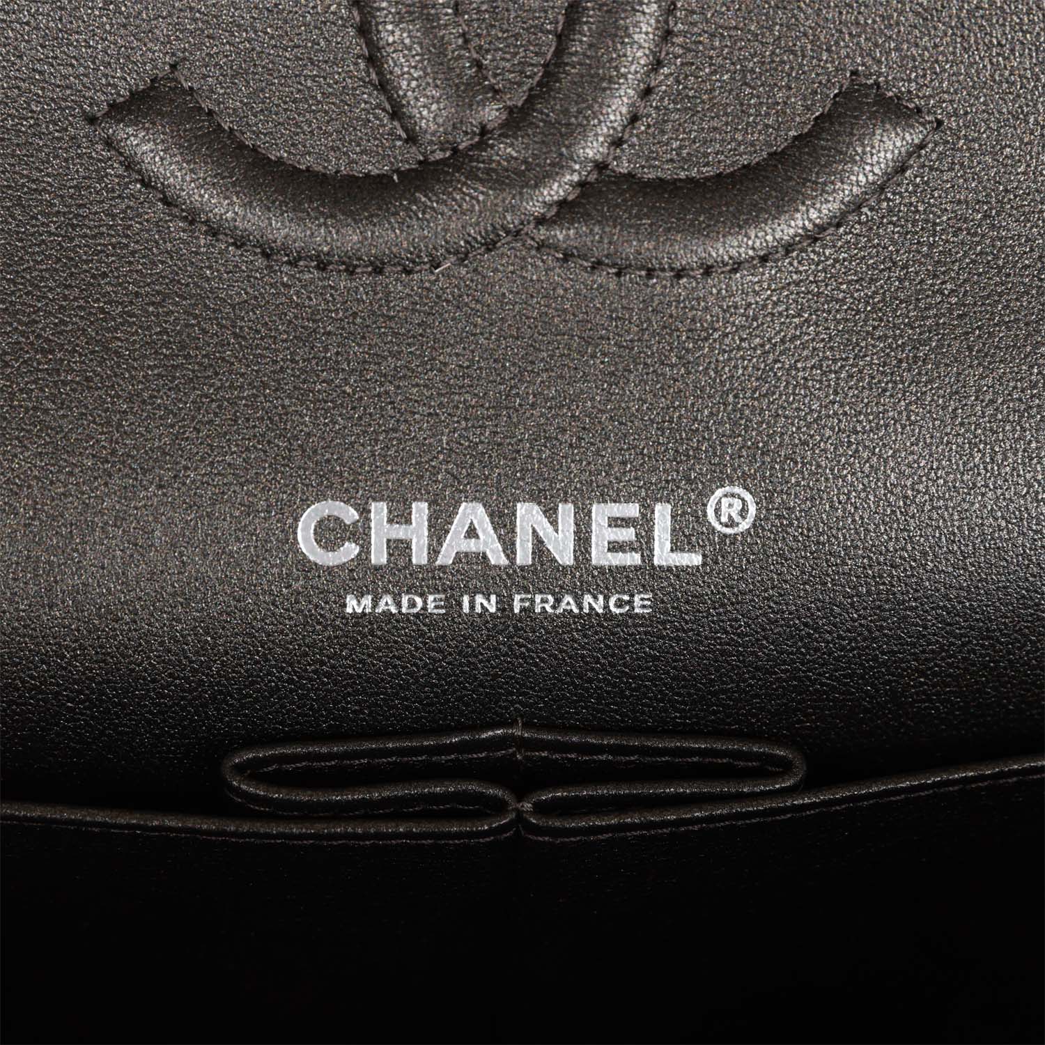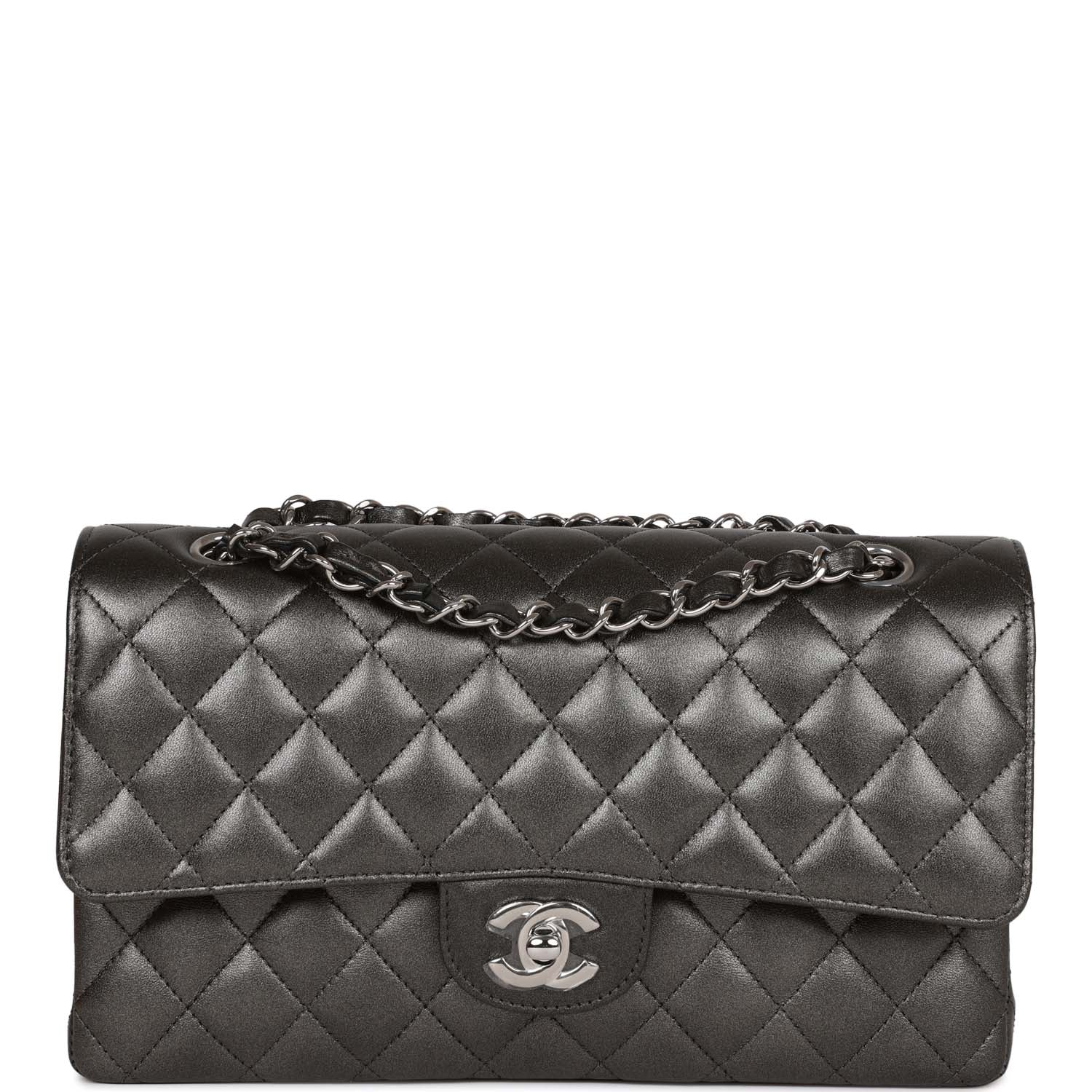 This Chanel Medium Classic Double Flap bag is in metallic grey lambskin leather with silver hardware, front flap with CC turnlock closure, half moon back pocket and adjustable interwoven silver chain link and metallic grey leather shoulder/crossbody strap
