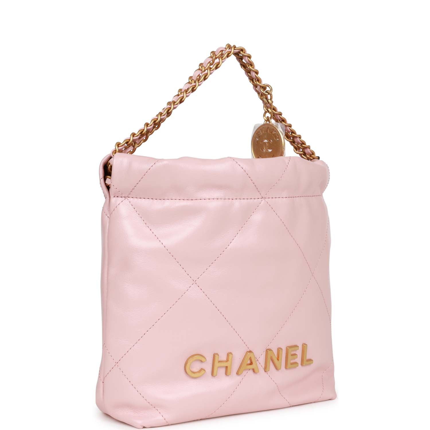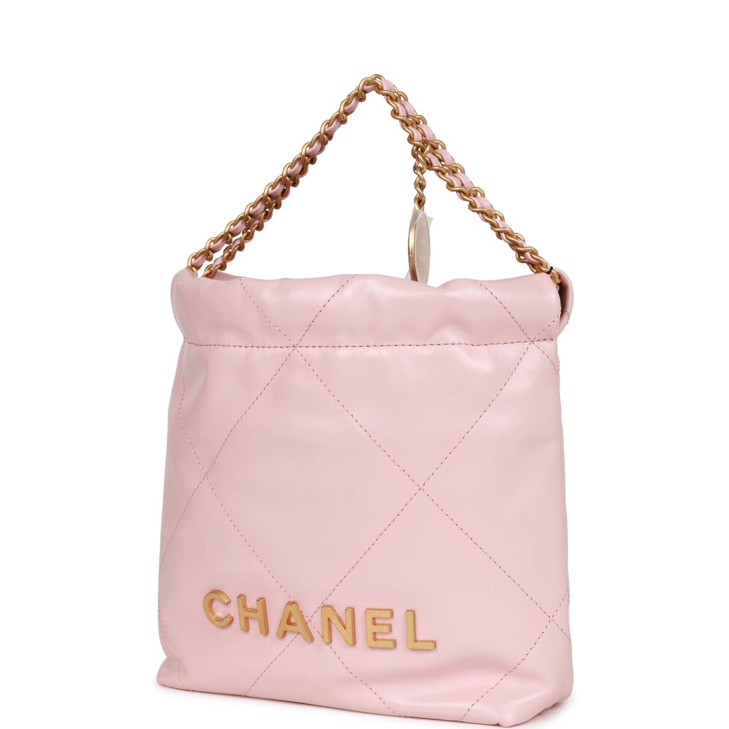 This mini 22 hobo bag is in Pink calfskin with gold tone hardware and has the signature diamond quilting, CHANEL on the front in gold tone metal, and a long gold tone and pink leather interwoven chain.