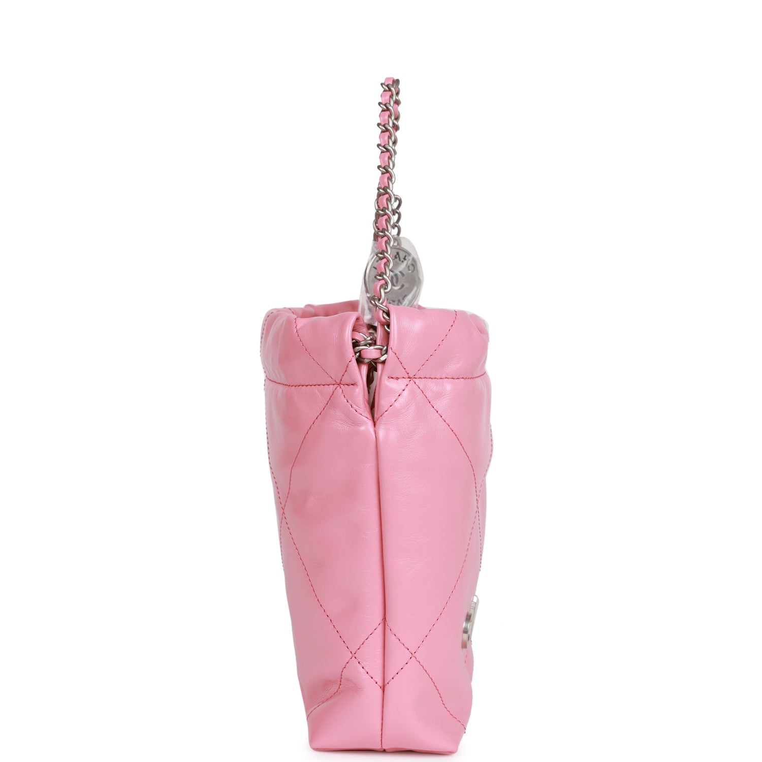 This mini 22 hobo bag is in Pink calfskin with silver tone hardware and has the signature diamond quilting, CHANEL on the front in silver tone metal, and a long silver tone and pink leather interwoven chain.