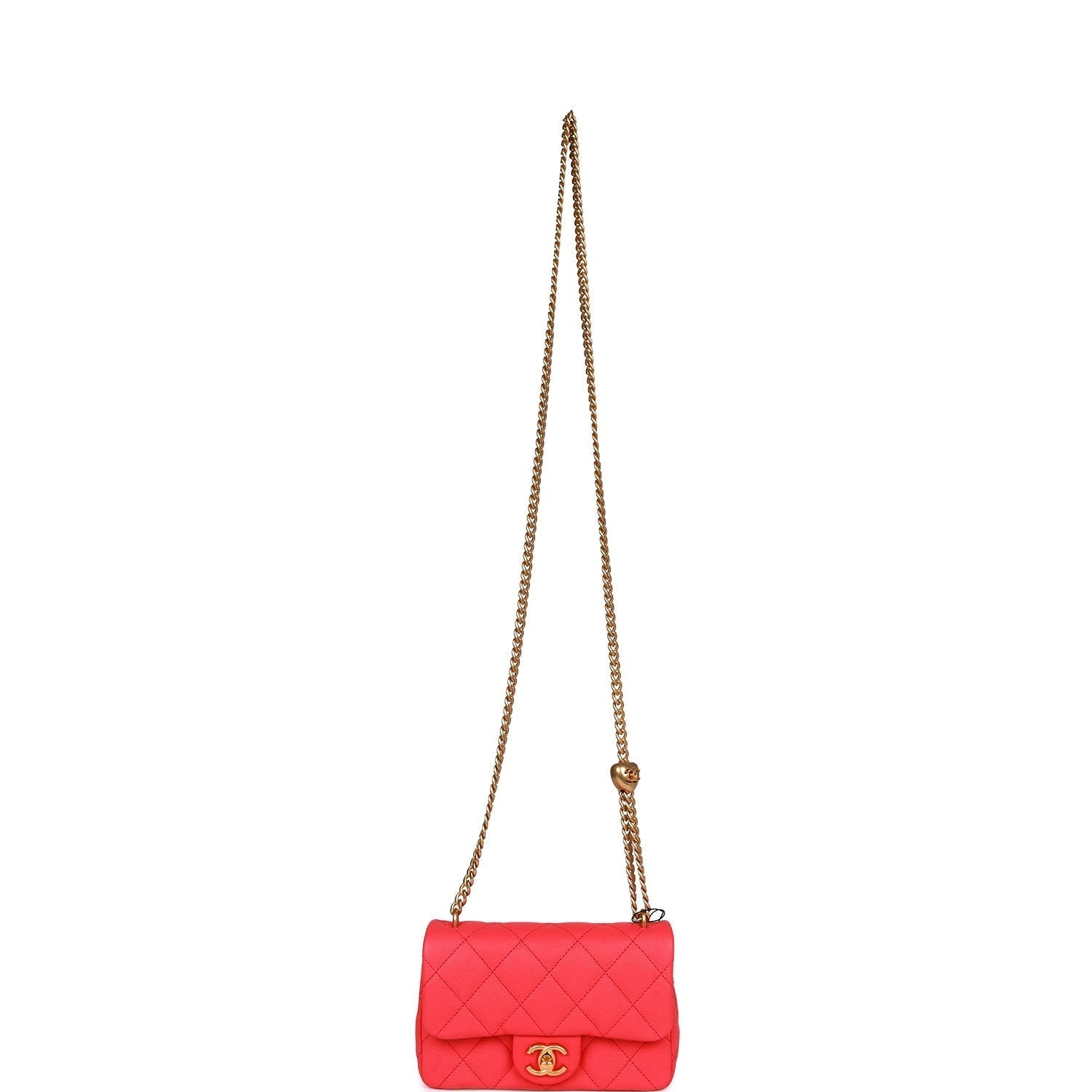 This Mini Flap bag is of pink caviar leather with antique gold tone hardware, a front flap with CC turnlock closure, half moon back pocket and interwoven light gold tone chain link adjustable crossbody strap.