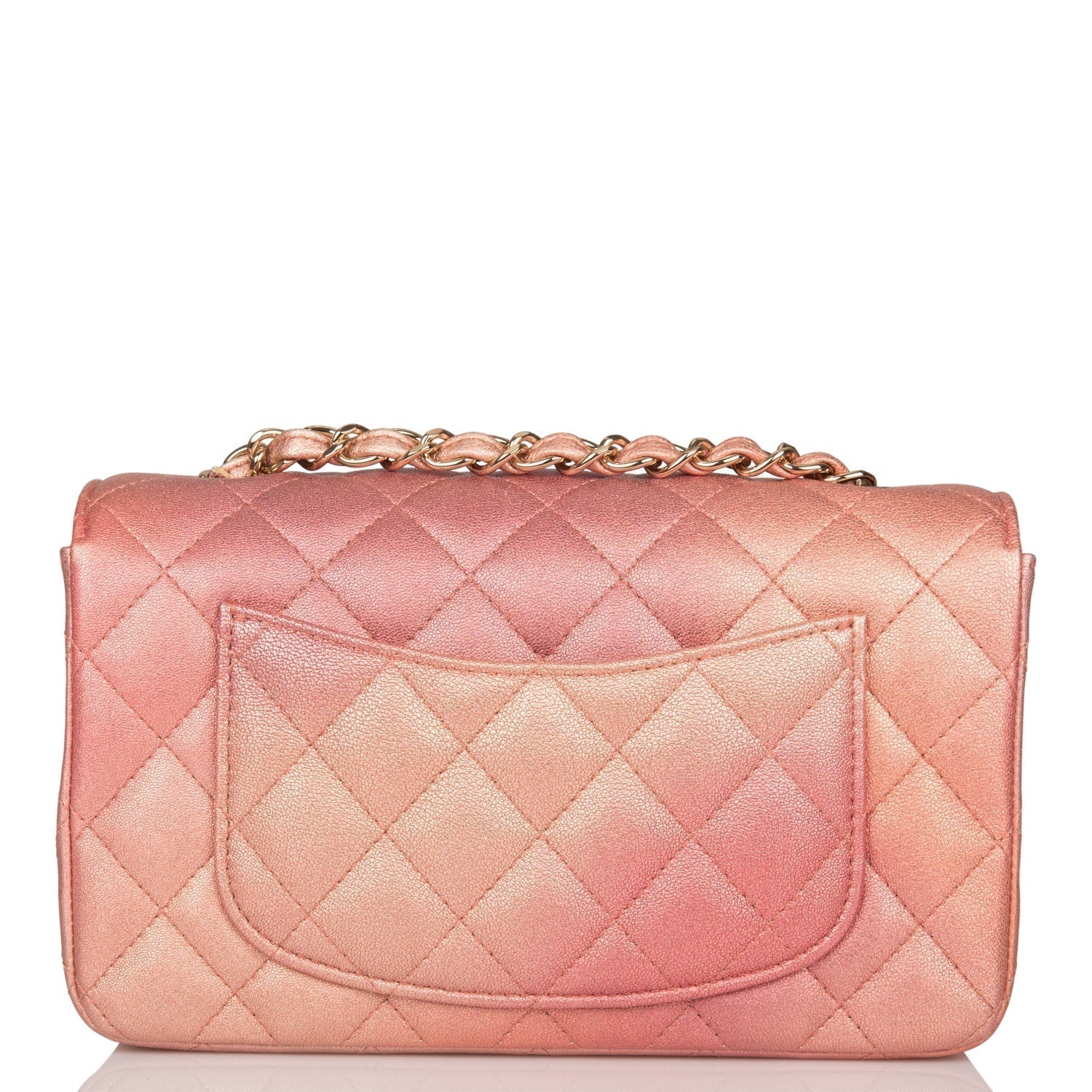 This Mini Rectangular flap bag is in ombre pink metallic lambskin with light gold tone hardware and has a front flap with signature CC turnlock closure, rear half moon pocket and single interwoven ombre pink leather and light gold tone chain link shoulder/crossbody strap.