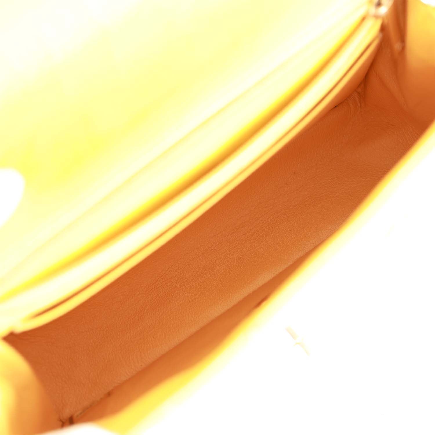 This Mini Rectangular flap bag is in Yellow lambskin leather with light gold hardware and has a front flap with signature CC turnlock closure, rear half moon pocket, and a single interwoven yellow leather and light gold tone chain link shoulder/crossbody strap.
