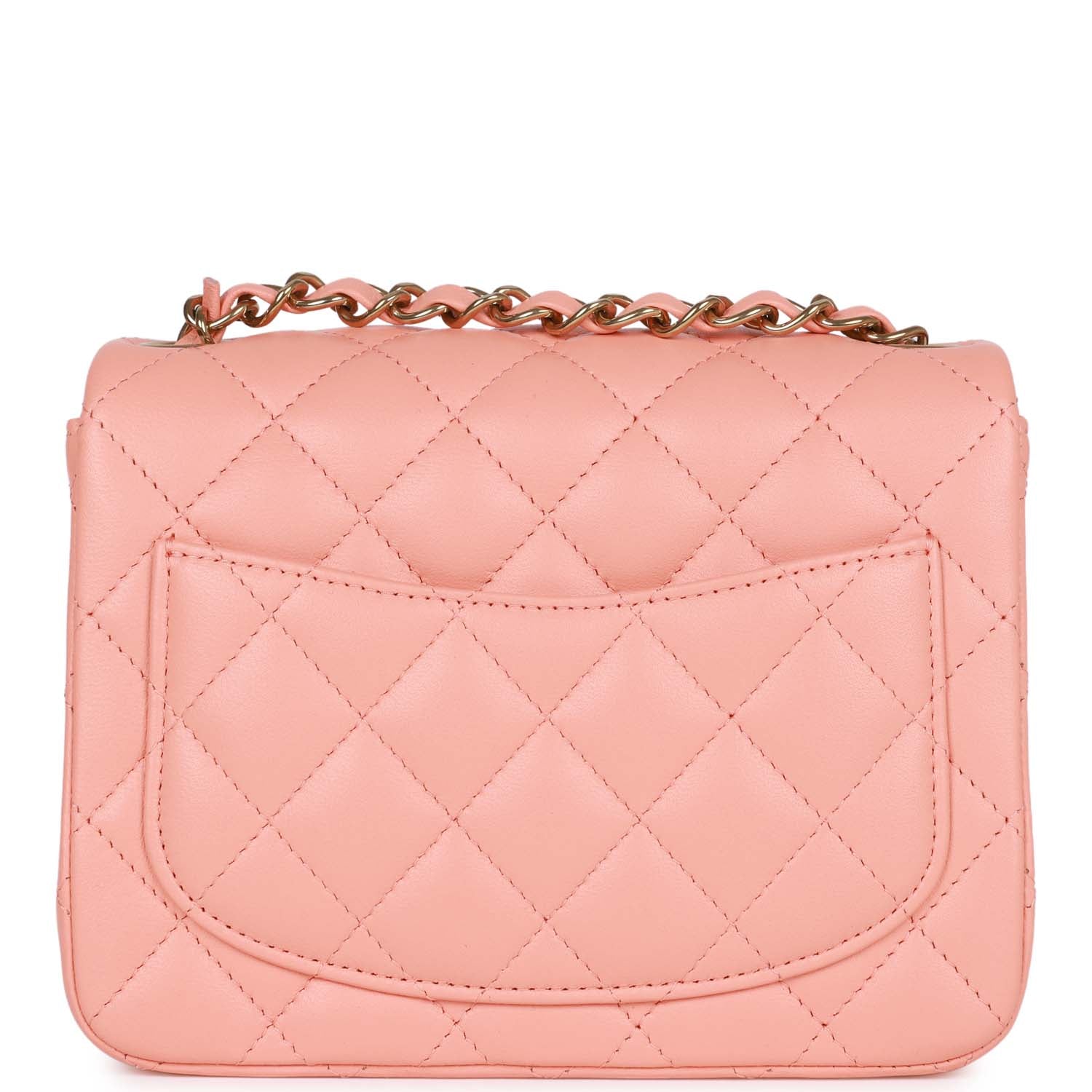 This Chanel Mini Square flap bag is of pink lambskin leather with light gold tone hardware and has a front flap with signature CC turnlock closure, rear half moon pocket, single interwoven pink leather and light gold tone chain link shoulder/crossbody strap.