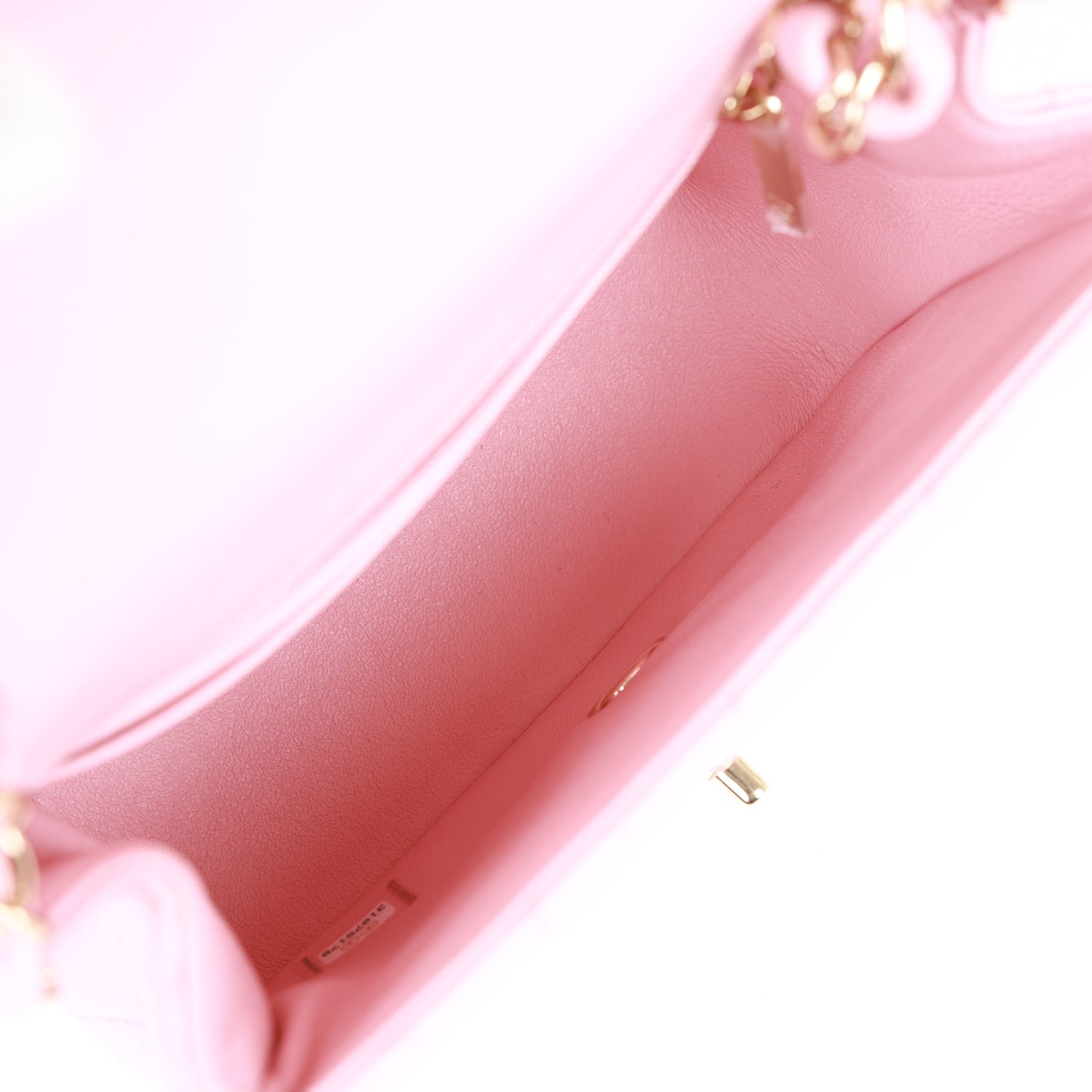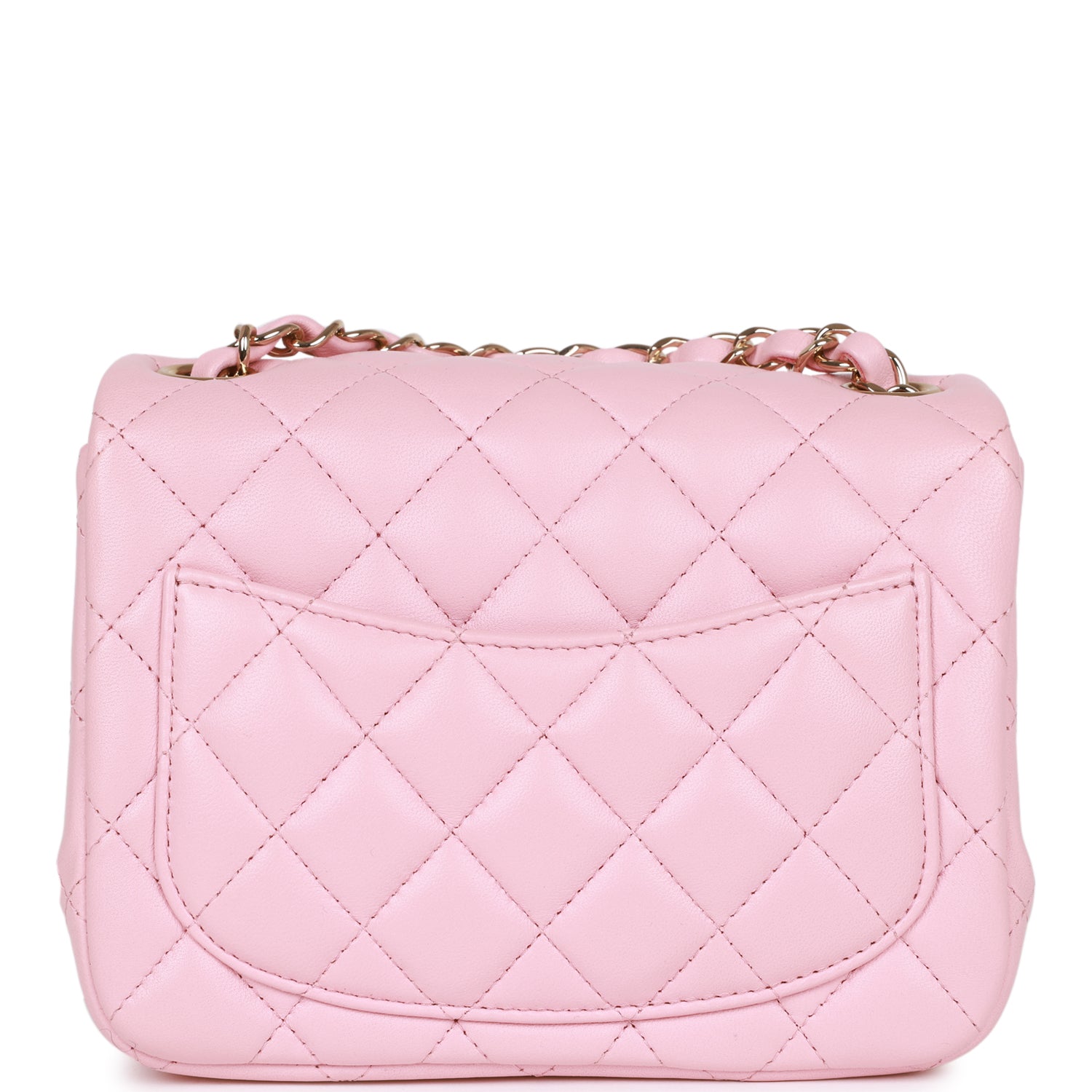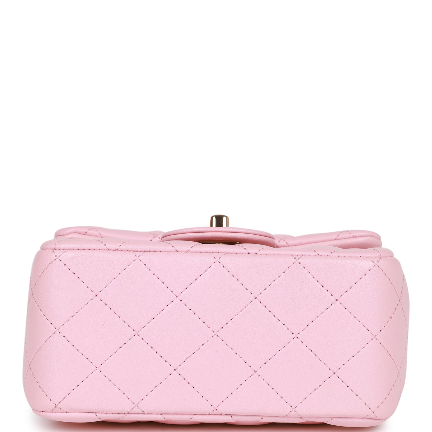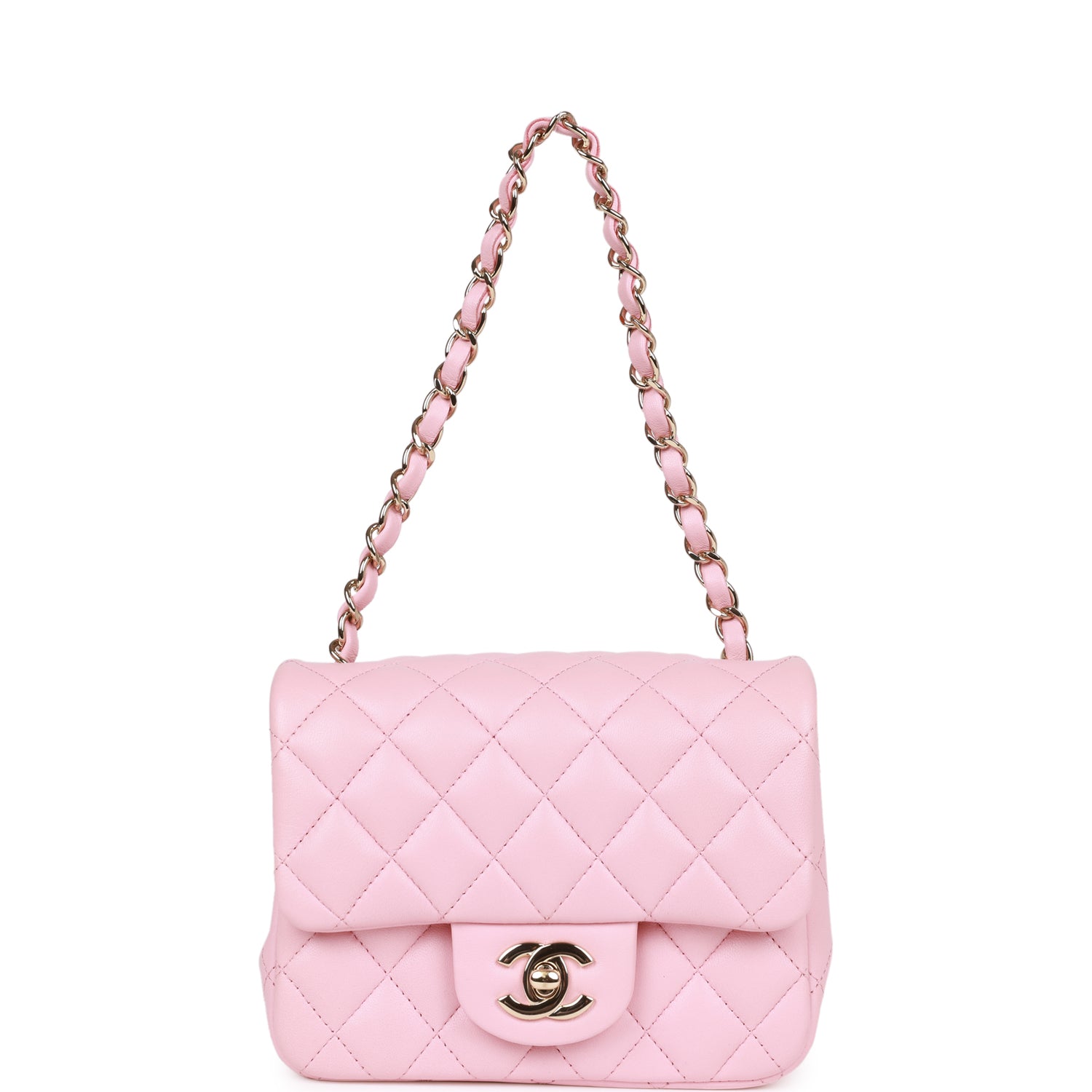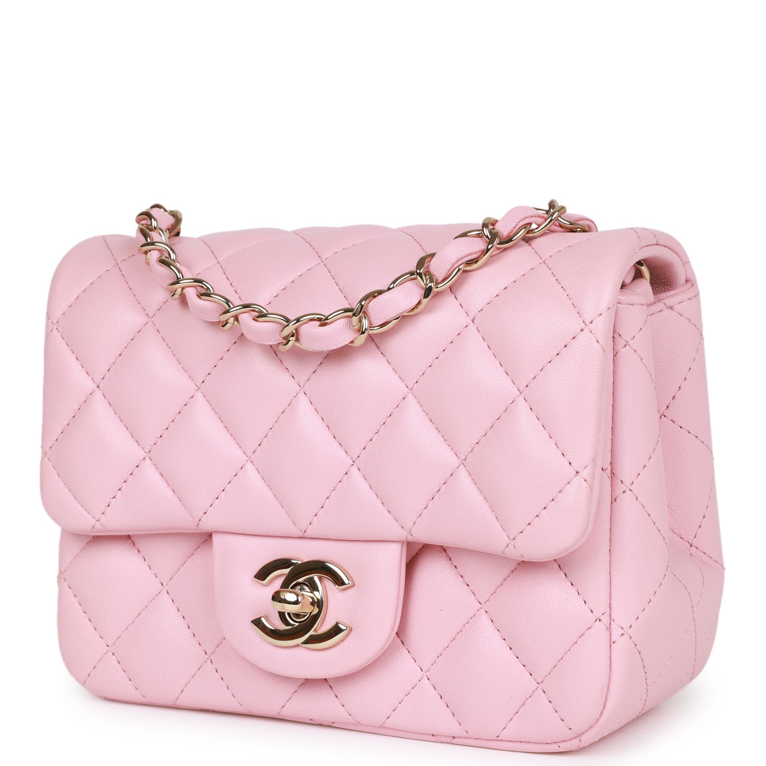 This Mini Square flap bag is of pink lambskin leather with light gold hardware and has a front flap with signature CC turnlock closure, rear half moon pocket, single interwoven pink leather and light gold tone chain link shoulder/crossbody strap.