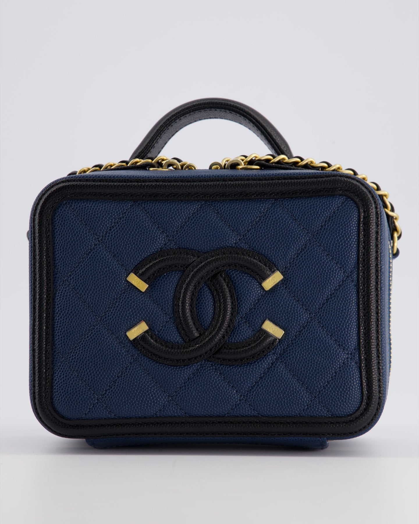 Chanel Navy and Black Small CC Vanity Case Bag in Caviar Leather with Brushed Gold Hardware