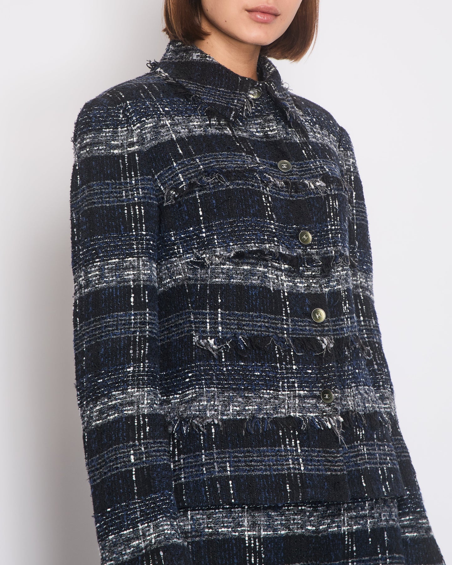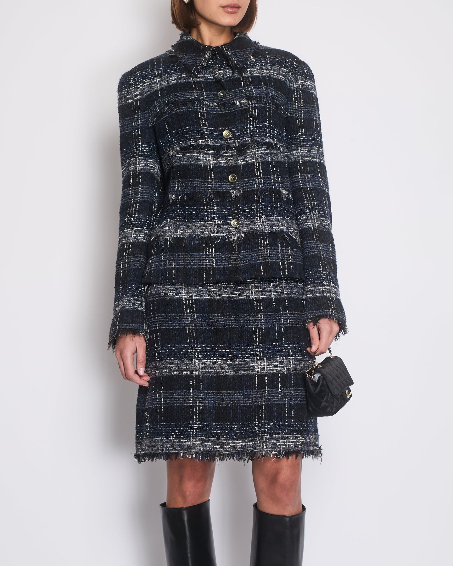 Chanel Navy, Black and Grey Checked Tweed Jacket and Skirt Set with Frills and CC Button Details Size FR 44 (UK 16)