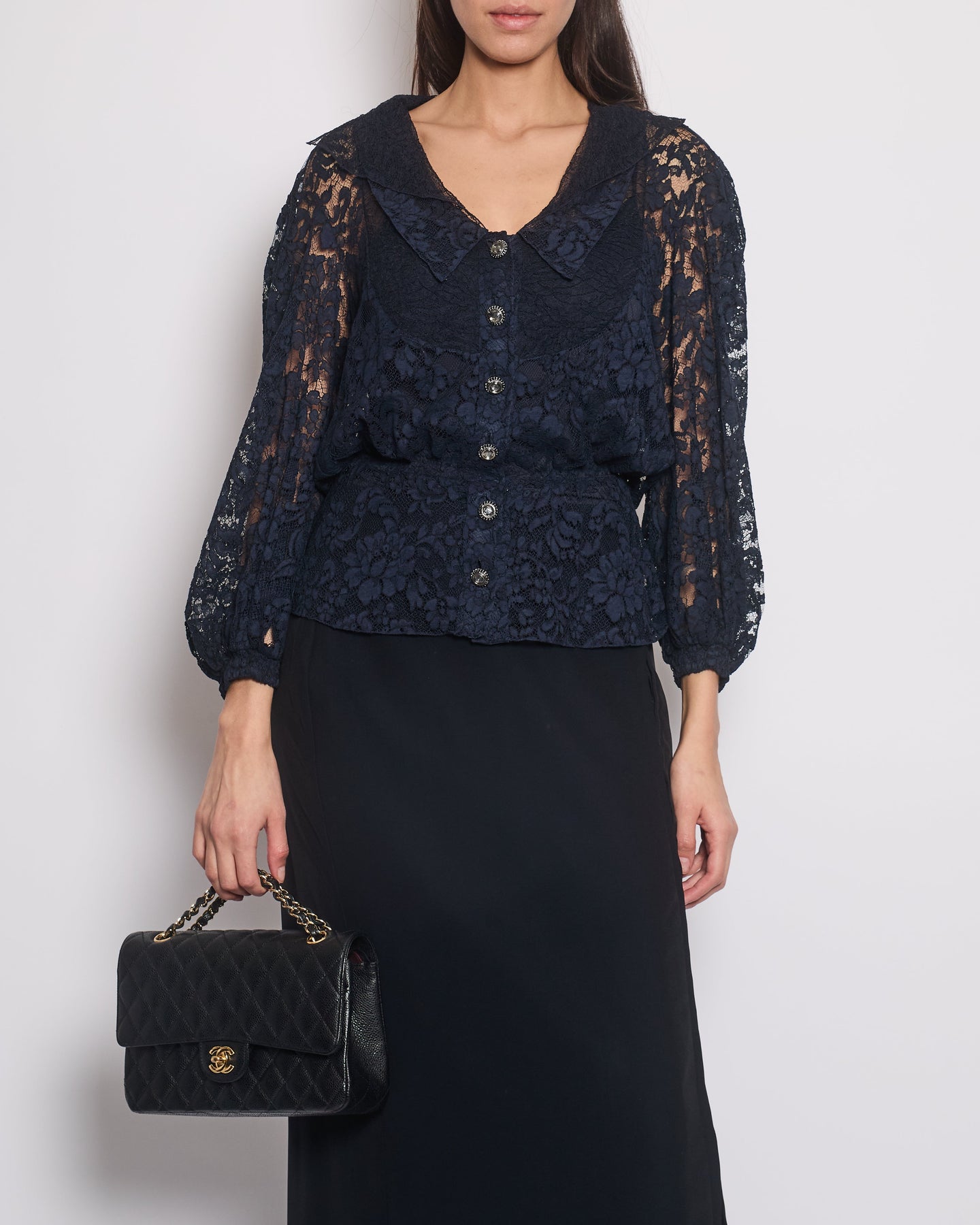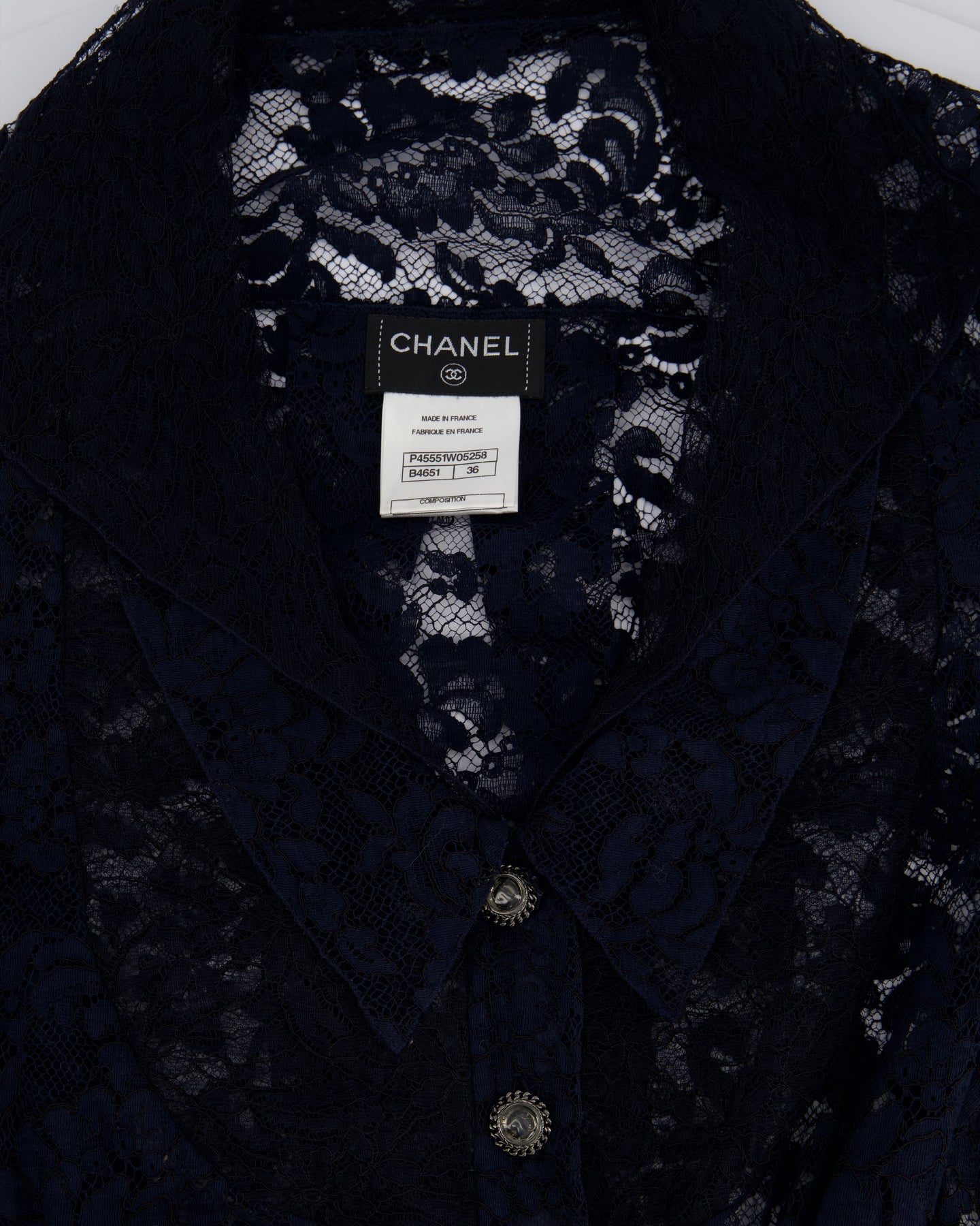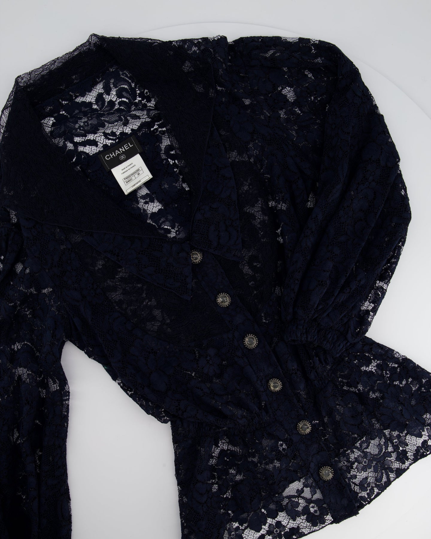 Chanel Navy Lace Long Sleeve Shirt with Ruthenium Buttons Detail Size FR 36 (UK 8)