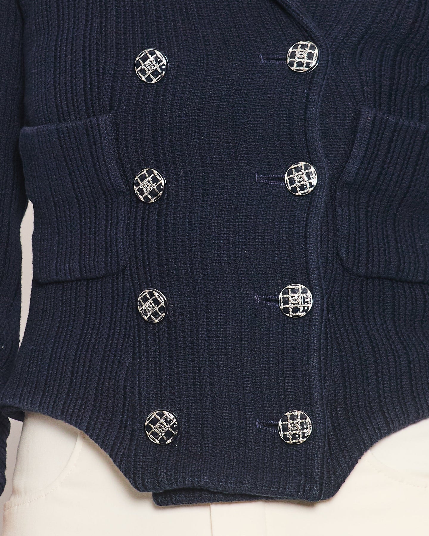 Chanel Navy Tweed Cropped Sleeve Jacket with Black, Silver Check Round CC Logo Buttons Size FR 34 (UK 6)