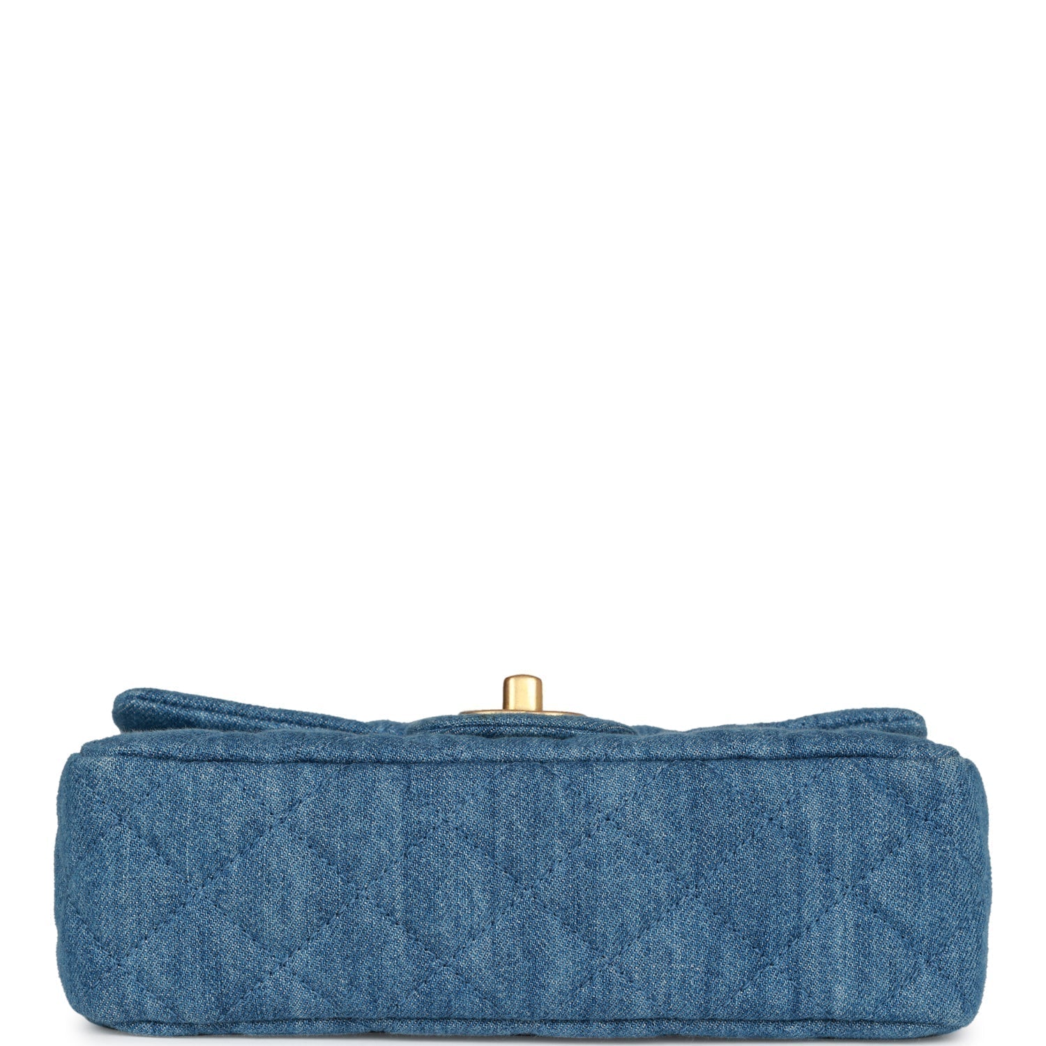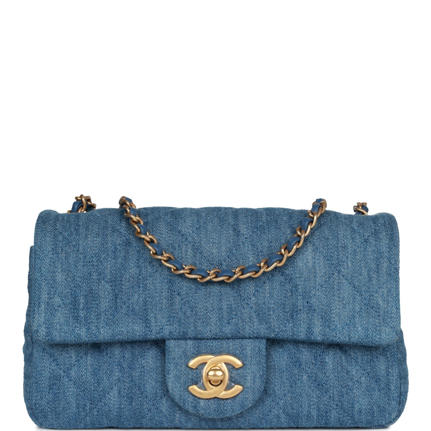 This Mini rectangular pearl crush flap bag is of Blue denim with antique gold tone hardware and has a front flap with signature CC turnlock closure, rear half moon pocket, single interwoven denim and antique gold tone chain link shoulder/crossbody strap.