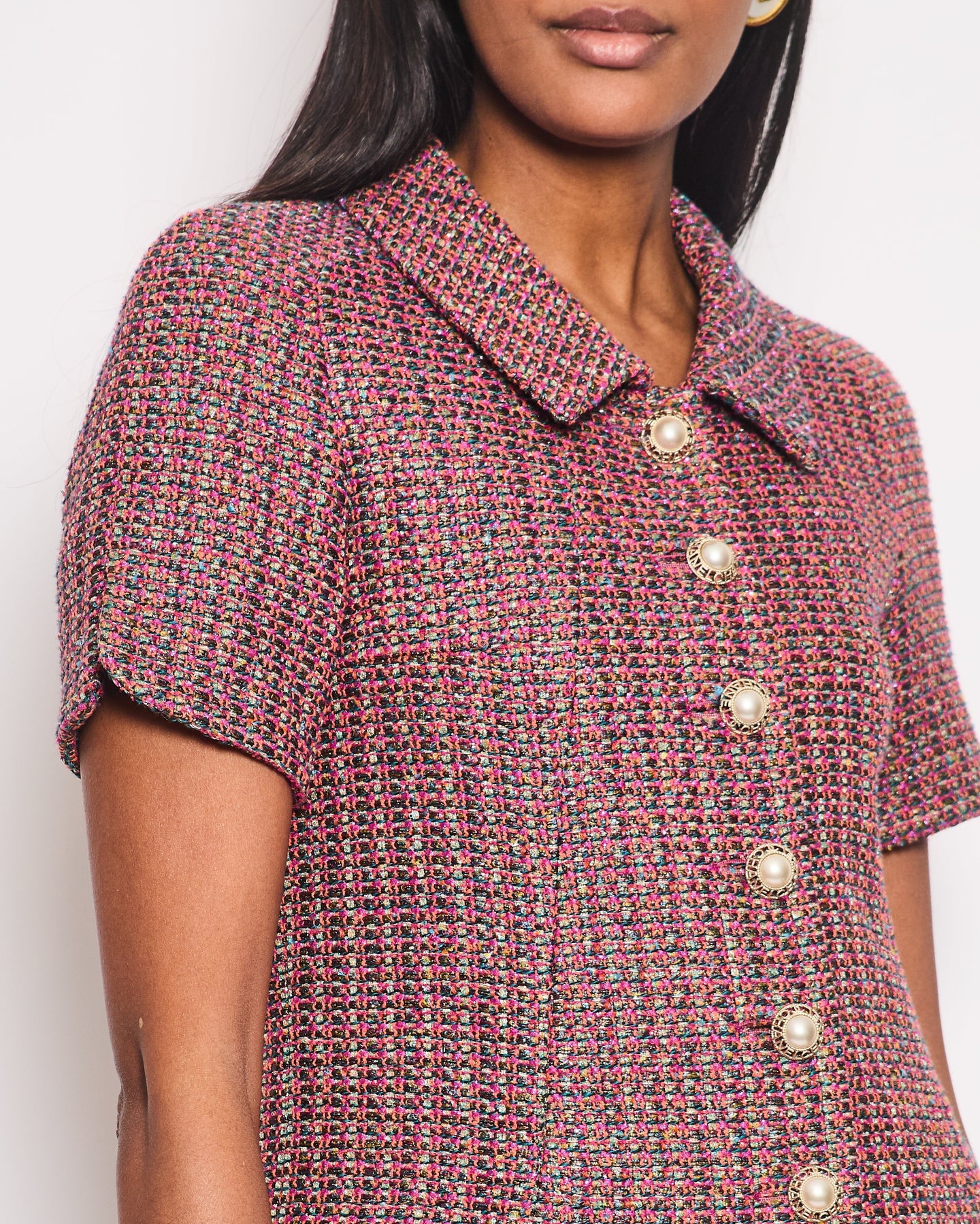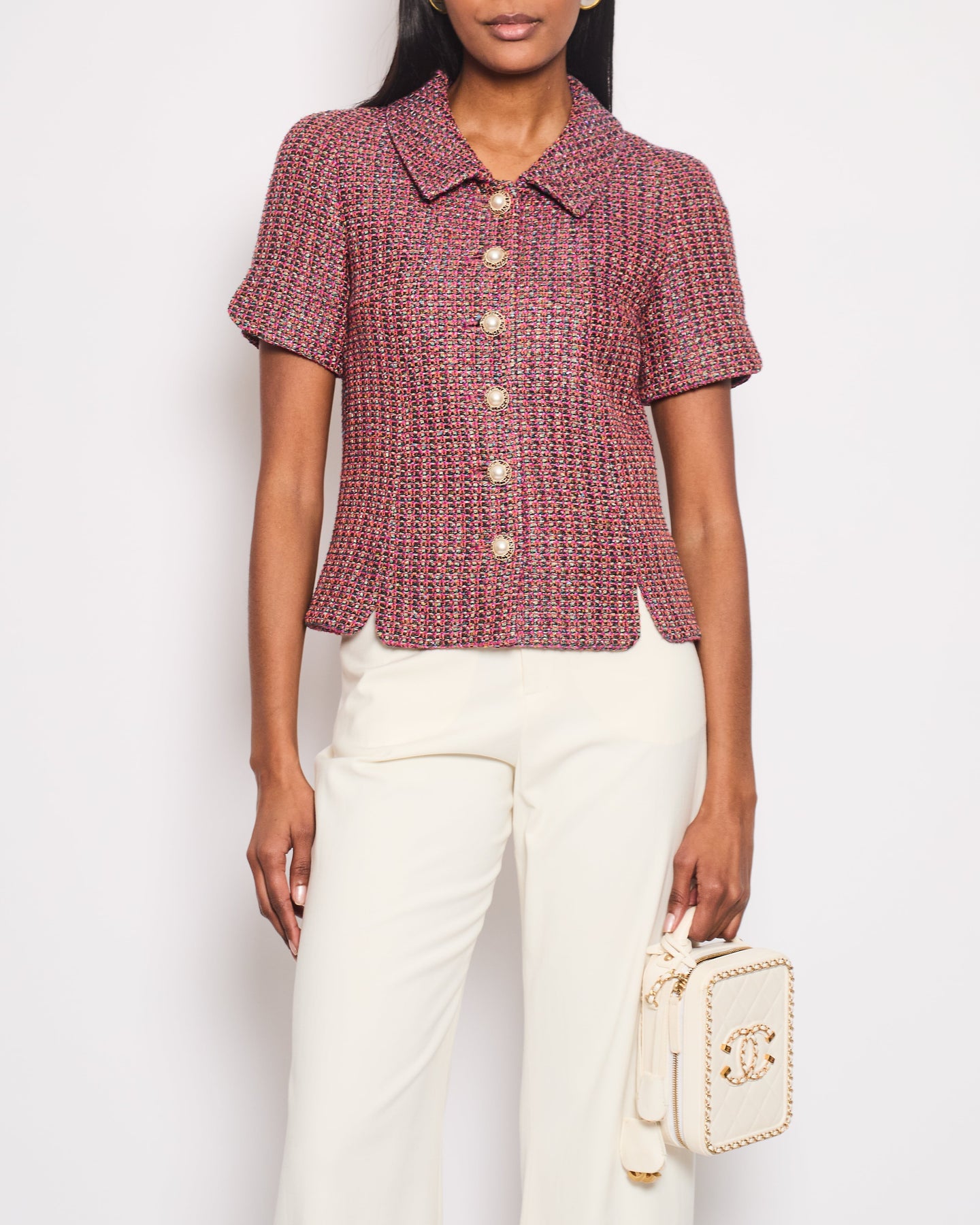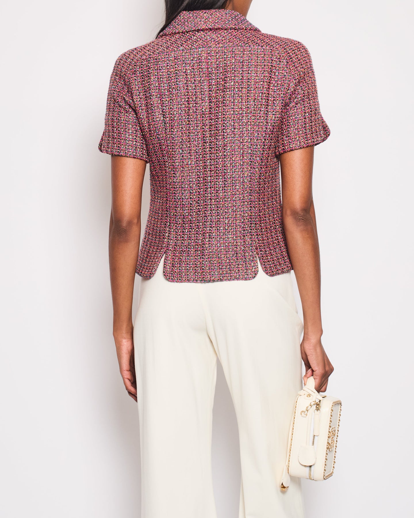 Chanel Purple, Green Metallic Tweed Short-Sleeve Jacket with Pearl Chanel Logo Detail Button Size FR 38 (UK 10)