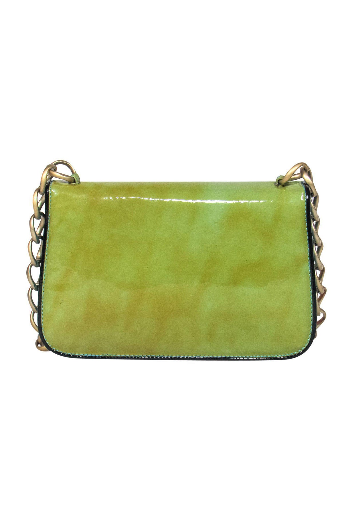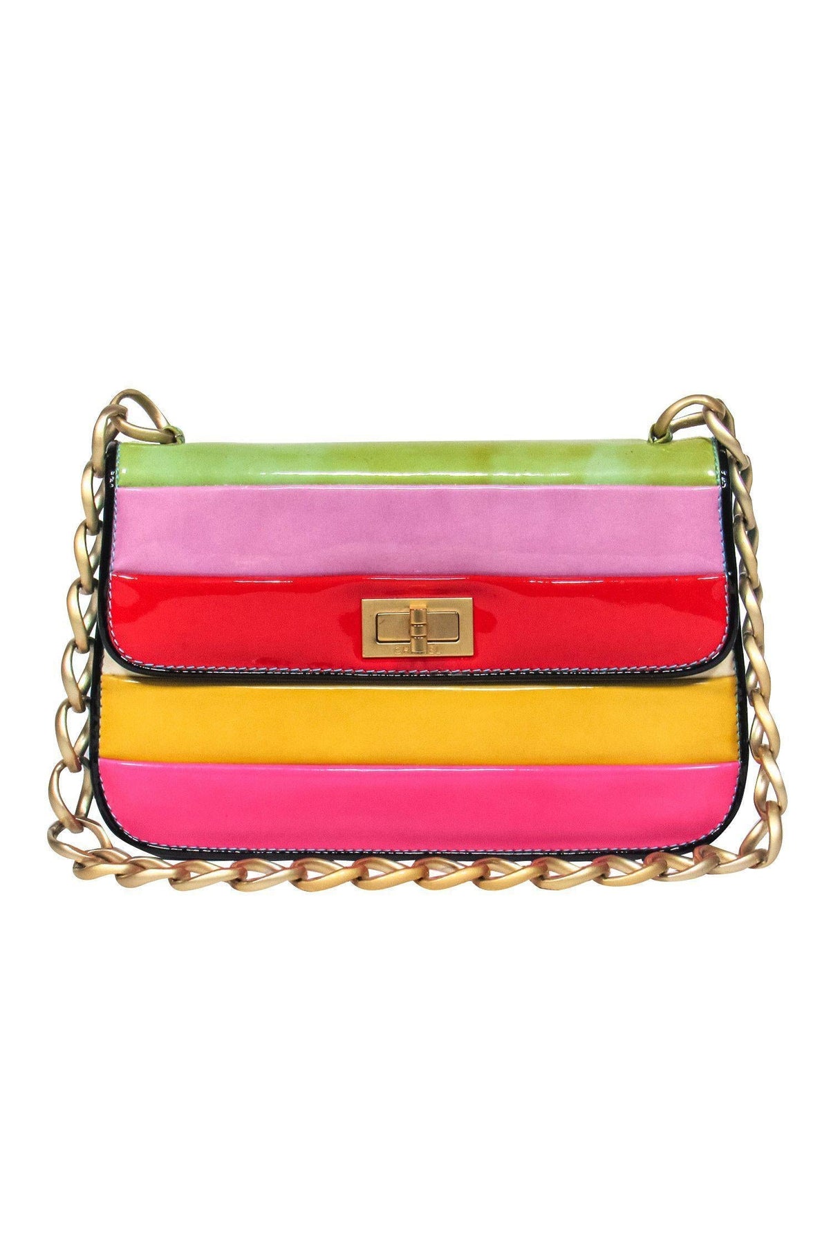 Go chic and bright with this candy striped patent leather bag from Chanel! Made with a striped design, this chain strap statement bag will turn heads every time. Perfect for wearing casually or with your favorite dressed up duds!