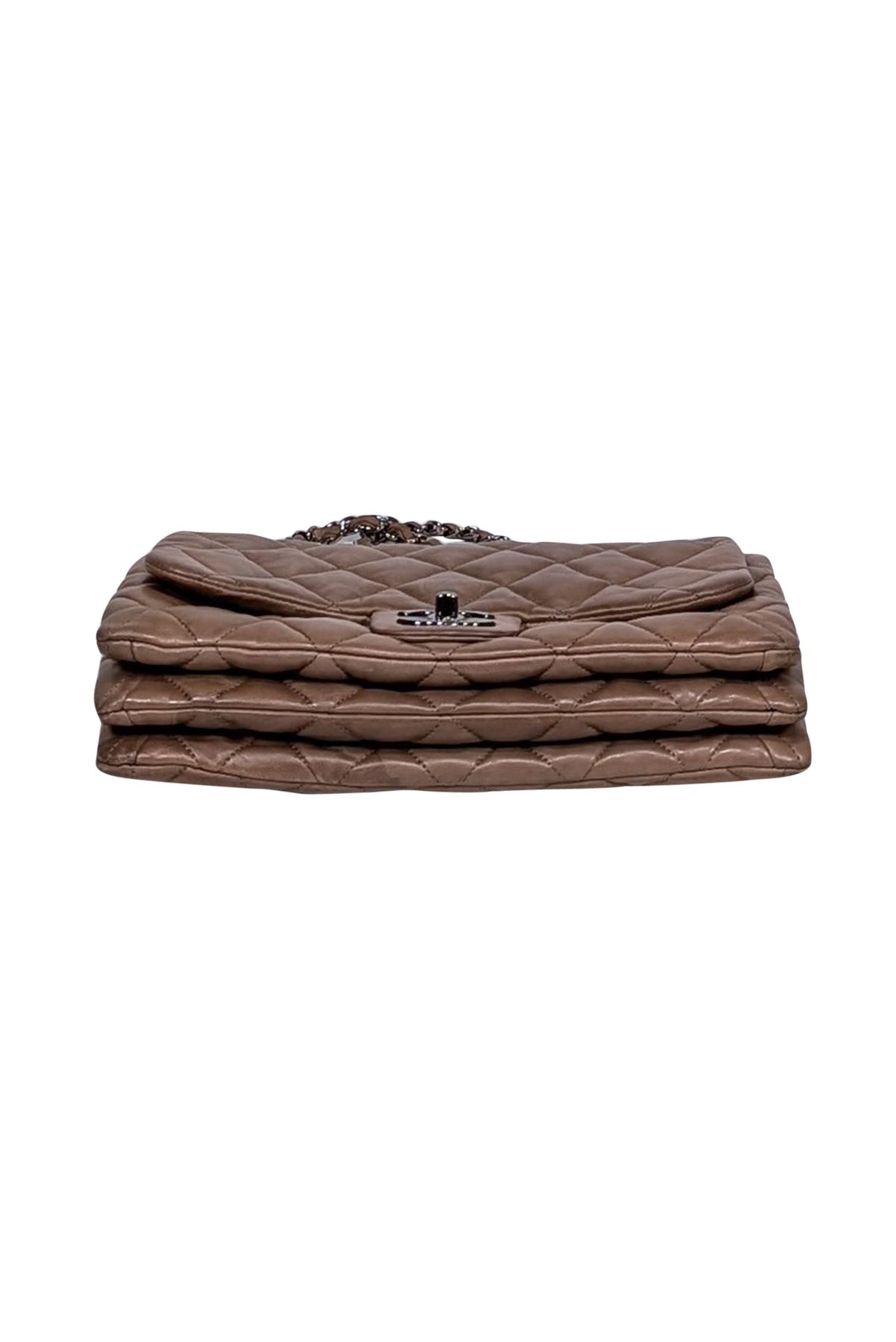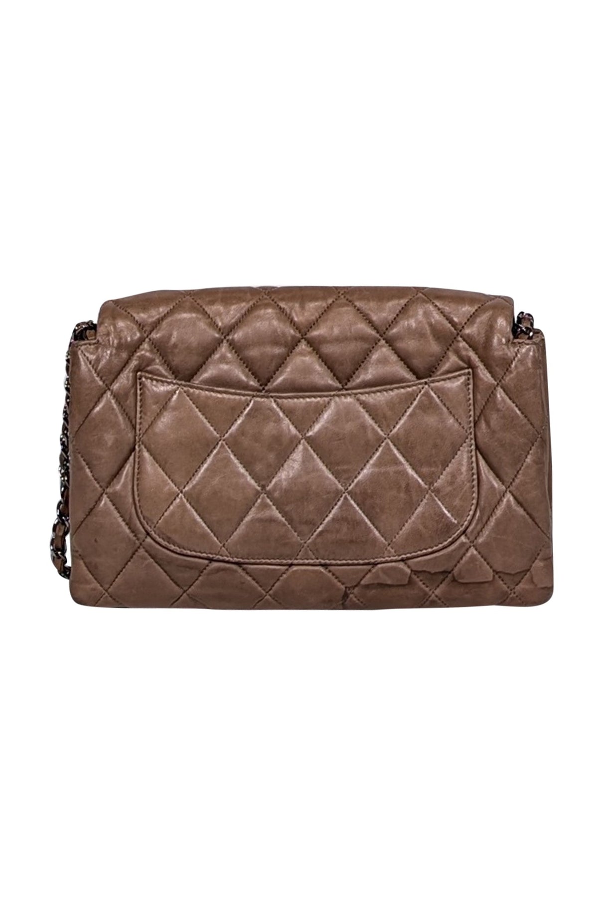 The must-have for every girl: the timeless Chanel light brown quilted leather flap bag. Complete with silver hardware, chain strap, and logo turn lock closure. A classic that will elevate any outfit. Get yours now!