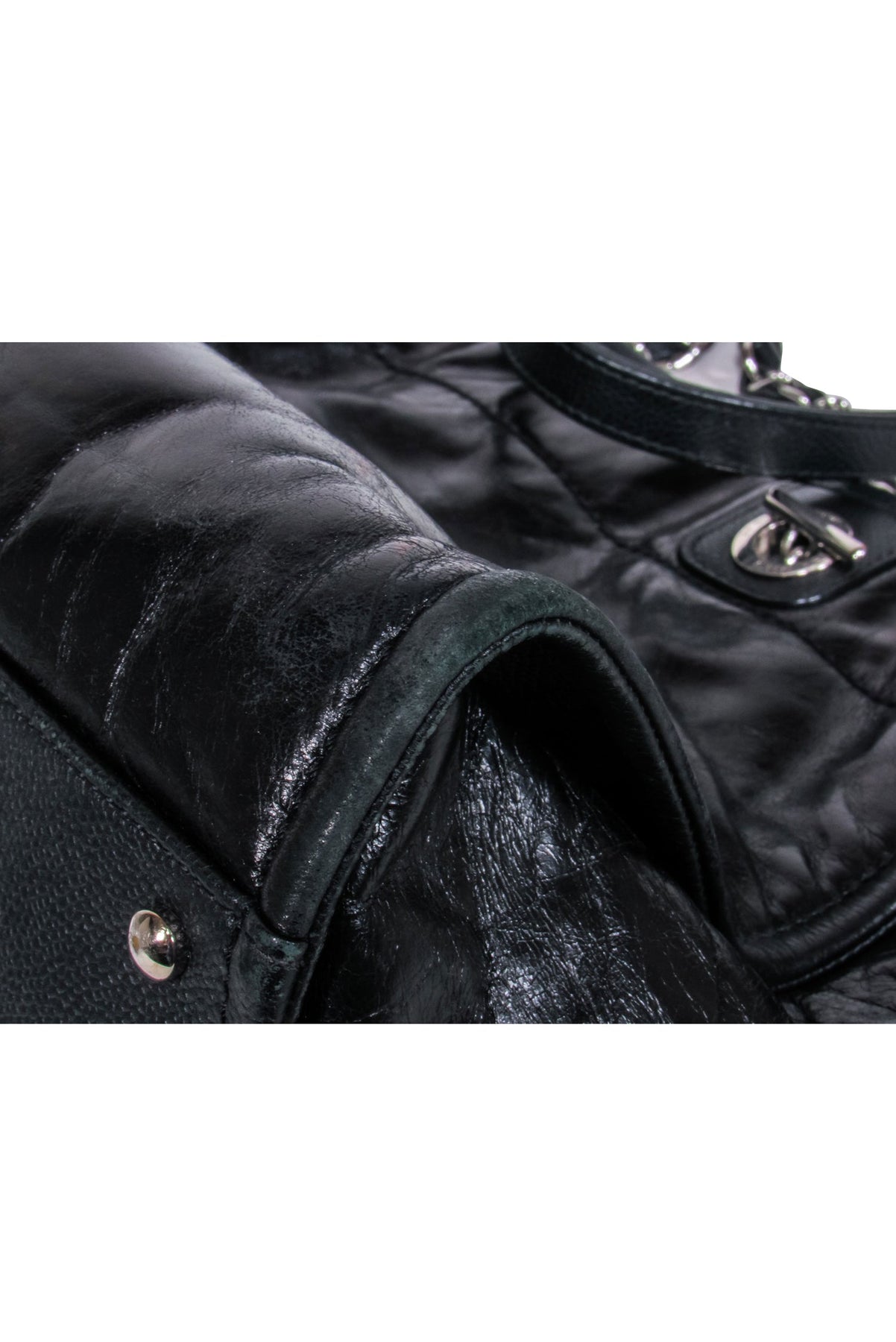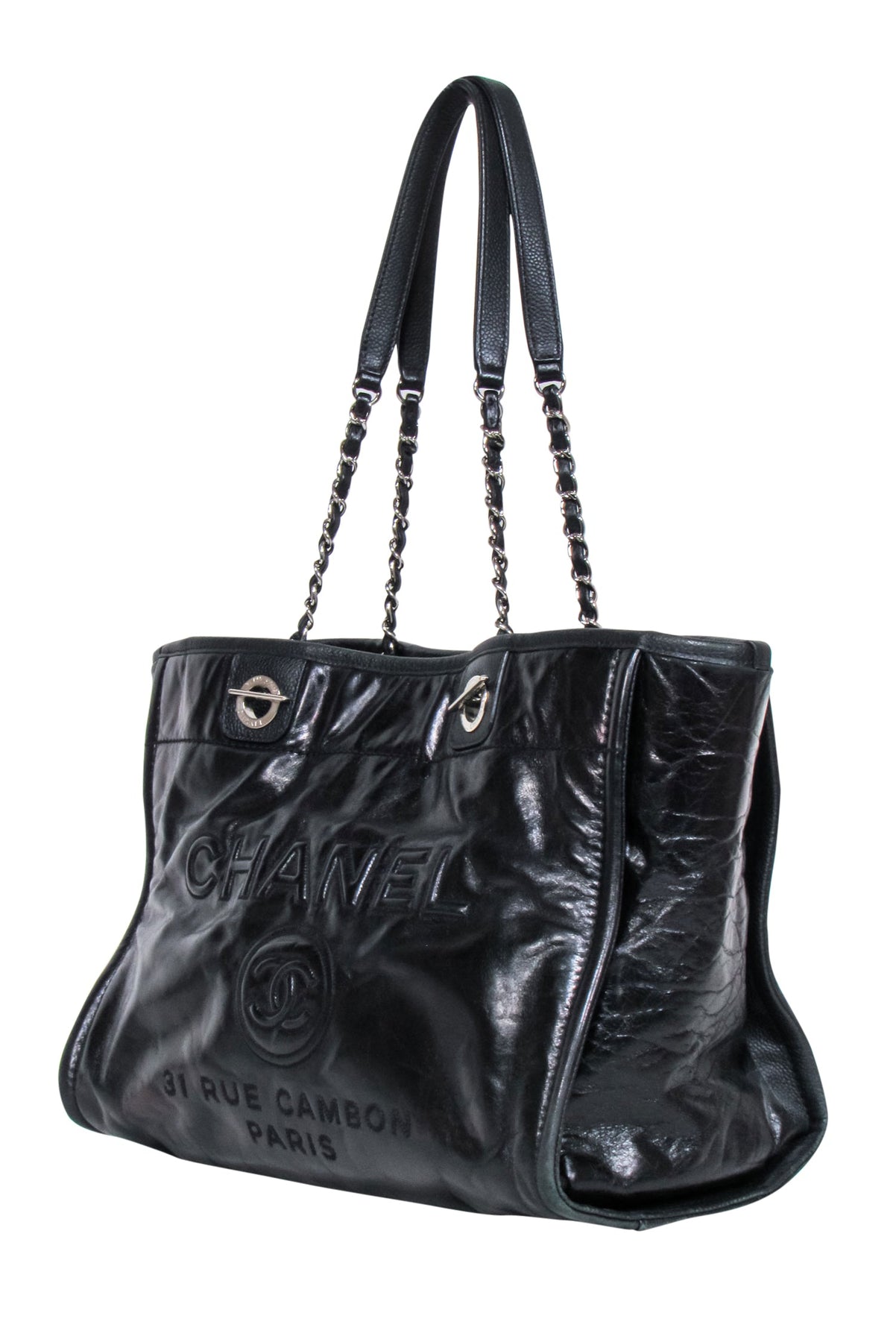 Own a piece of luxury with this Chanel Deauville tote. Crafted in a black semi-glazed calfskin leather and embroidered logo front, this chic and stylish tote bag is spacious for all of your everyday and professional needs!