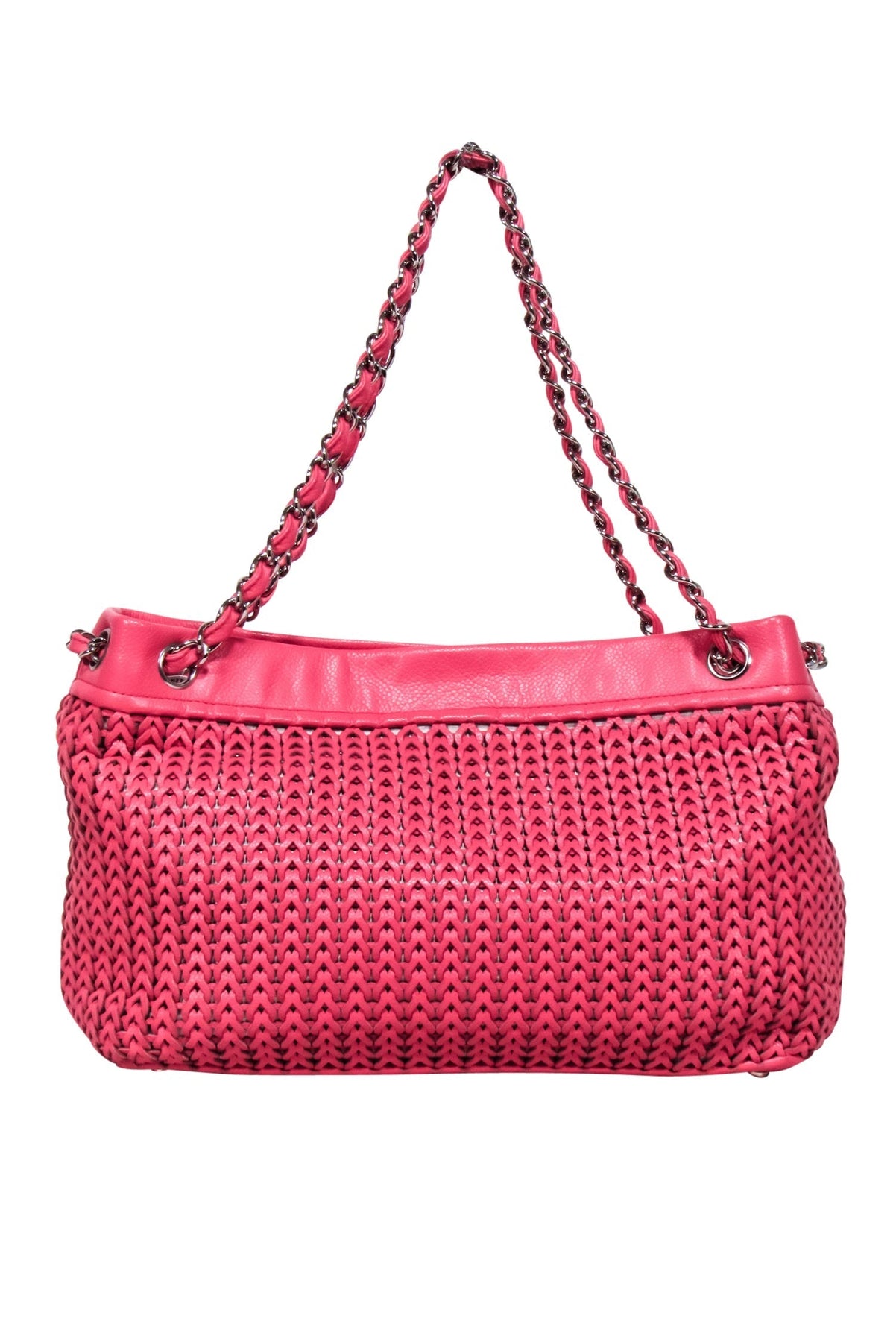 Add a pop of color to your outfit with this hot pink woven leather shoulder bag from Chanel. The silver woven chain adds a touch of elegance, making it the perfect Barbie dream bag. Say goodbye to boring purses and hello to fashion-forward fun!