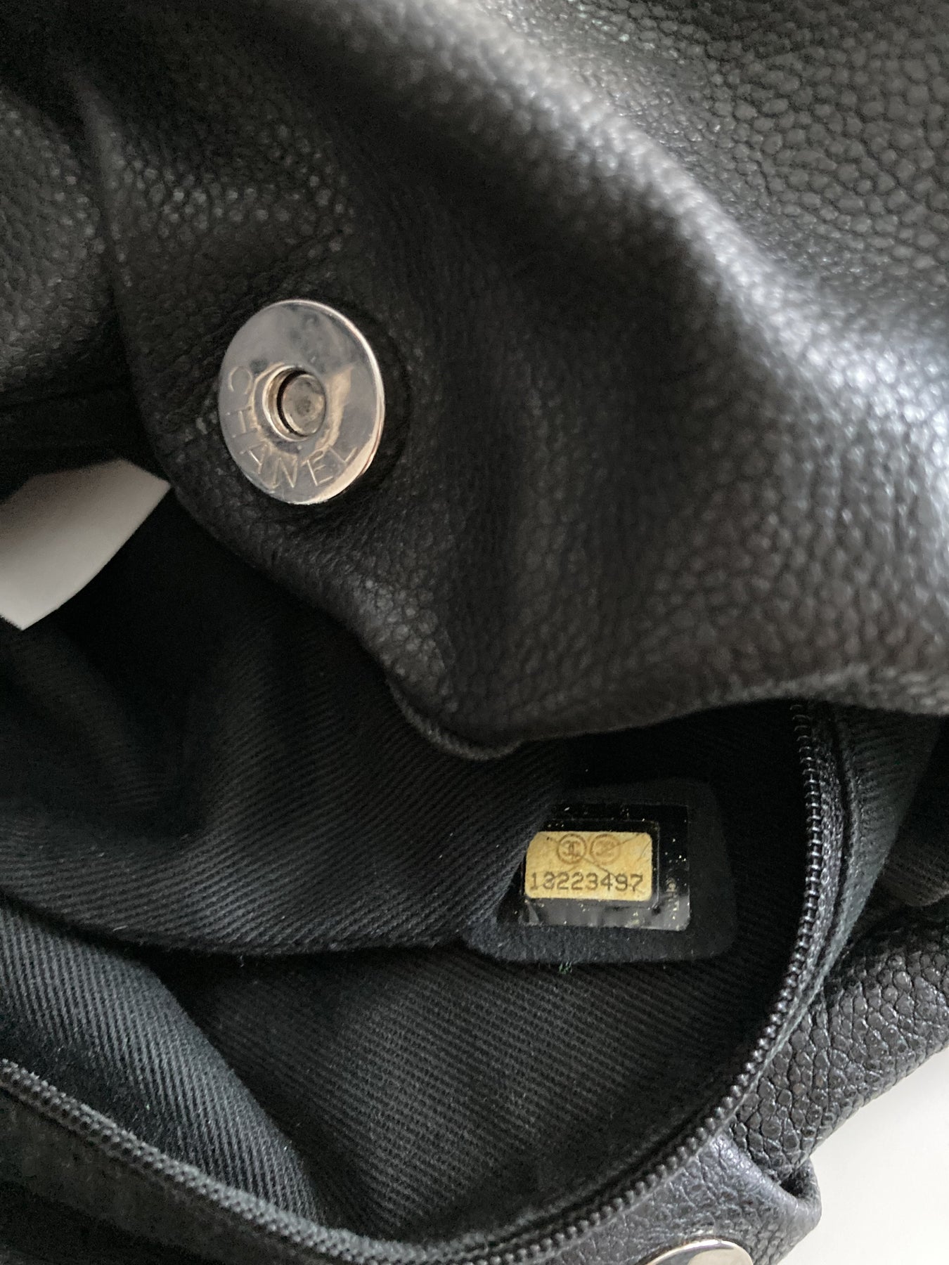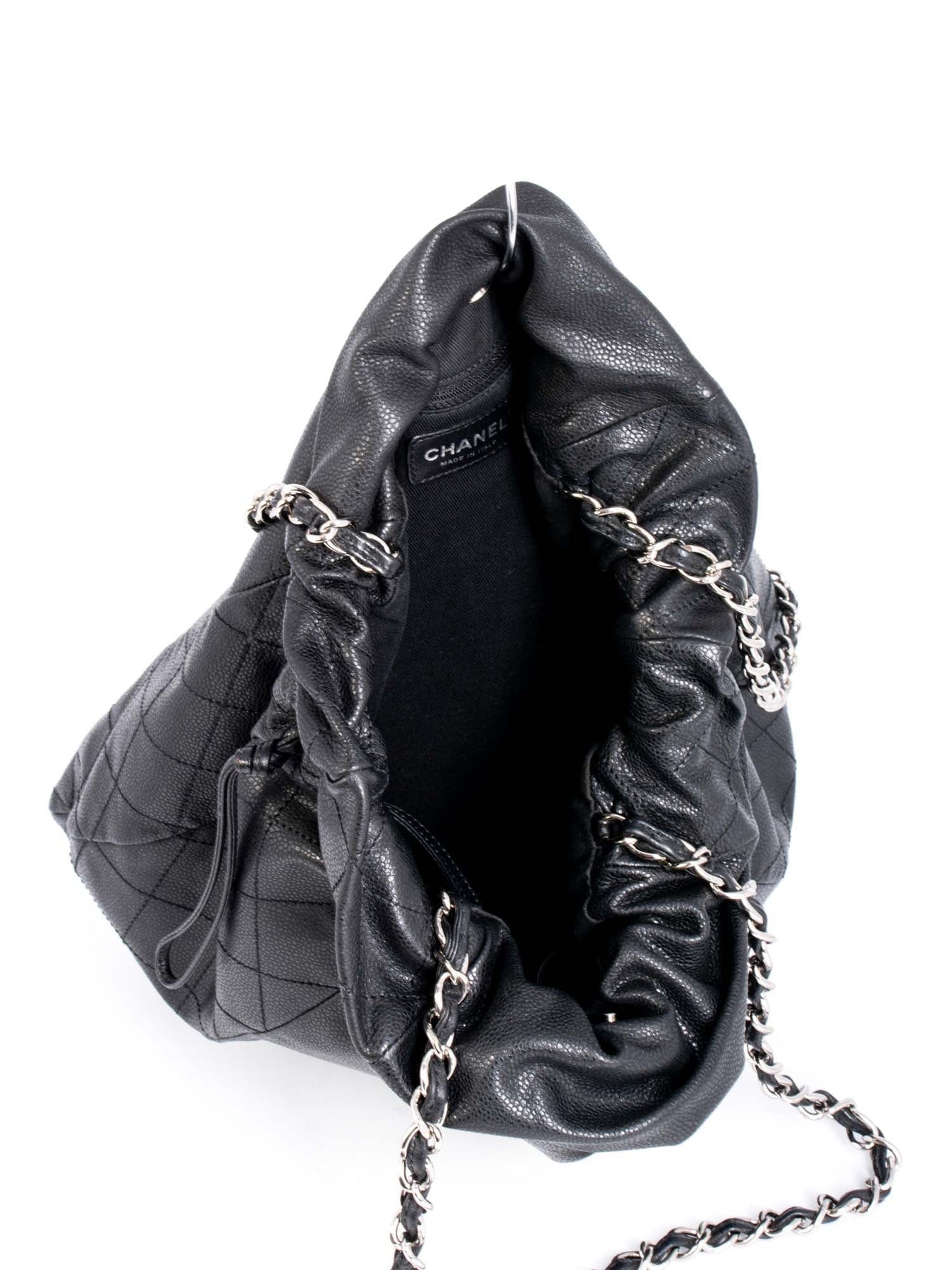 Chanel Large CC Logo Bag or . This bag is in shiny black quilted caviar leather with a stitched CC logo and silver hardware. It features two chain link handles, magnetic snap closure, one interior slip pocket and one interior zipped pocket.