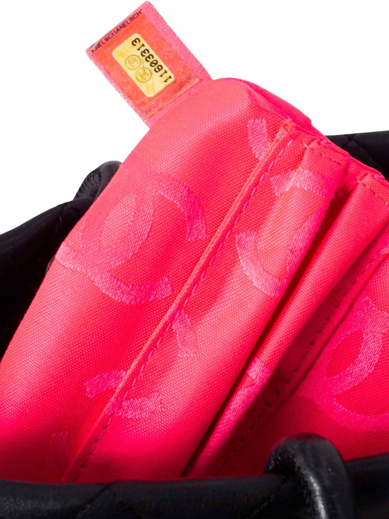 Chanel Bucket Bag or . This Chanel bag is in black quilted lambskin leather from their signature "Cambon" collection, featuring a prominent CC logo in black patent leather, back open pocket and top zipper closure. The interior is lined in hot pink canvas to compliment the exterior.