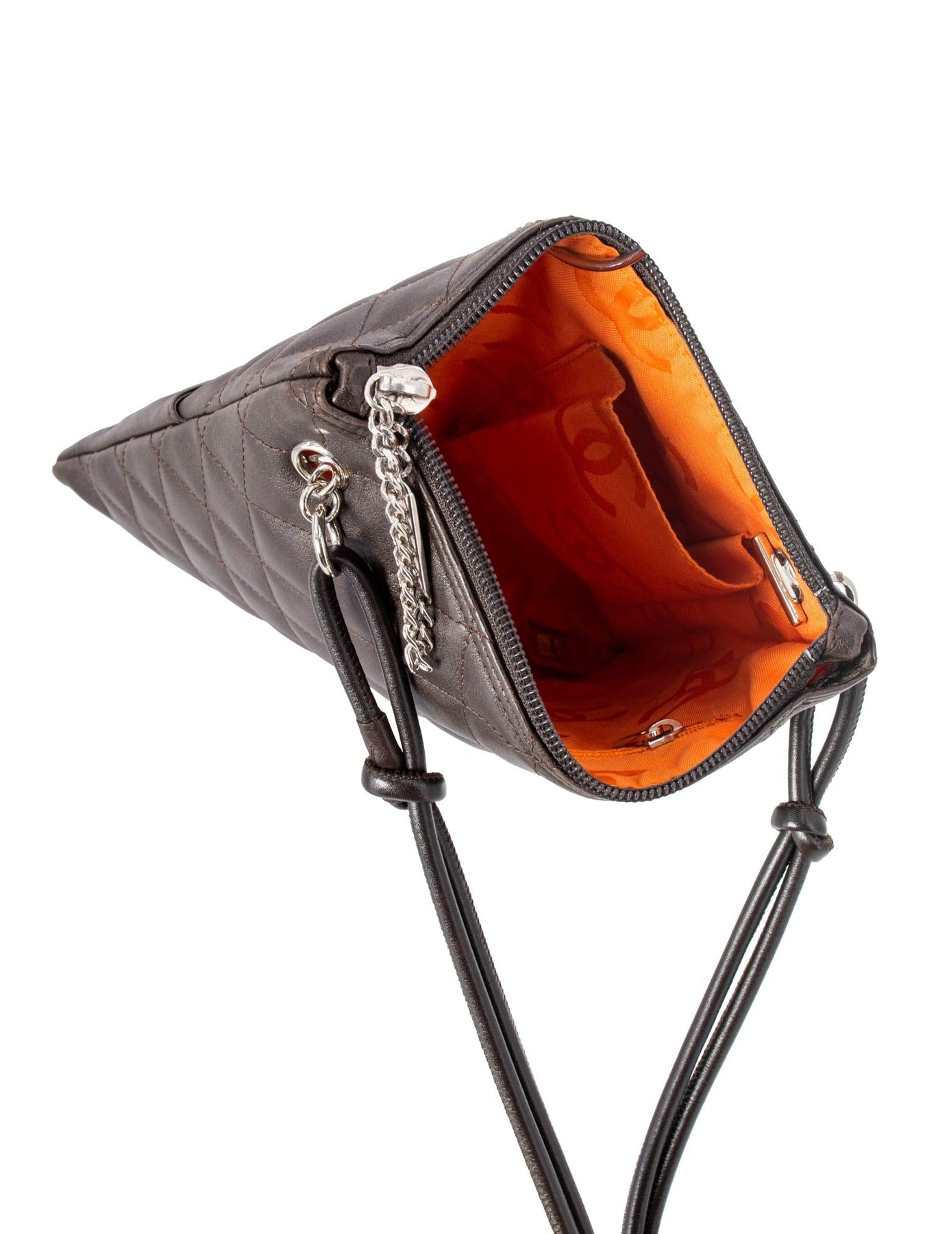 Chanel Quilted Leather Cambon Messenger Bag or . This Chanel bag is in brown quilted lambskin leather from their signature "Cambon" collection, featuring a prominent CC logo on the front in brown patent leather. This bag has a top zipper opening and dual shoulder strap. The interior is lined in orange CC logo fabric, and two interior pockets.