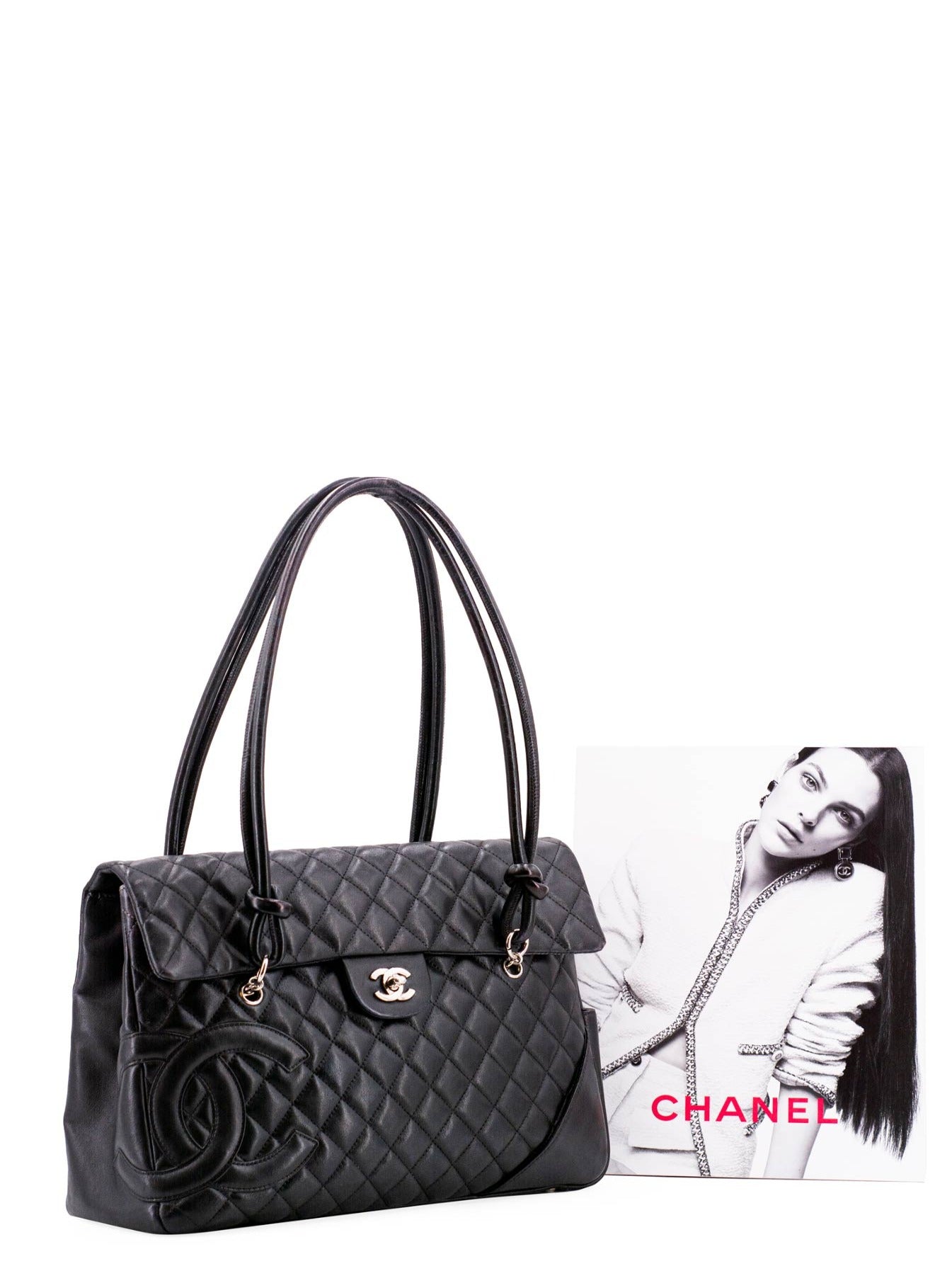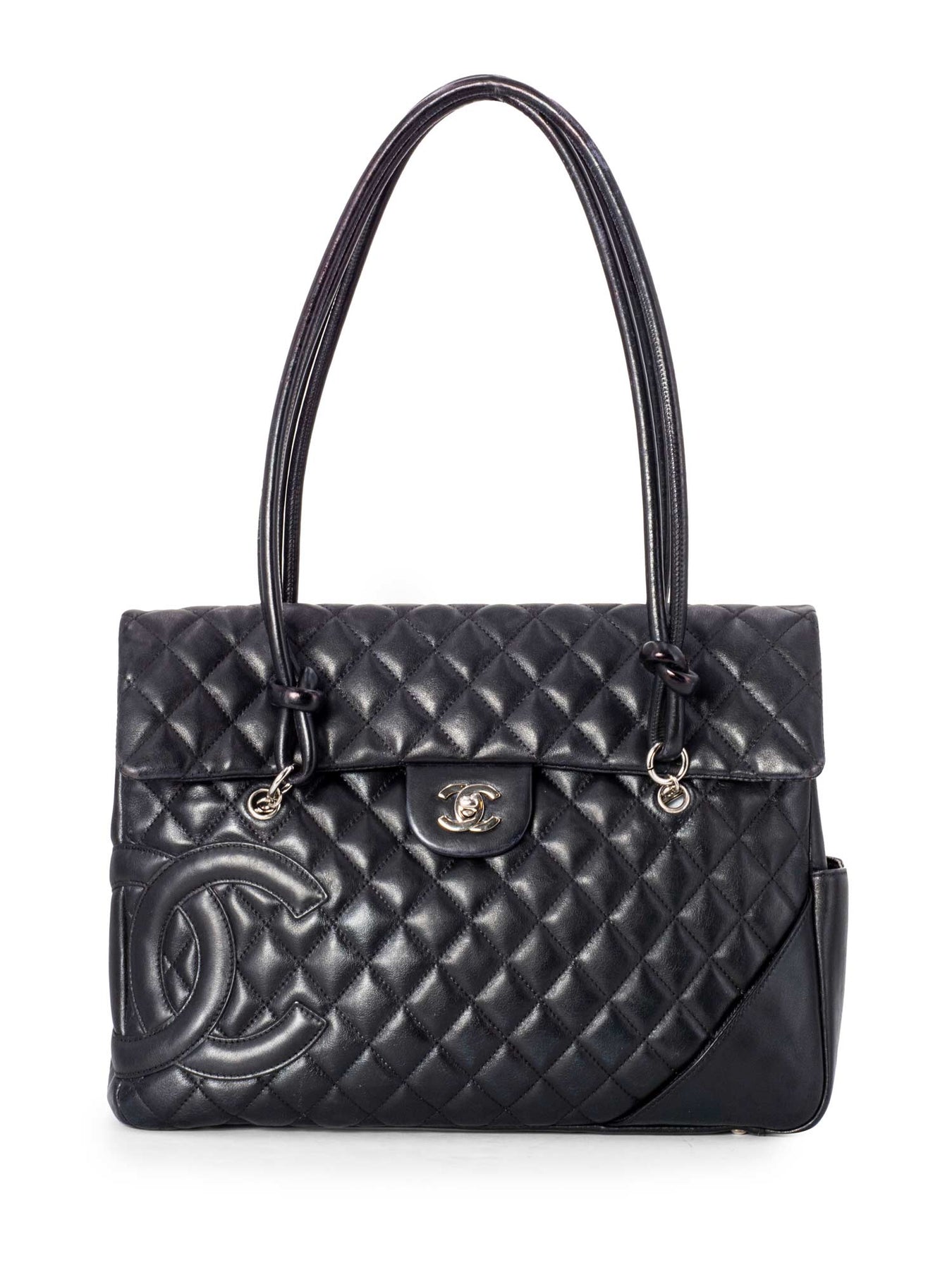 Chanel Maxi Flap Bag or . This Chanel bag is in black quilted leather with silver-toned hardware, front CC logo twist closure, two exterior pockets, one interior zip pocket, one open pocket, and black CC logo satin interior.