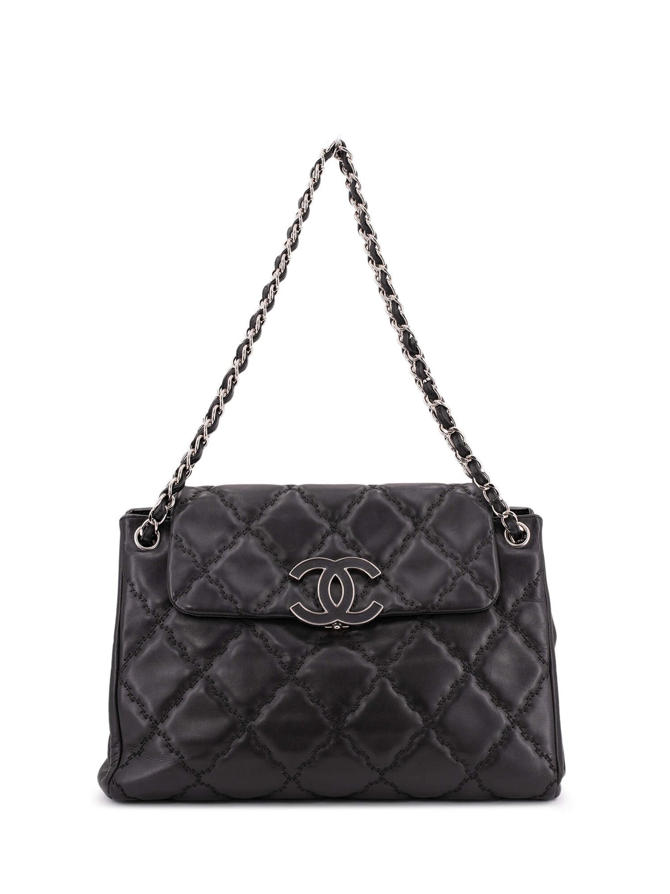 CHANEL CC Logo Flap Bag or . This bag is made in black quilted leather with silver-toned hardware and features two interior pockets and a matte CC logo closure on the front side.