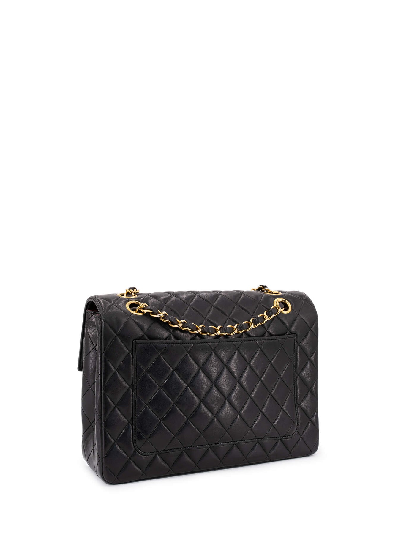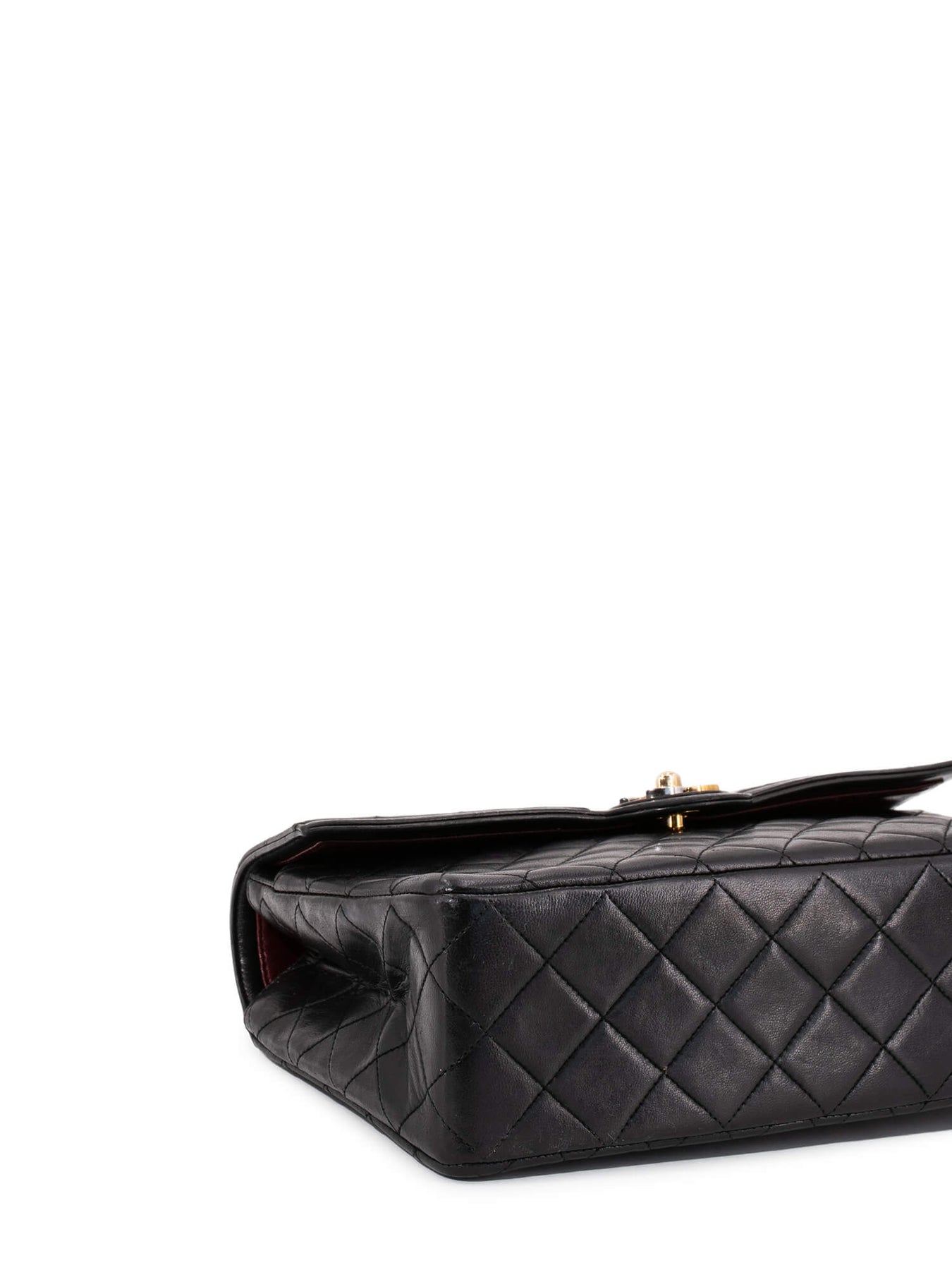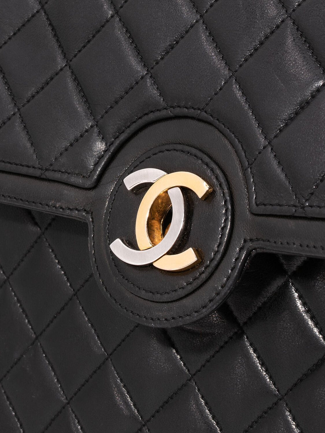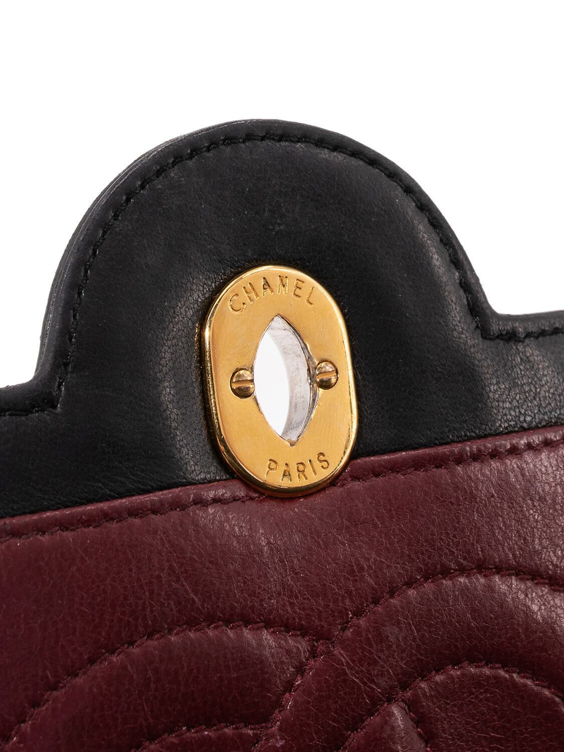 Chanel CC Logo Medium Flap Bag or . This Chanel bag is in black quilted lambskin leather with gold and silver hardware. This vintage Chanel bag features a single flap with interlocking two toned CC logo, turn lock closure, leather woven gold tone double chain, stitched CC Logo on the interior flap with one zipped pocket, and burgundy interior with slip and zipped pockets.