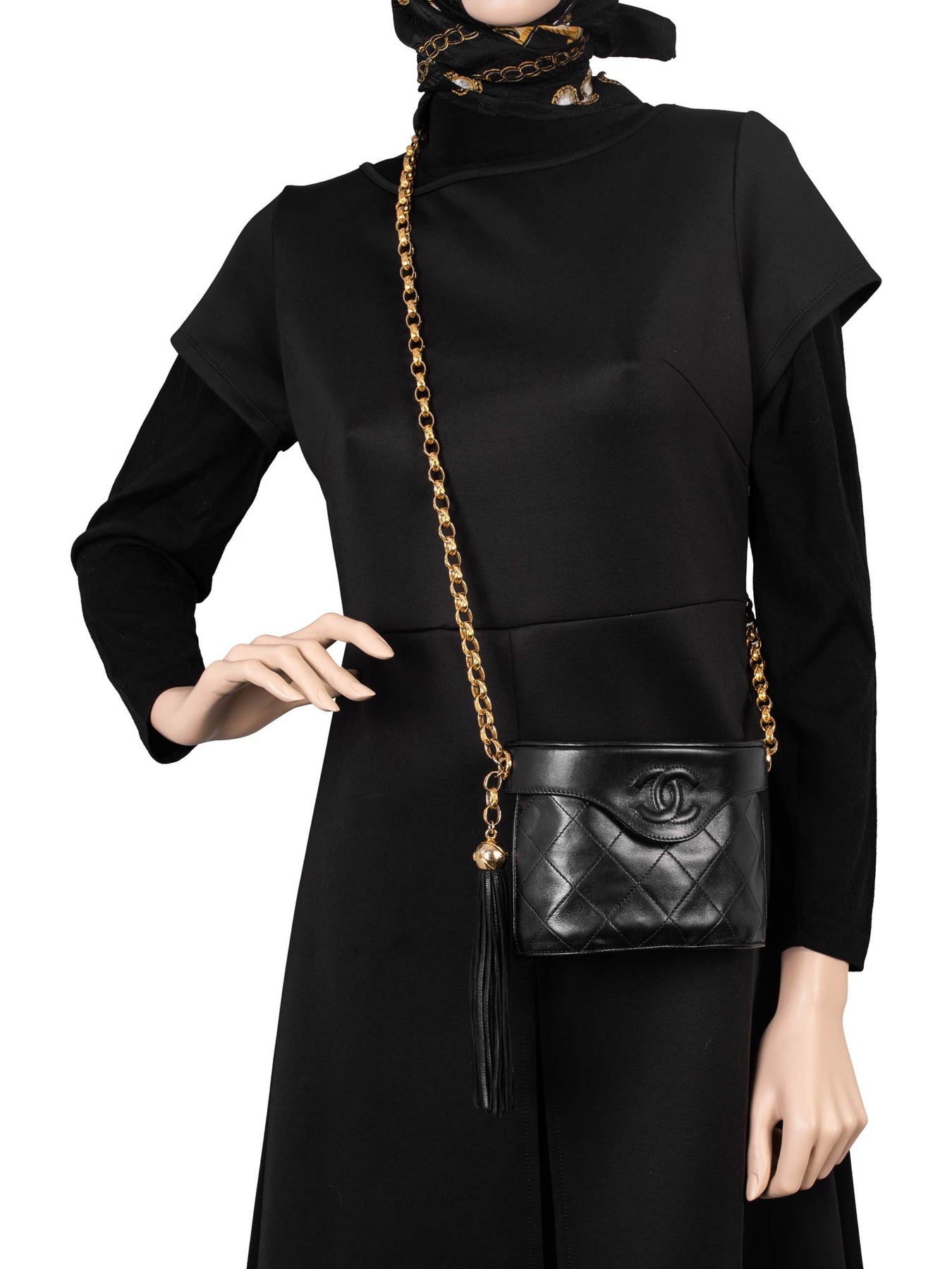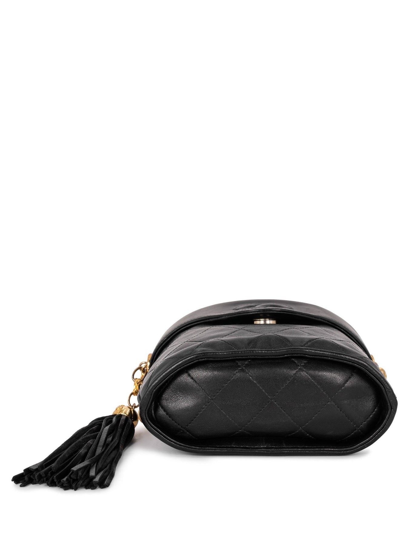 Chanel Tassel Mini Bucket Bag or . This vintage bag is in dark navy blue leather with gold hardware. It features an embroidered CC logo, click clock closure, gold quilted chain strap, navy blue leather tassel, and a navy blue with one zipped pocket. A perfect bag to complete any evening look!