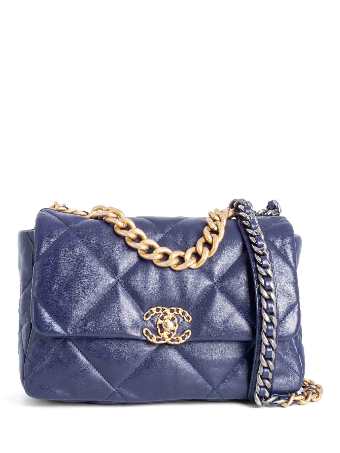 Chanel 19 Flap Messenger Bag or . It is in navy blue lambskin leather with gold and silver hardware. It features a large exterior patch pocket, navy leather lining, two interior patch pockets, and a mademoiselle turn lock closure.