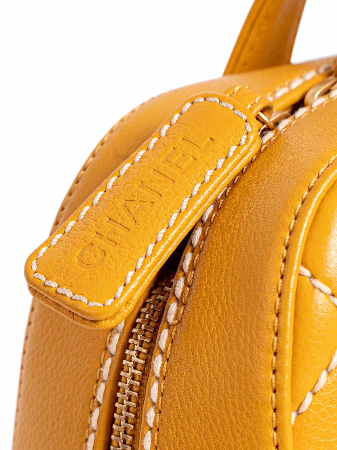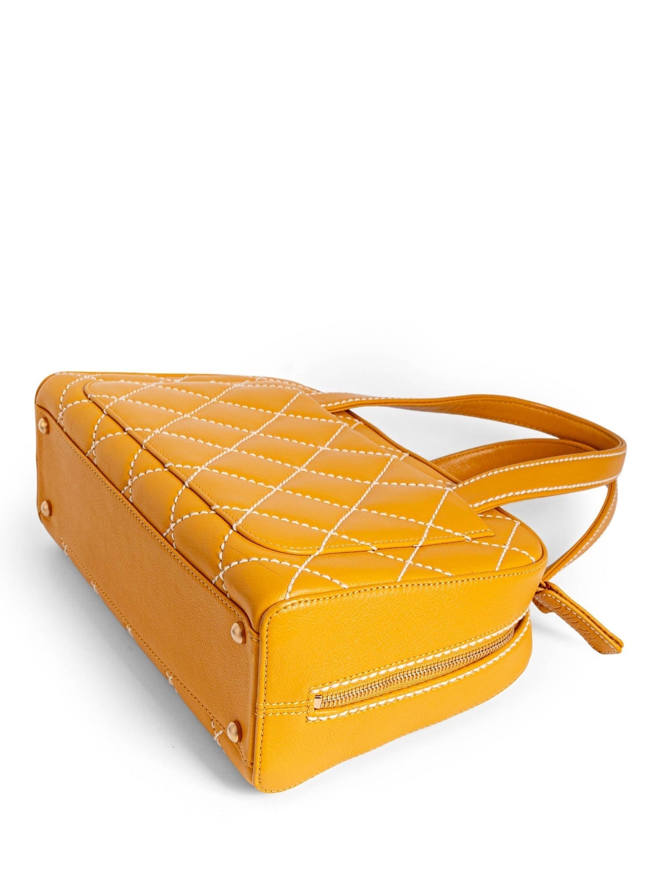 Chanel Top Handle Bag or . This bag is in yellow quilted calfskin leather with gold tone hardware. It features dual flat top handles, protective feet at base, white contrast stitching throughout, single patch pocket at back, CC logo embellishment, beige jacquard lining, dual interior pockets; one with zipper and one patch pocket, and zip around closure.