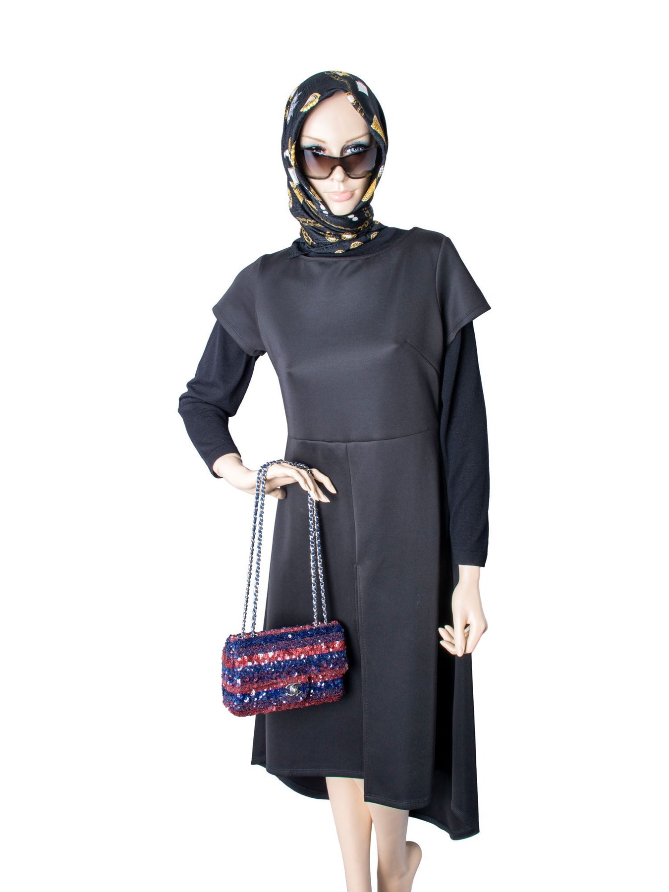 CHANEL CC Logo Sequin Rectangular Flap Bag or . It is in red and blue sequins with silver tone hardware. It features a frontal flap with silver CC logo, intertwined blue leather and silver dual chains, and the bag opens to an all blue leather interior with a zipper pocket.