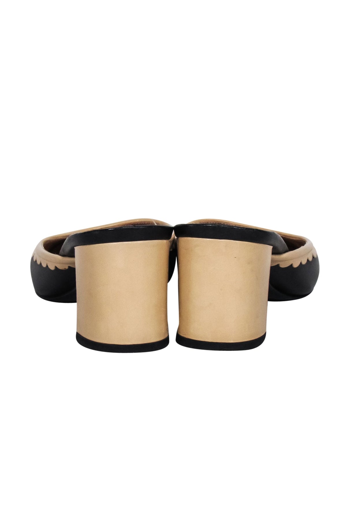 Get ready to elevate your work attire with these timeless and classic Chanel leather mules! The beige and black leather adds a touch of sophistication while the closed-toe design offers both style and comfort. These shoes are a must-have for any fashion-forward professional, featuring a unique scallop trim detail and perforated logo toe.  They're also perfect for post-work happy hours!