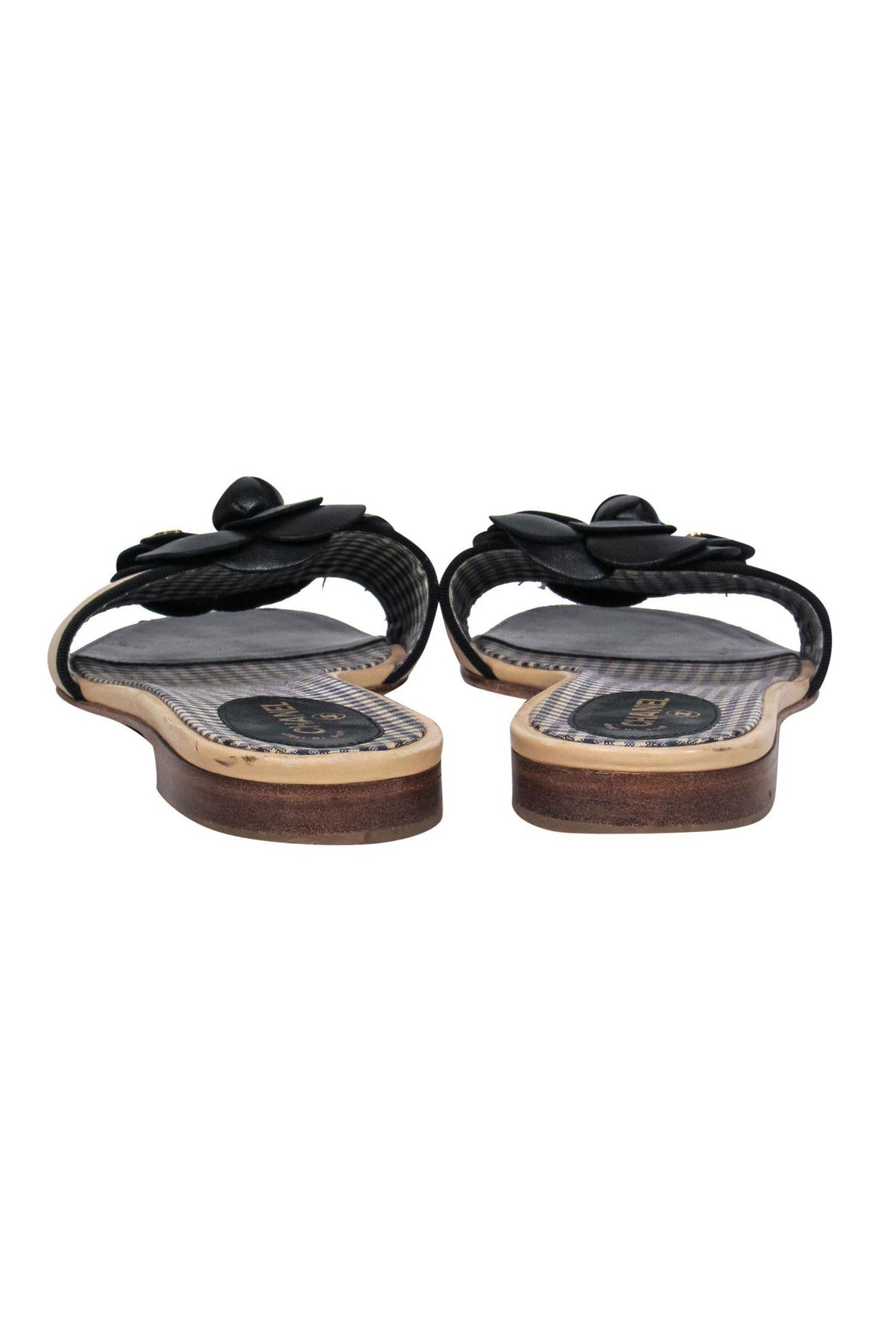Top Quality Chanel - Beige Leather "Camilla" Slide Sandals w/ Rosette Sz 8