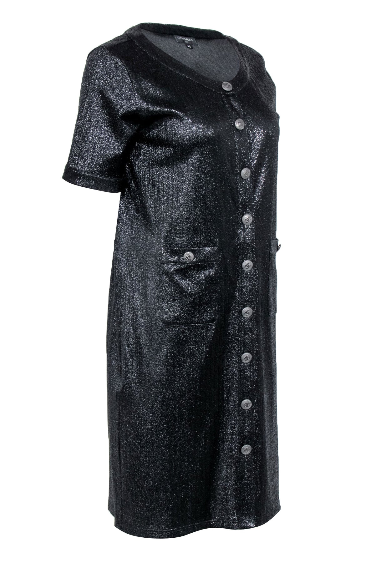 Introducing your new wardrobe staple - this shirt dress from Chanel, designed by Karl Lagerfeld from the Spring 2018 collection! It's the perfect mix of edgy and sophisticated, with its black metallic fabric and button-up front. Step into spring the perfect way, rocking this piece with mini bag and strappy heels – you’ll be the queen of the streets!