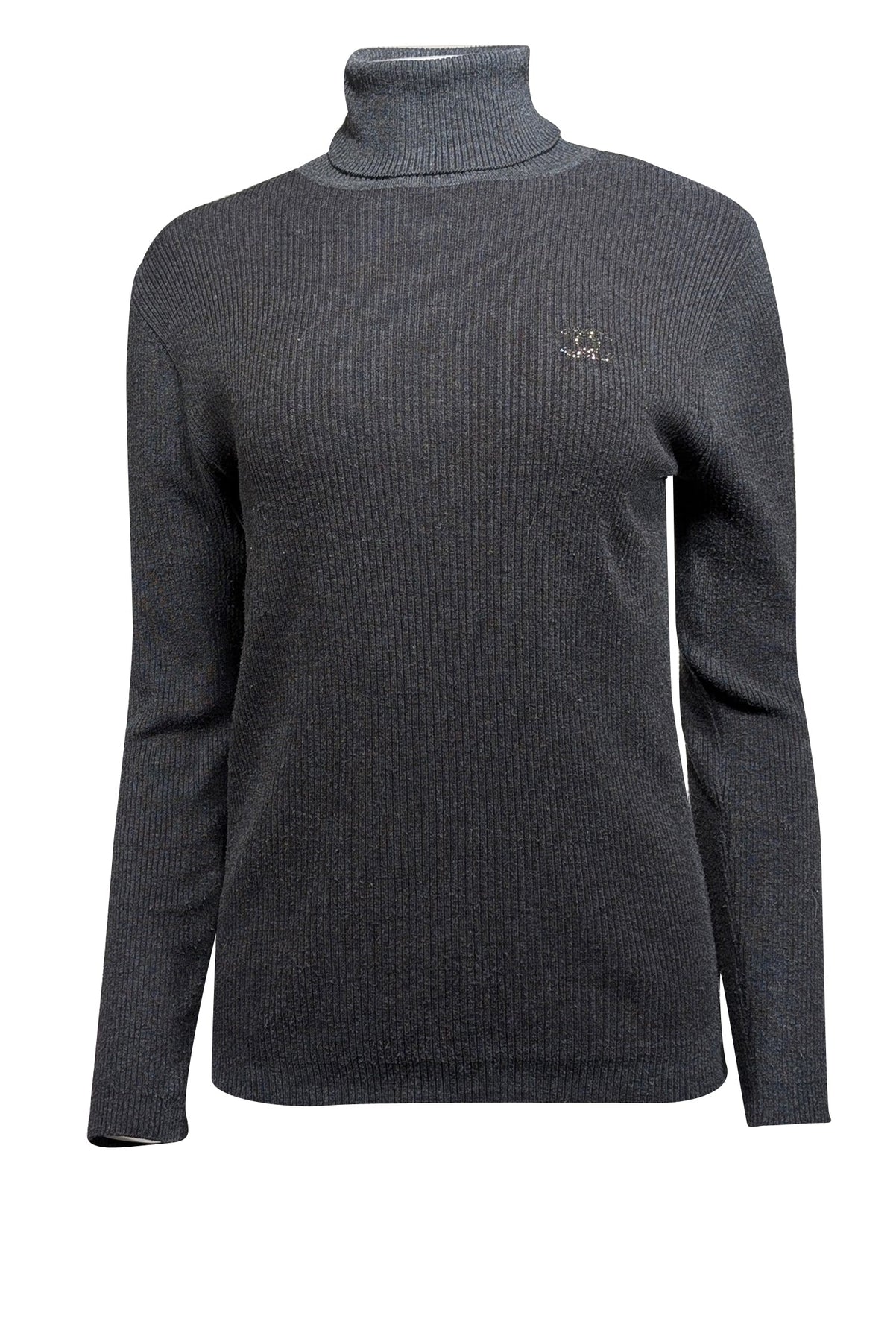 Stay warm and stylish with this Chanel grey ribbed knit turtle neck sweater. It features a playful rhinestone logo on the front bust and a unique grey back detail. Perfect for the cold weather, this sweater is both cute and cozy. Don't sacrifice fashion for warmth!