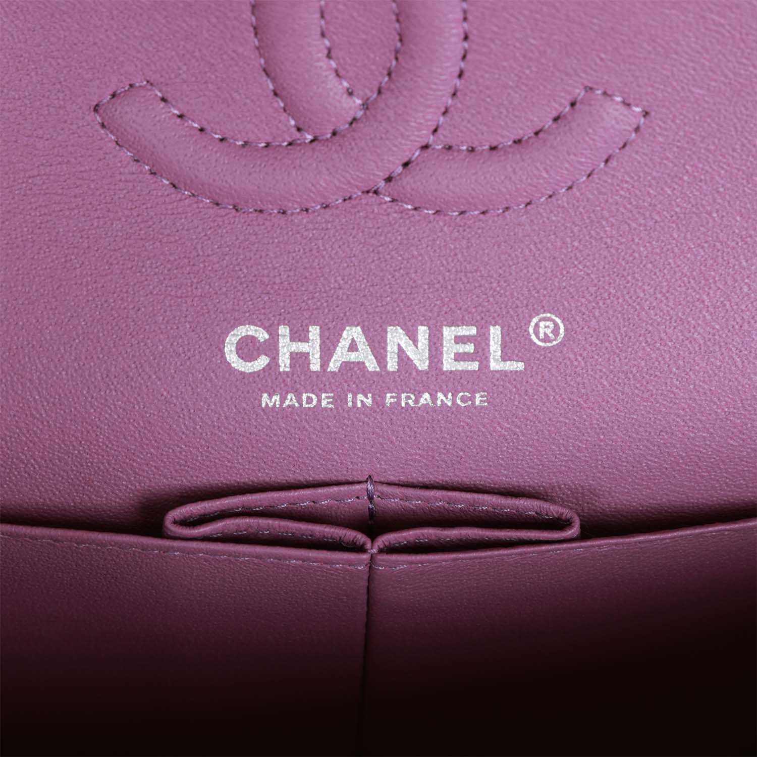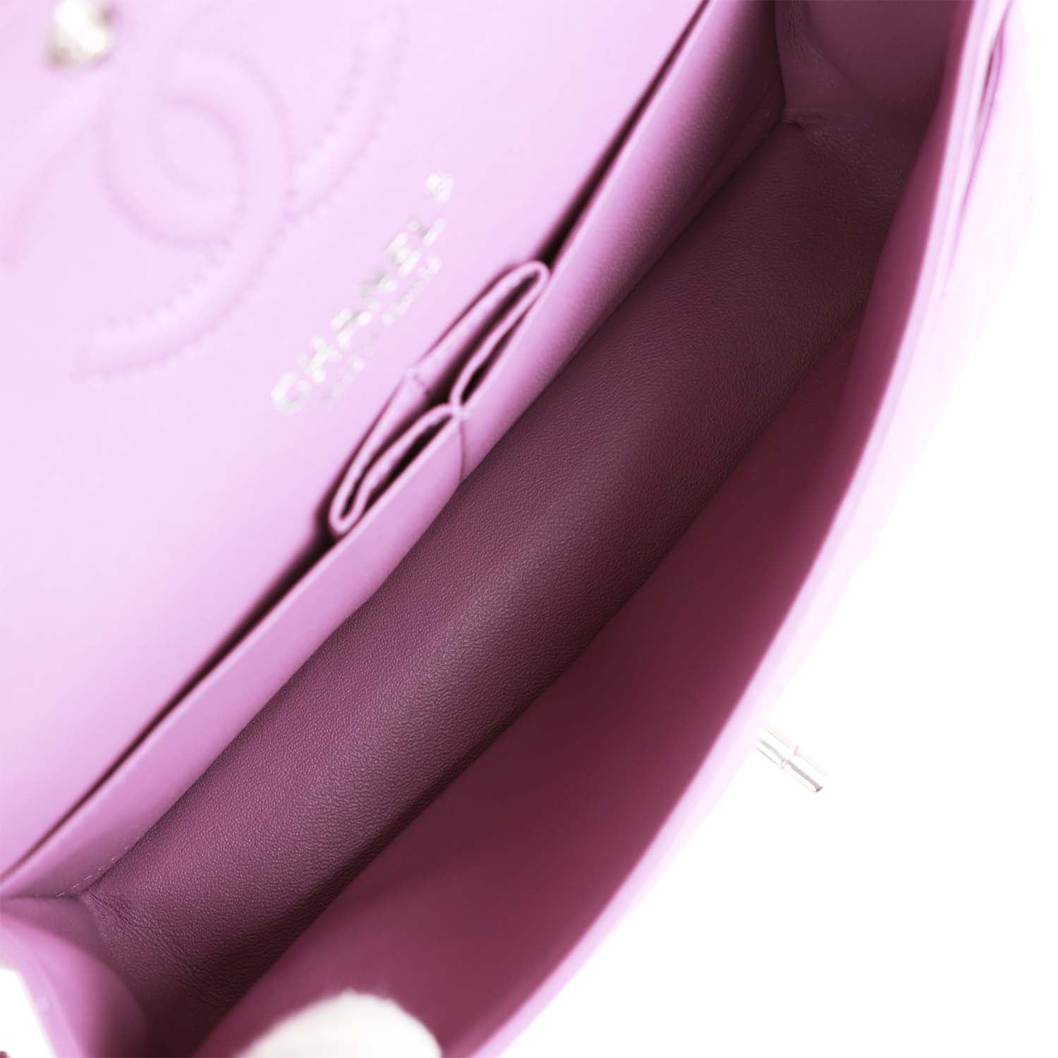 This Small Classic Double Flap bag is in Purple lambskin leather with silver tone hardware and features a front flap with signature CC turnlock closure, half moon back pocket, and adjustable interwoven silver tone chain link and purple leather shoulder strap.