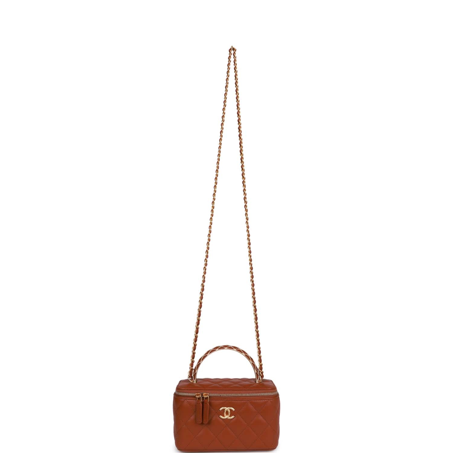 This Small Top Handle Vanity Case is in Brown lambskin with brushed gold hardware, lattice metal work design over the top handle, a gold rope textured CC affixed to the front, a CC embroidered bottom, and an interwoven brown leather and gold chain shoulder/crossbody strap.