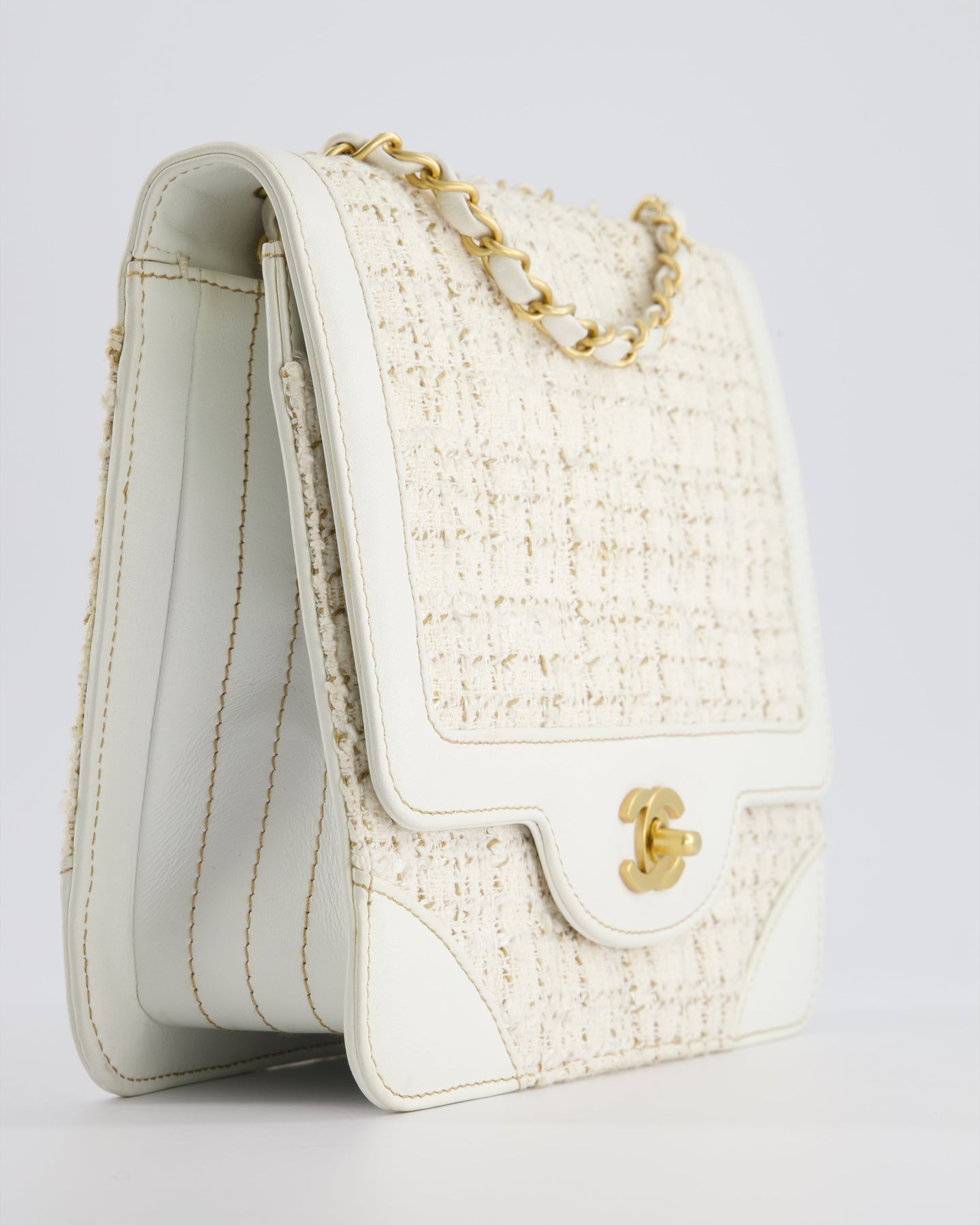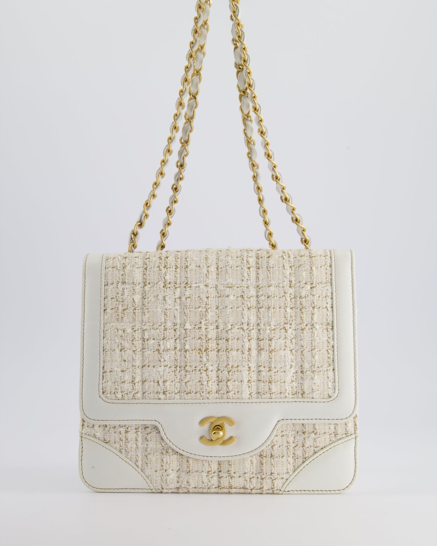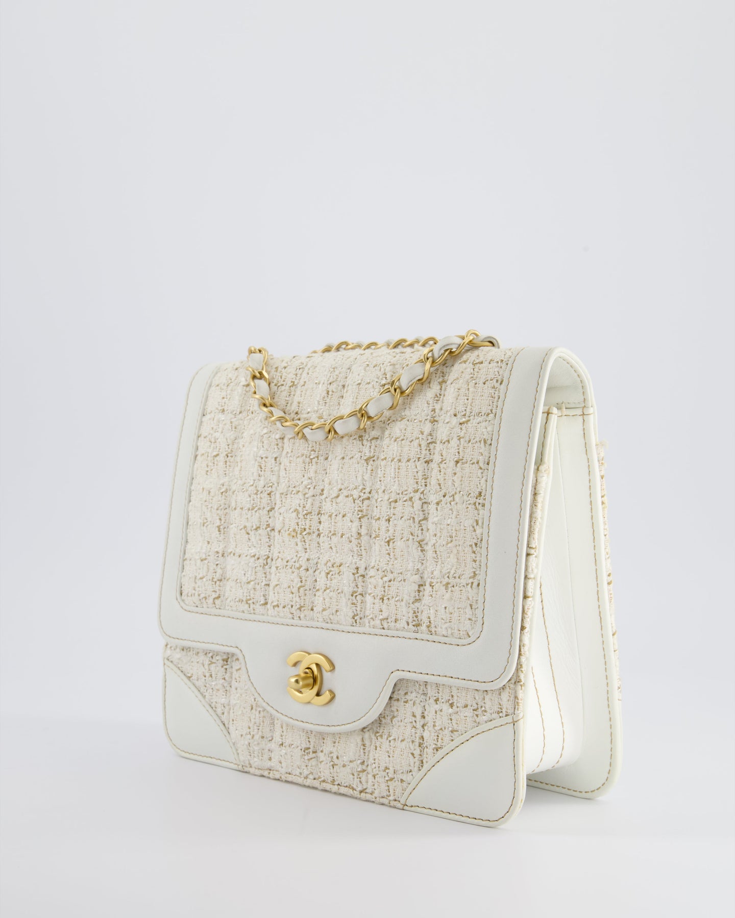 Chanel Small White Tweed and Aged Calfskin Flap Bag with Brushed Gold Hardware