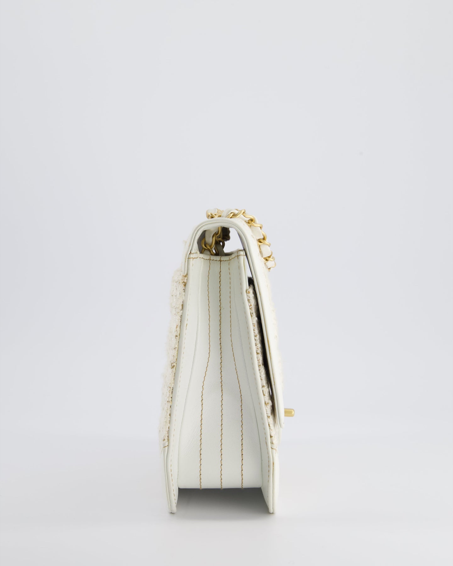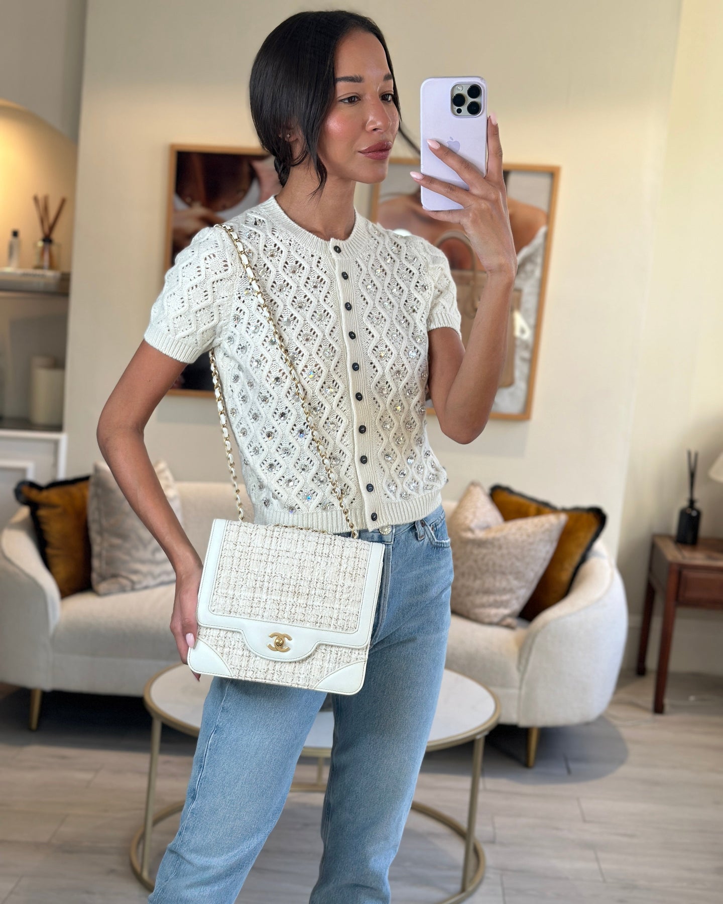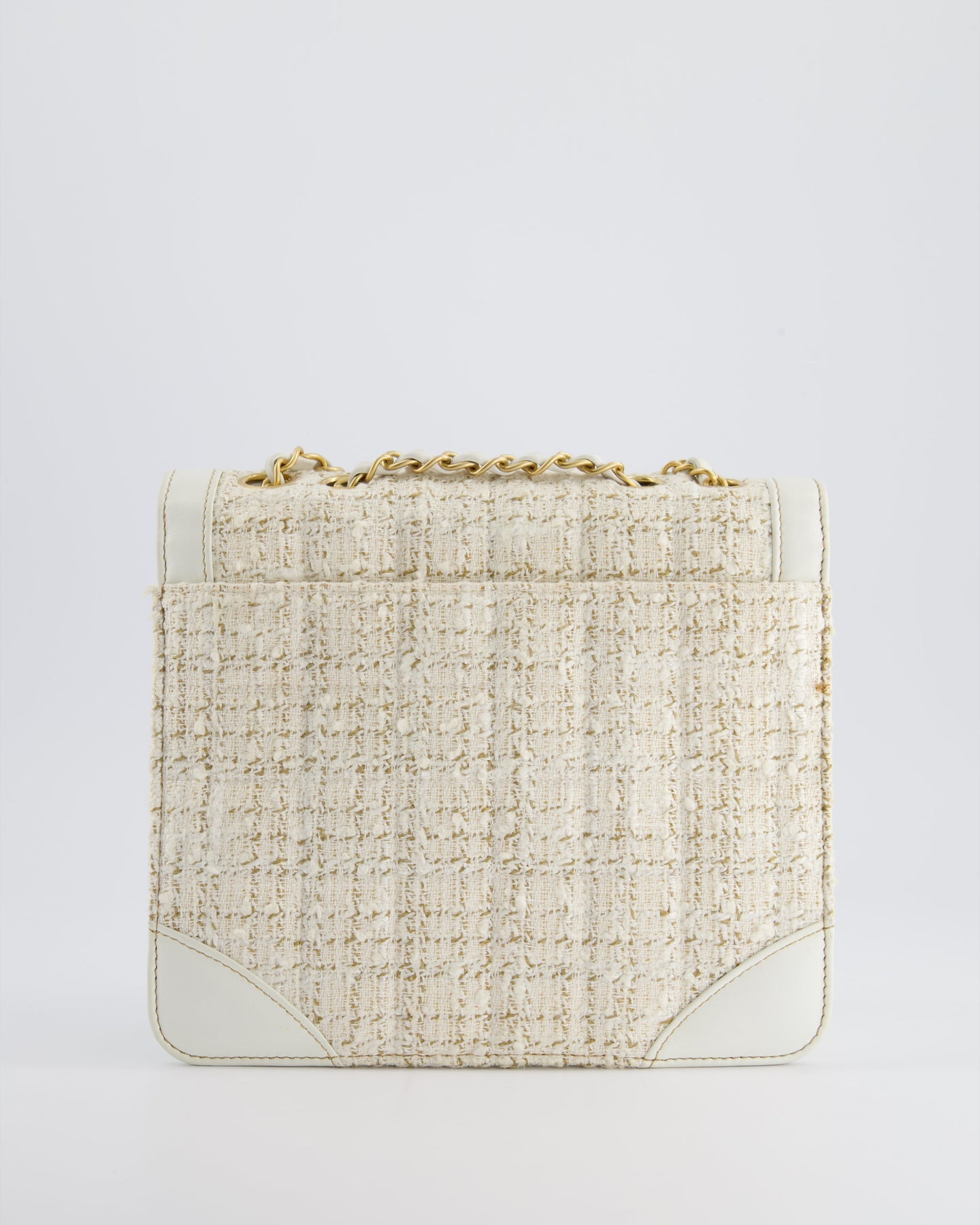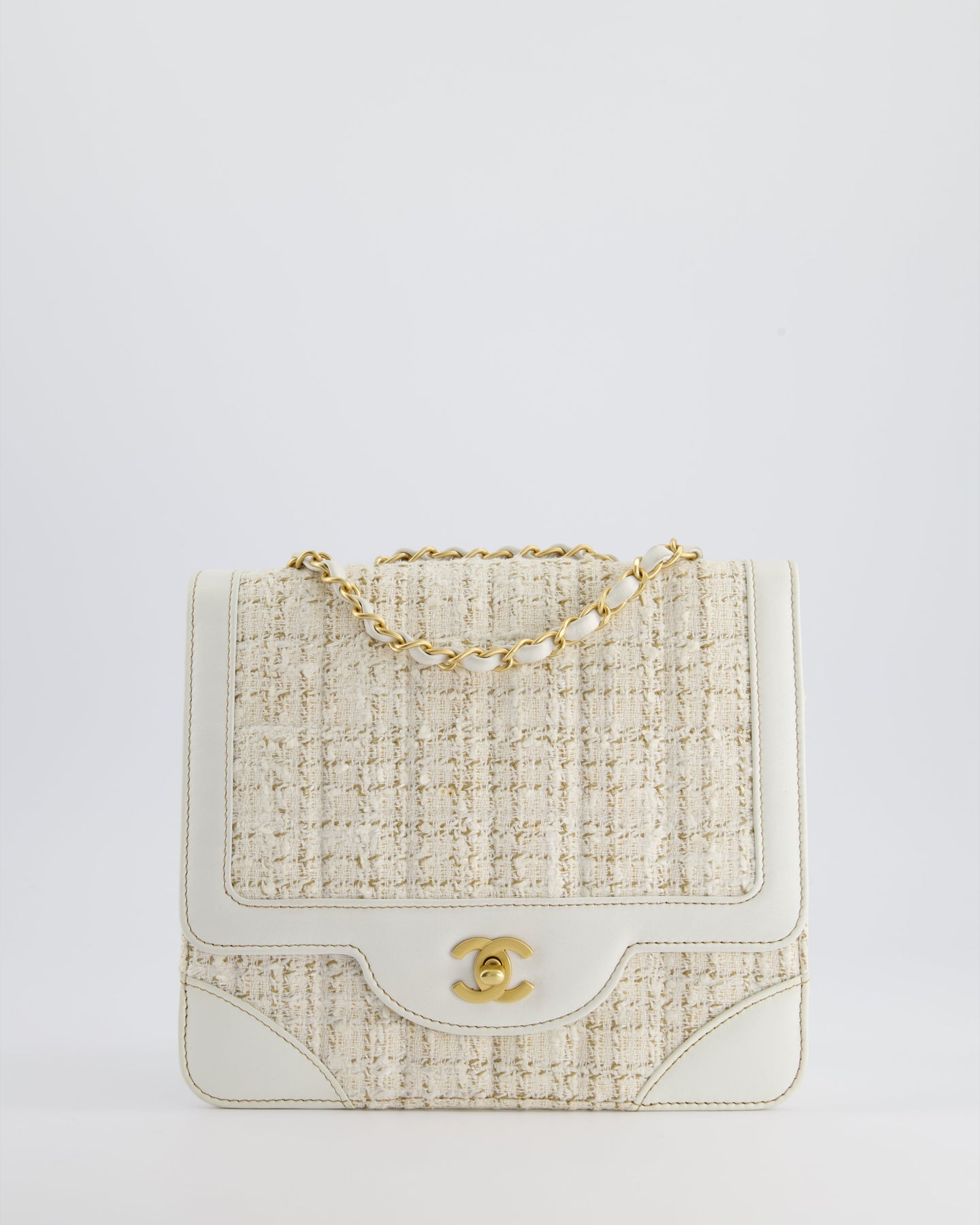 Chanel Small White Tweed and Aged Calfskin Flap Bag with Brushed Gold Hardware