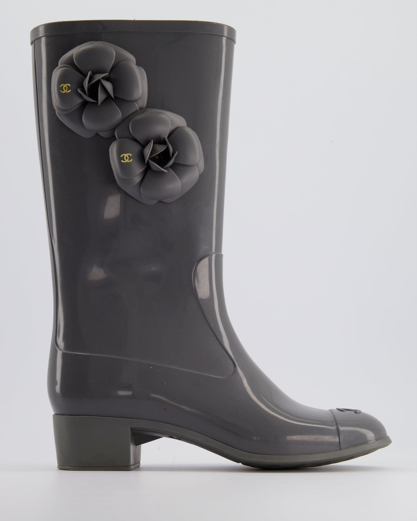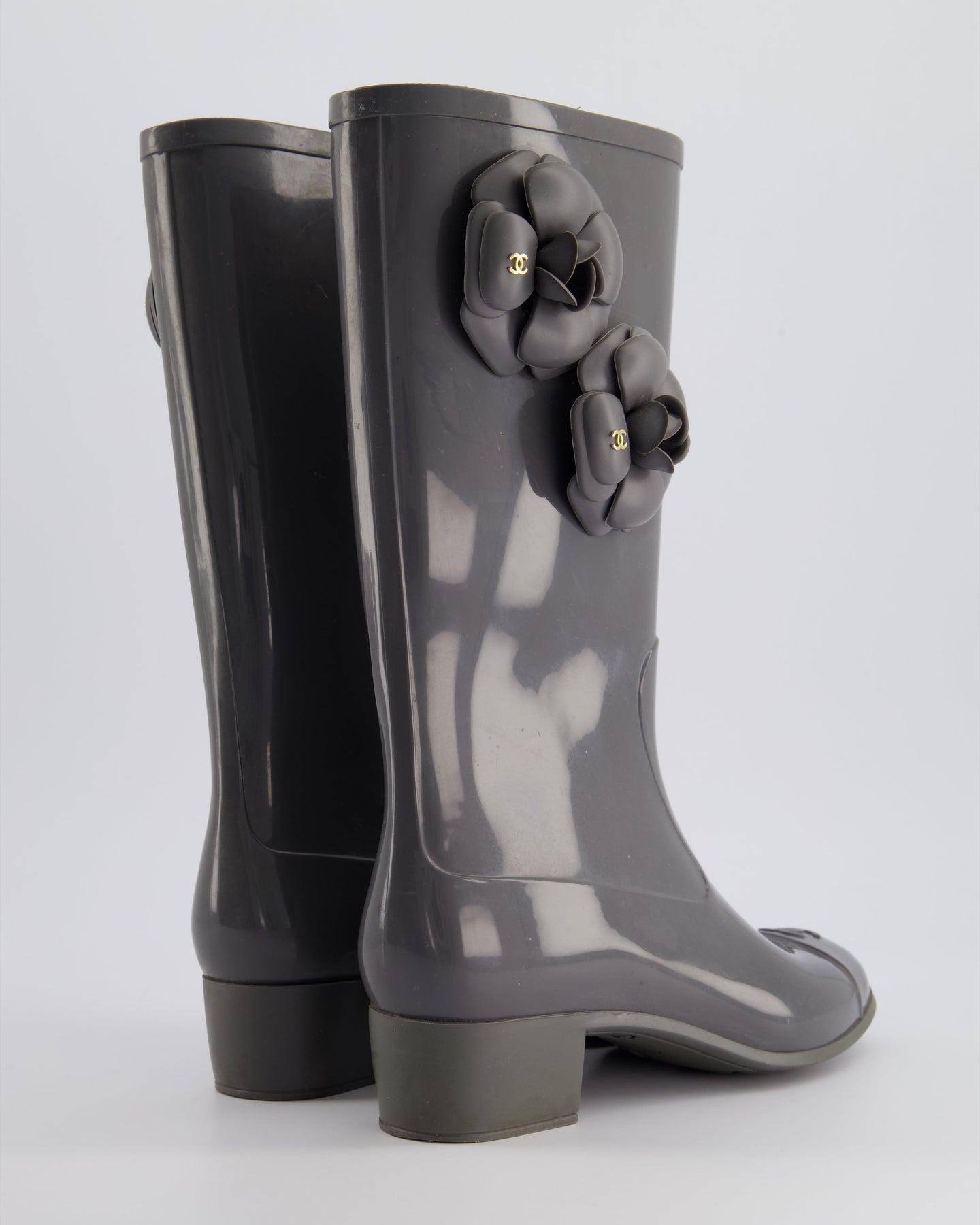 Chanel Stone Grey Rubber Rain Boots with Camelia & CC Logo Detail Size EU 37