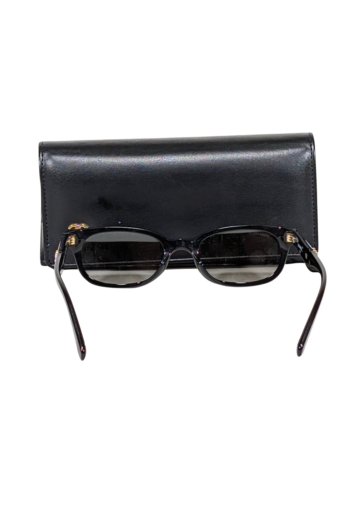 Elevate your style with these black slim sunglasses from Chanel featuring a reflective lens and interlocking rhinestone logo detail. Perfect for a girls' weekend in a denim maxi and platform sandals. These sunglasses are extra in the best way possible.