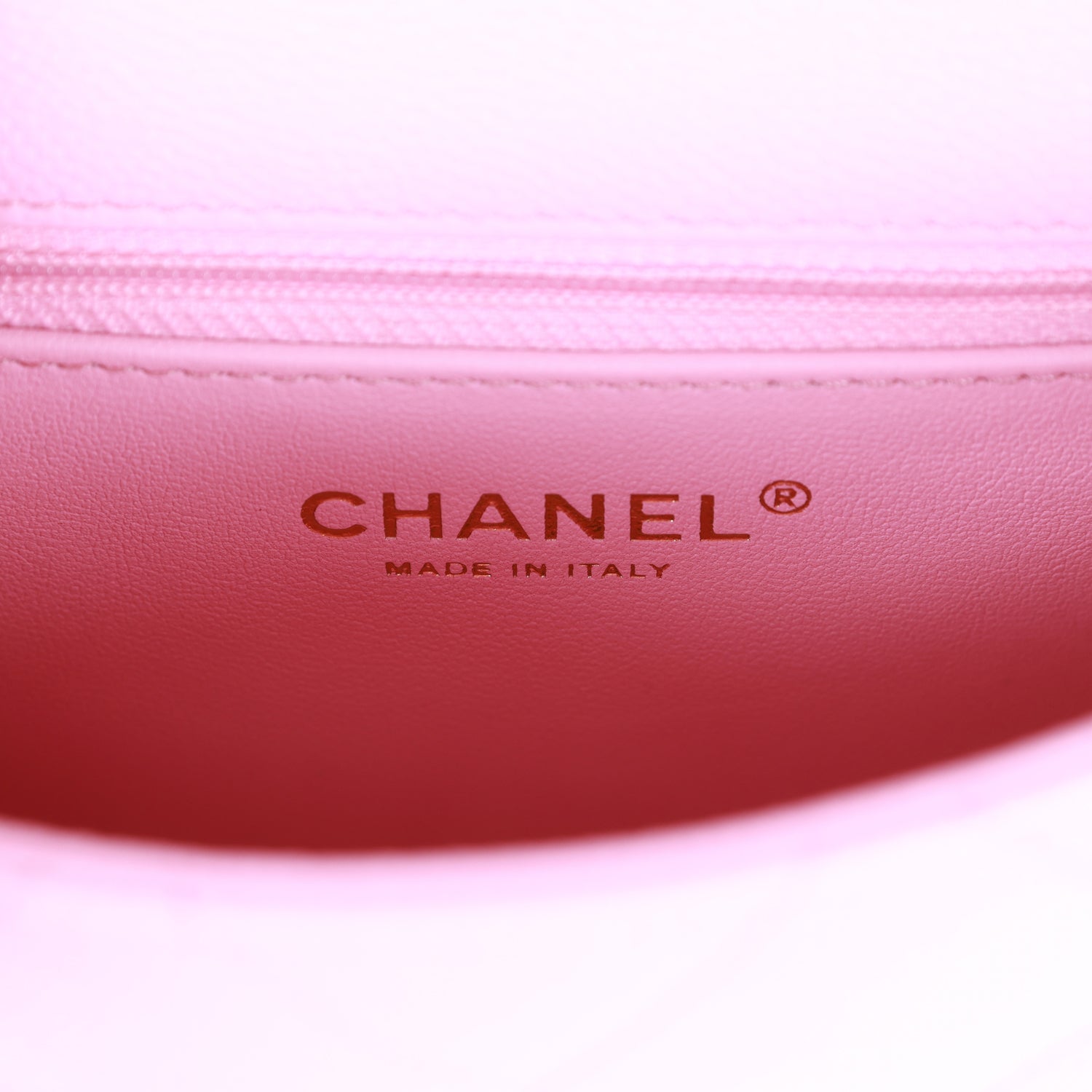 The interior is lined in pink leather and features one zip pocket on the rear wall with logo pull, one open pocket on the rear wall underneath zip pocket