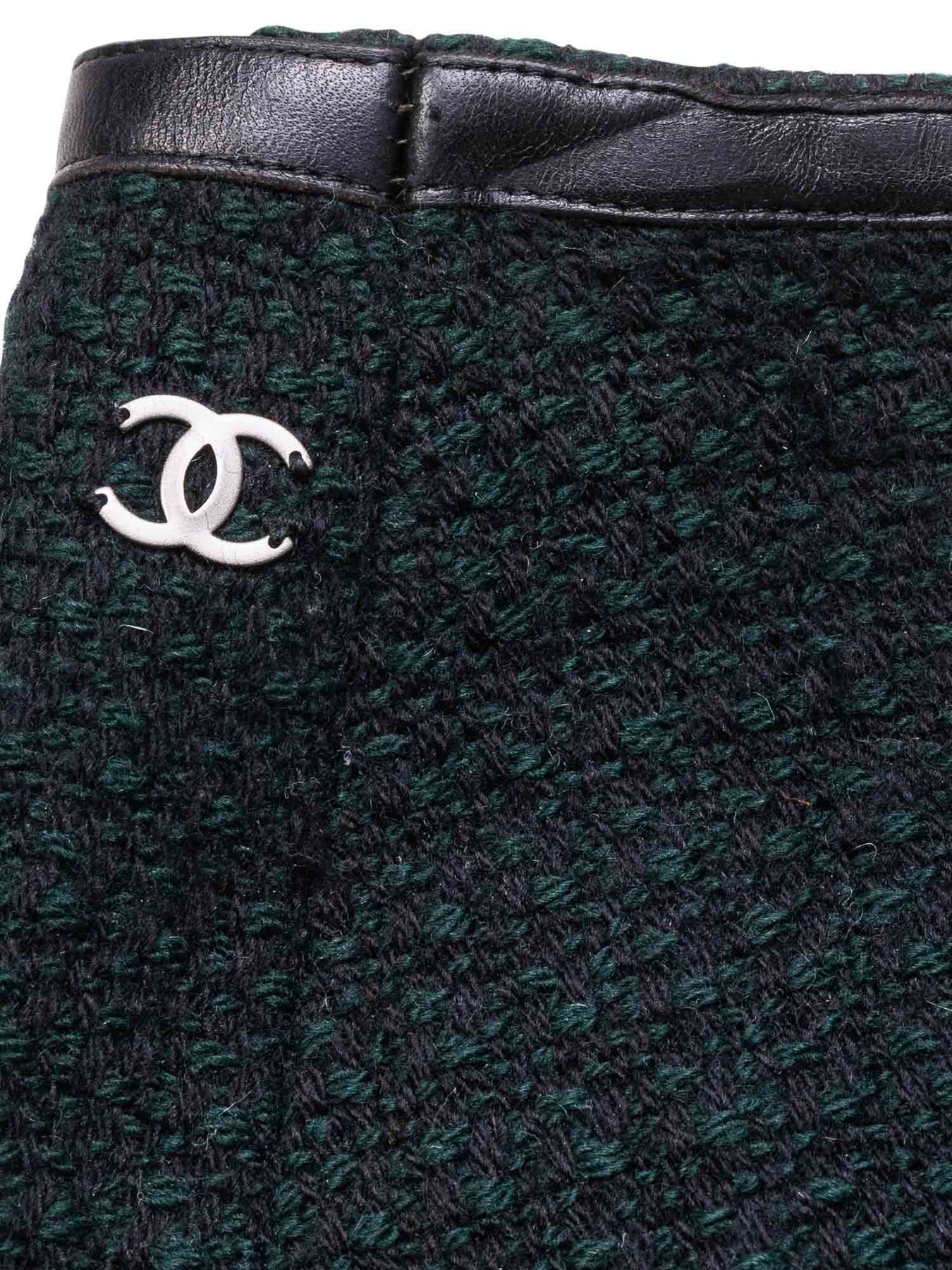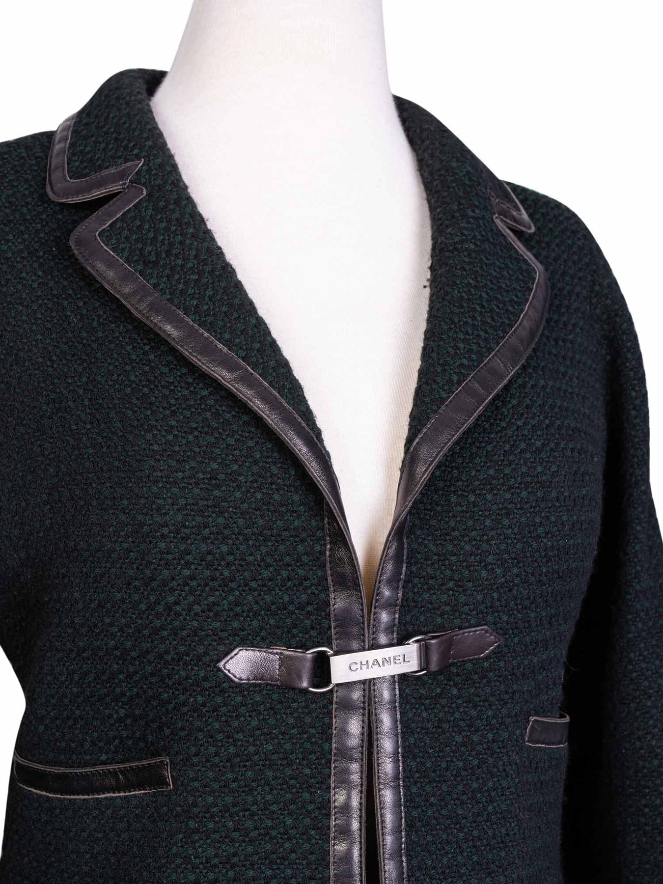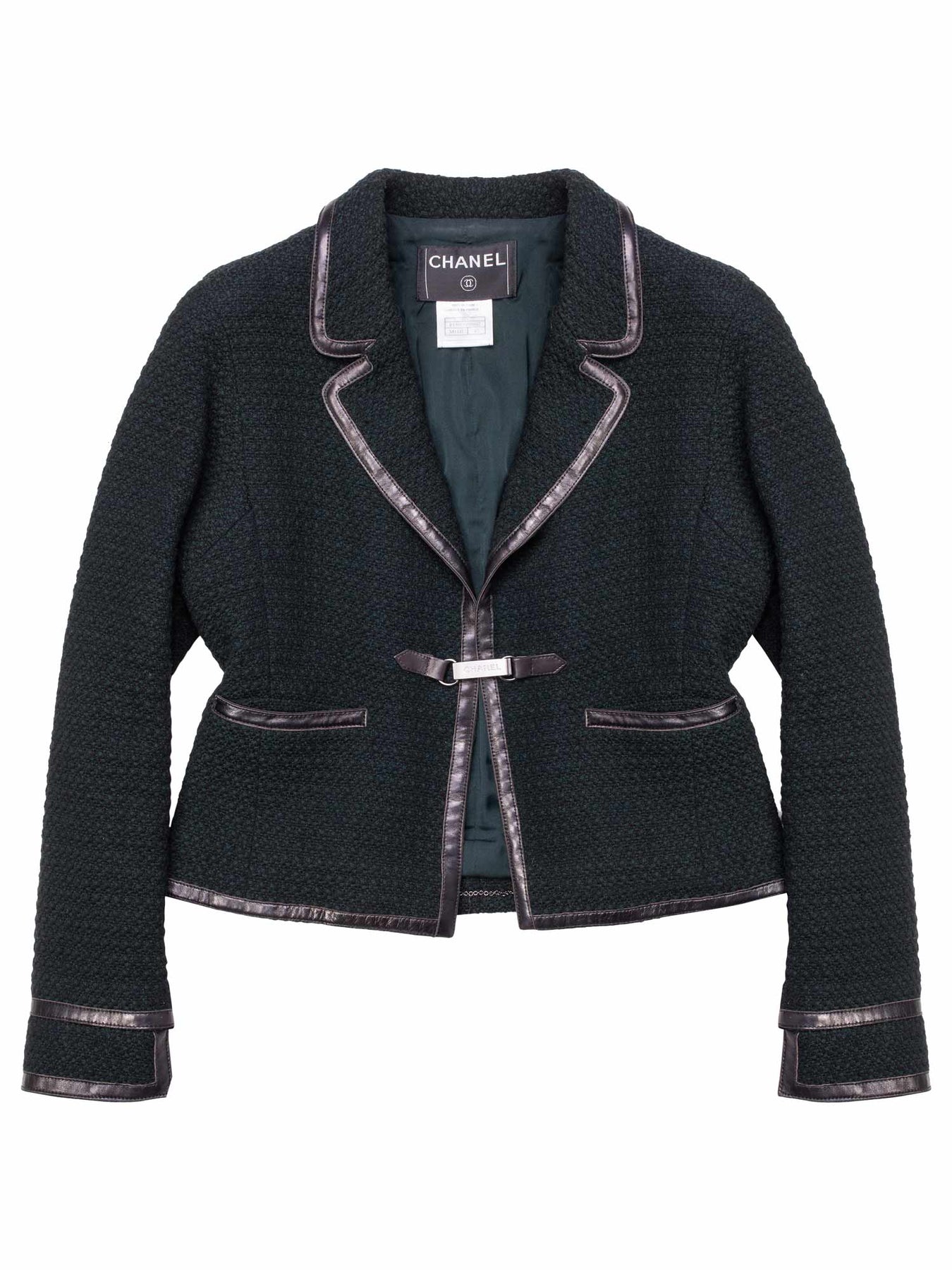 Chanel Skirt Suit Set or . This set, from the fall/winter 2000 collection is in forest green wool tweed with black leather trim. It features two frontal pockets, metal Chanel engraved clip closure, invisible zipped sleeves, and silk emerald green lining with interior silver chain trim. The skirt features leather trim and a green silk lining.
